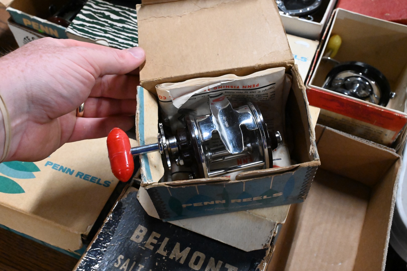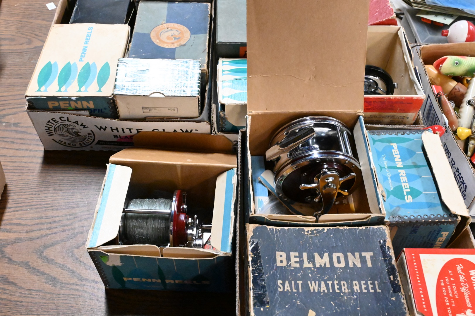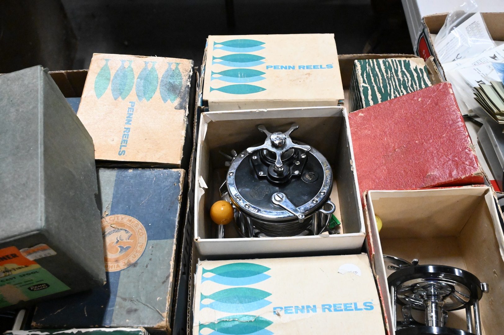 Approximately 18 Boxed Fishing Reels, brands include Penn, South Bend, Ocean City, Airex, along with others. Provenance: Estate of Peter Tillou, Litchfield, Connecticut.