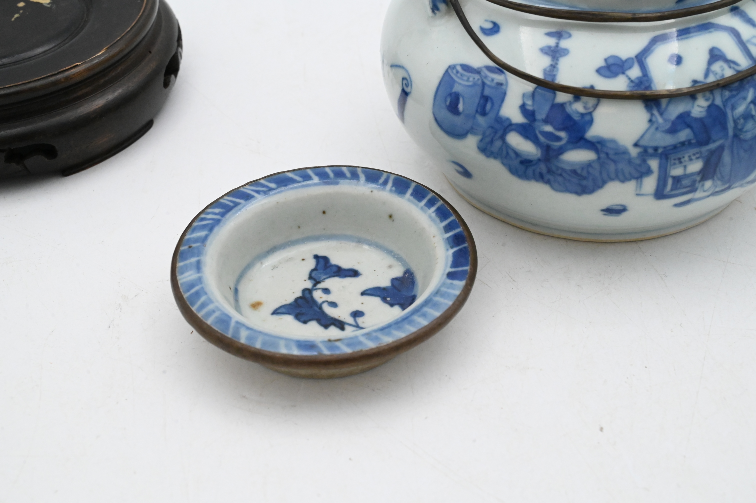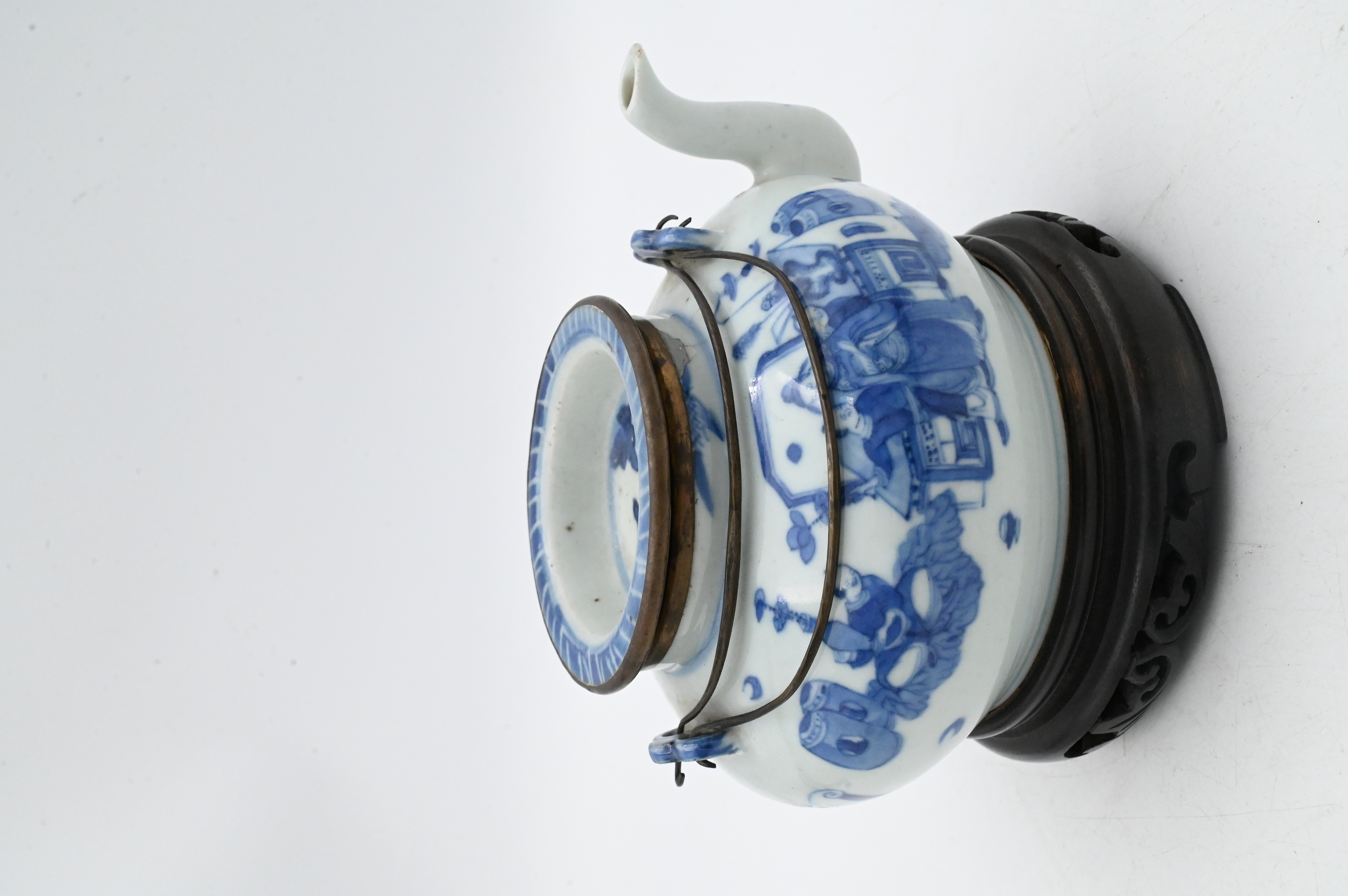 Of globular form, painted in underglaze blue with children and attendants in a garden, mounted with a metal collar and overhead swing handle, raised on a carved hardwood stand. 18th century or later