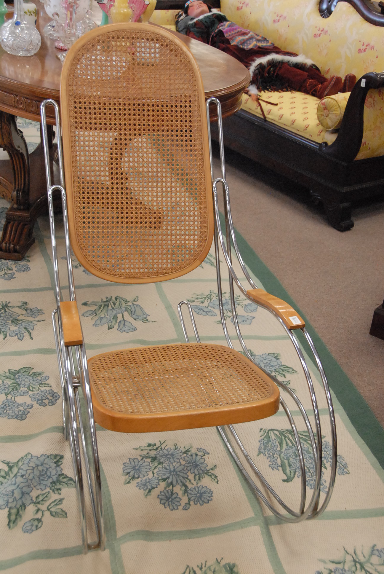 Chrome and maple rocker along with a hand woven rug, 13’6 x 5’9