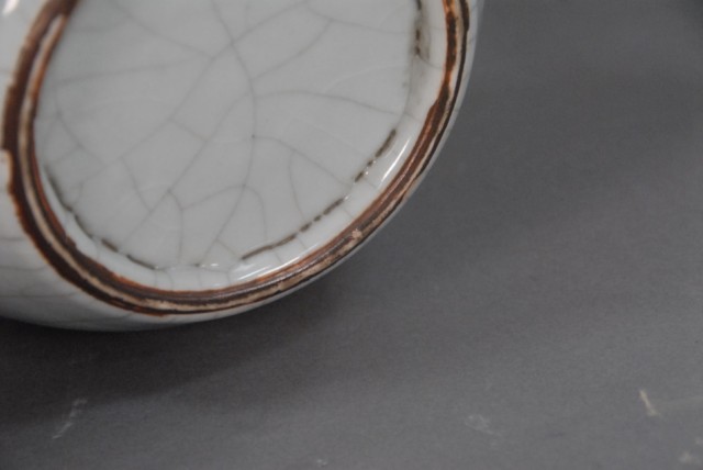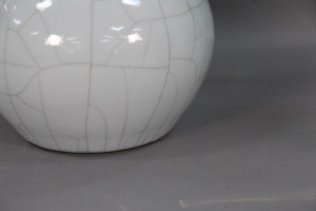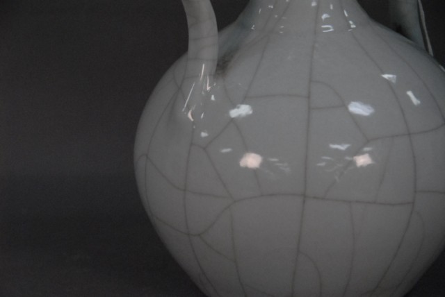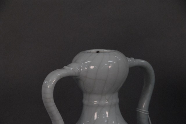 Double gourd glazed vase having 2 molded handles, all in a light. blue crackle glaze