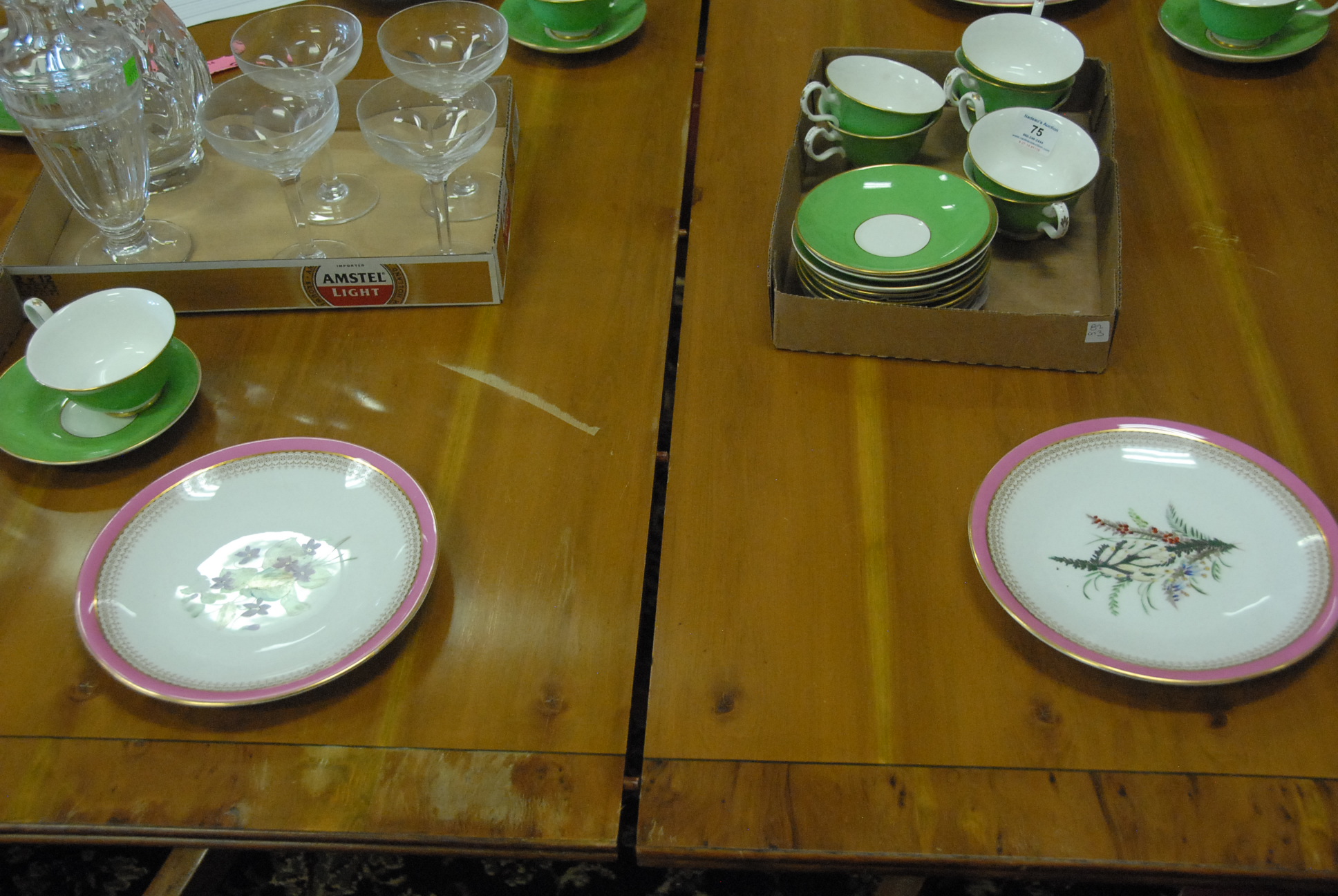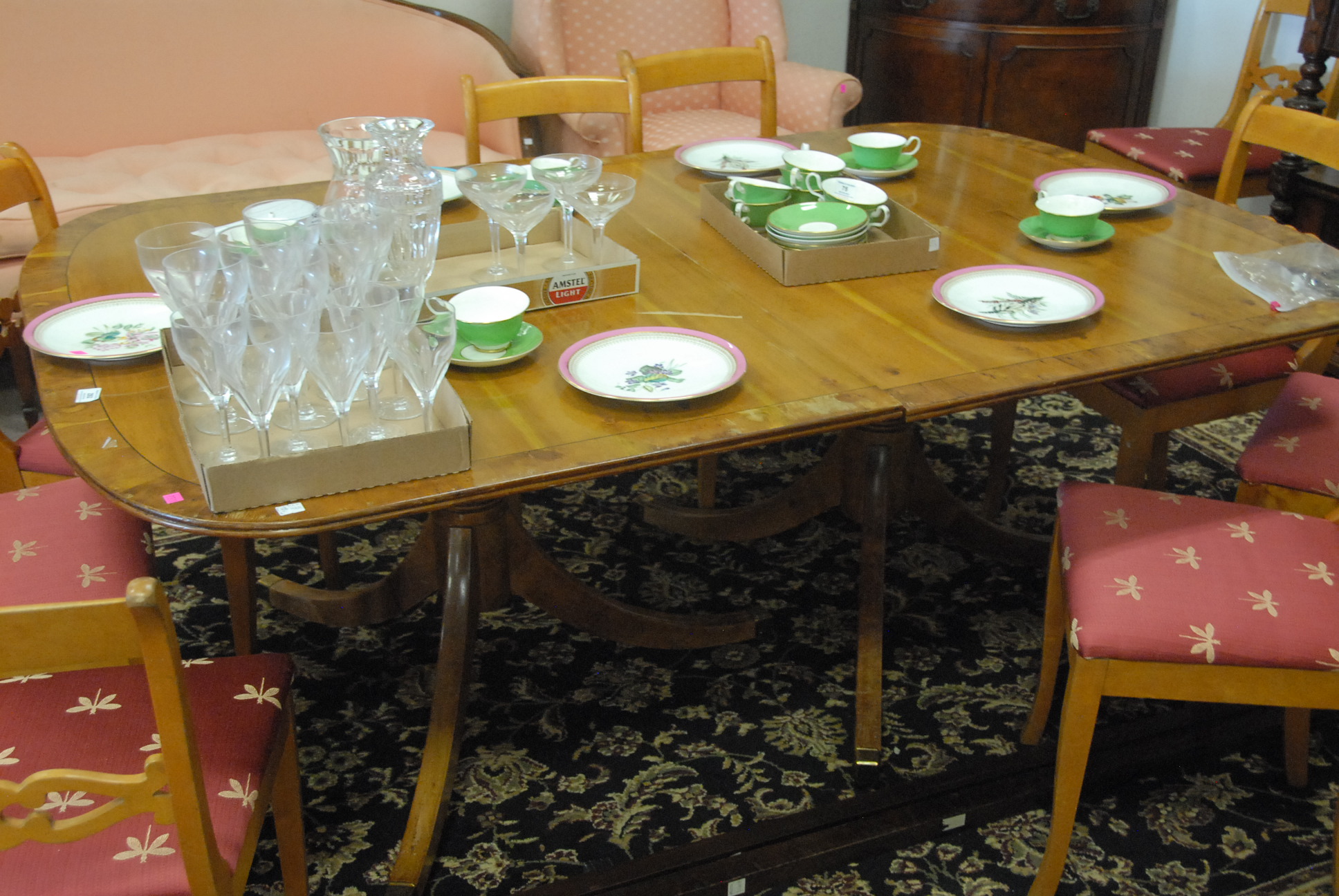Lot 292: Double pedestal dining table with banded inlaid top. 48 x 72 plus two 24 leaves opens to 120 in.