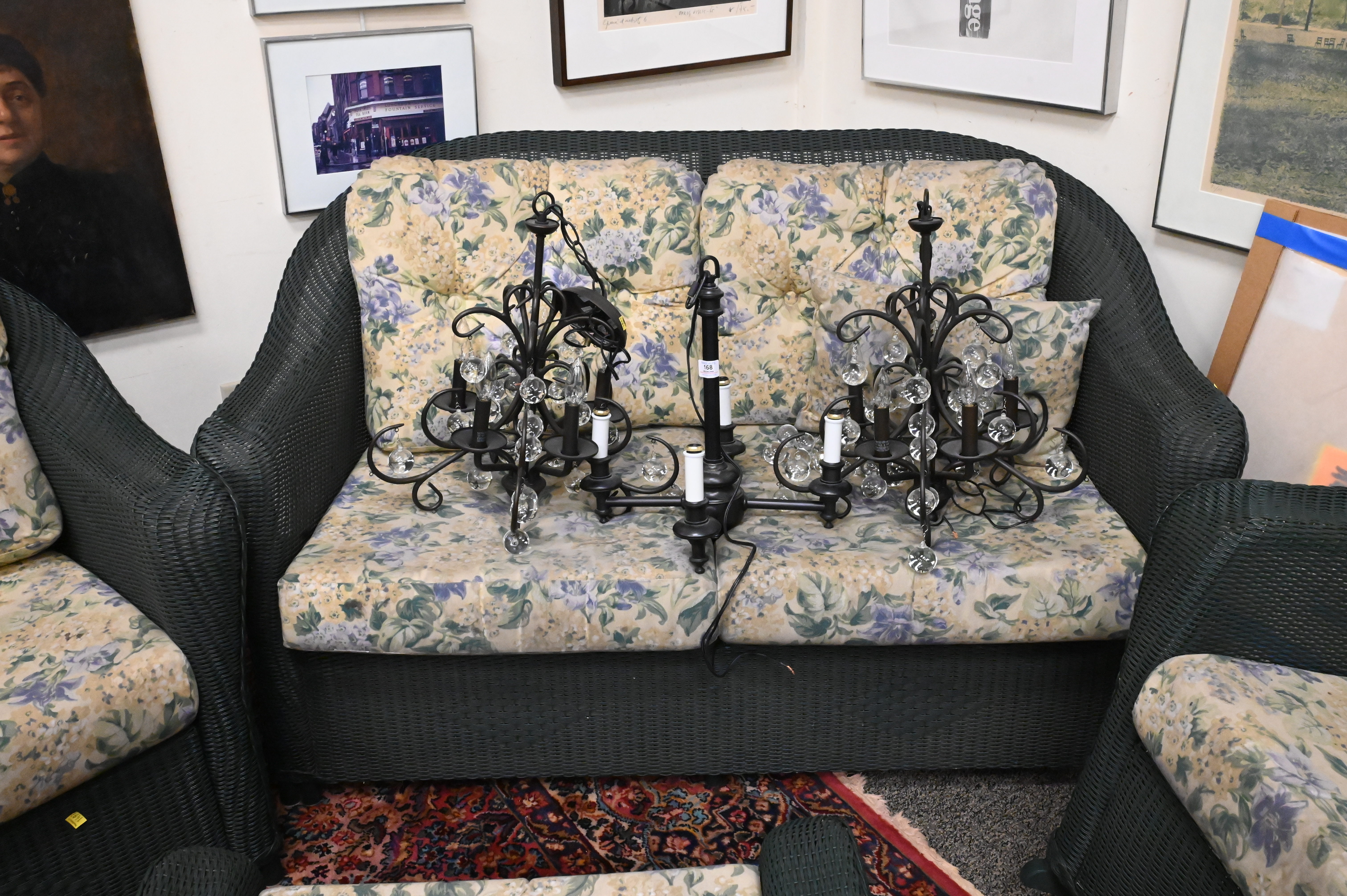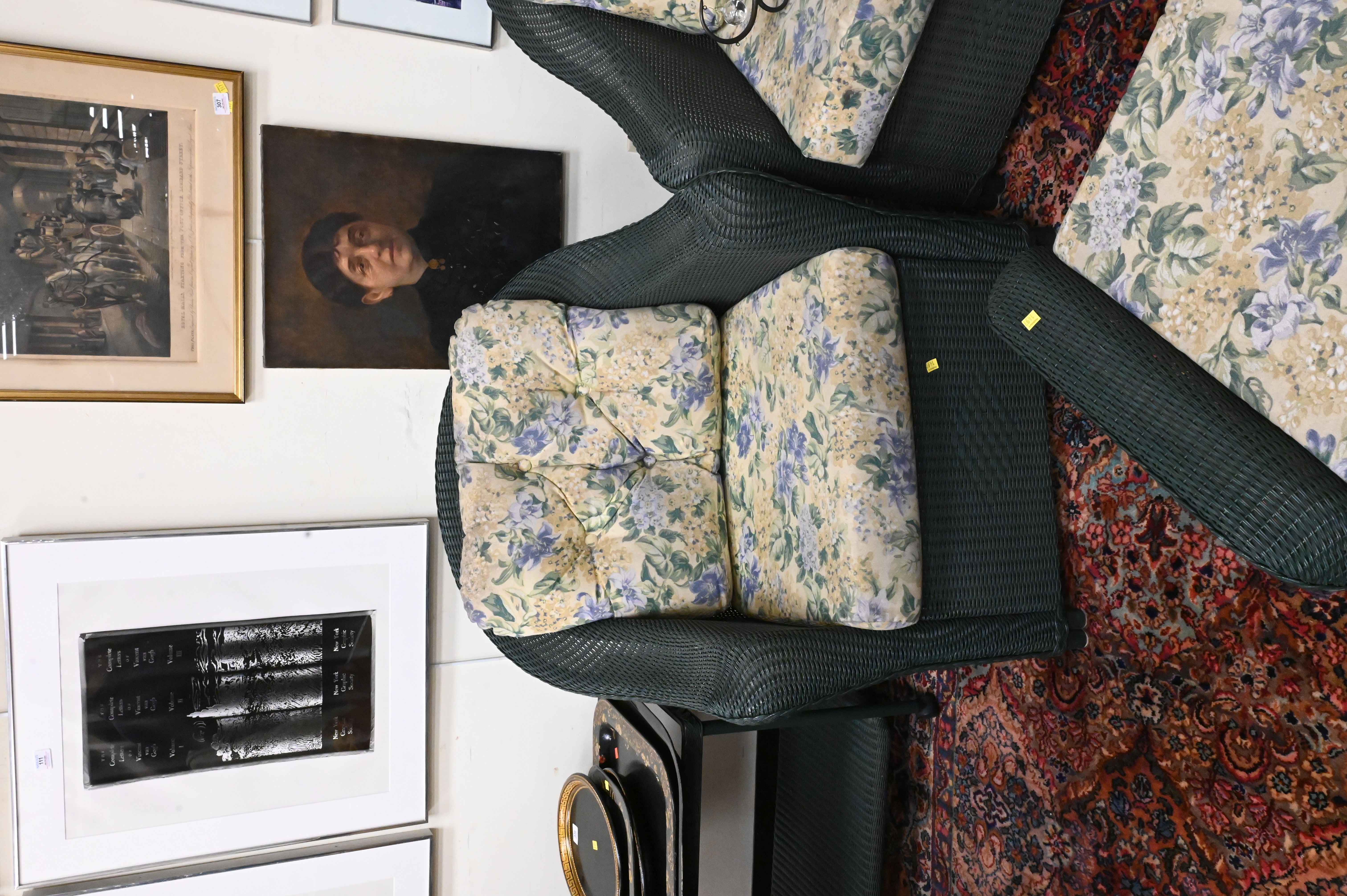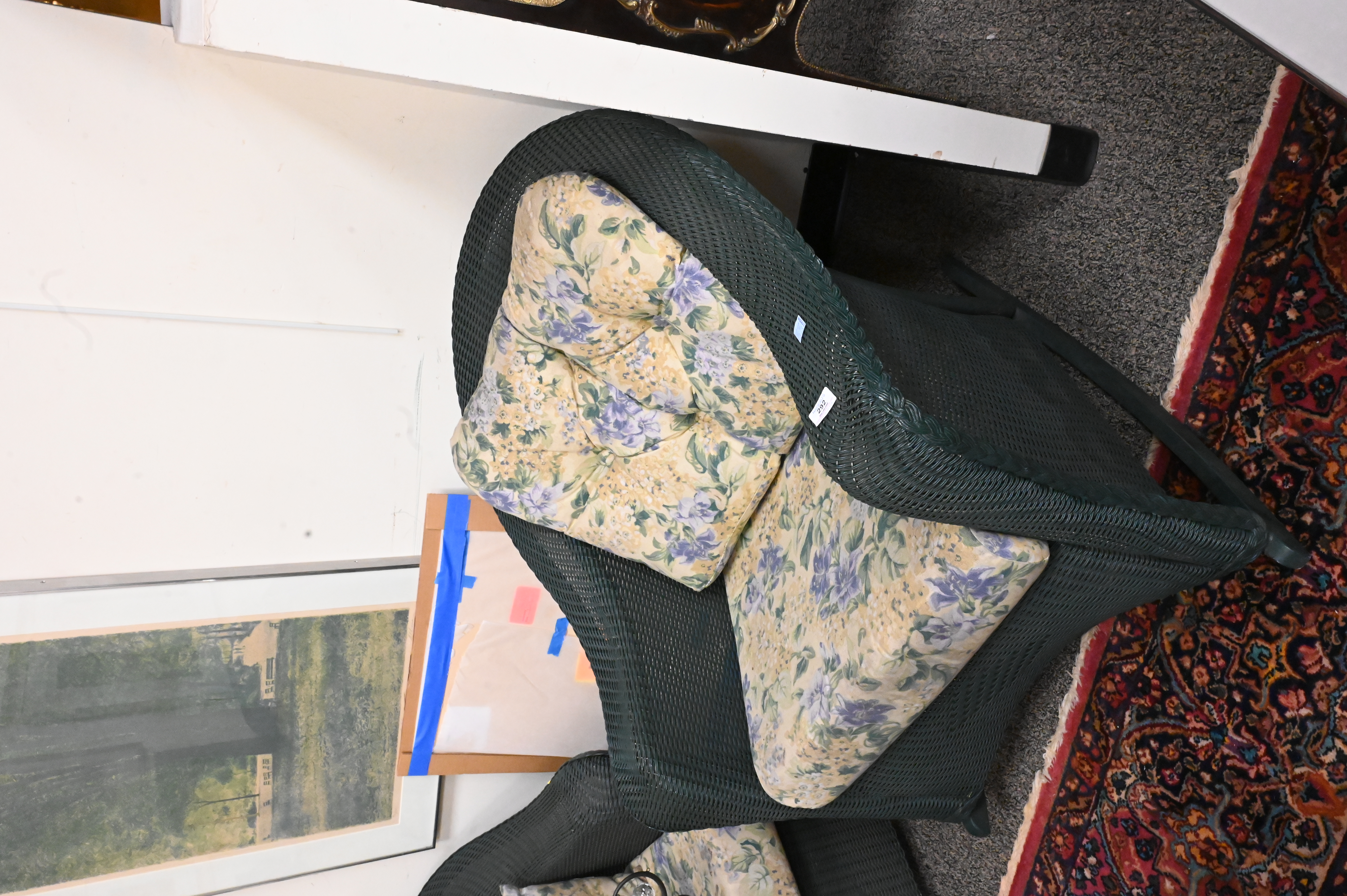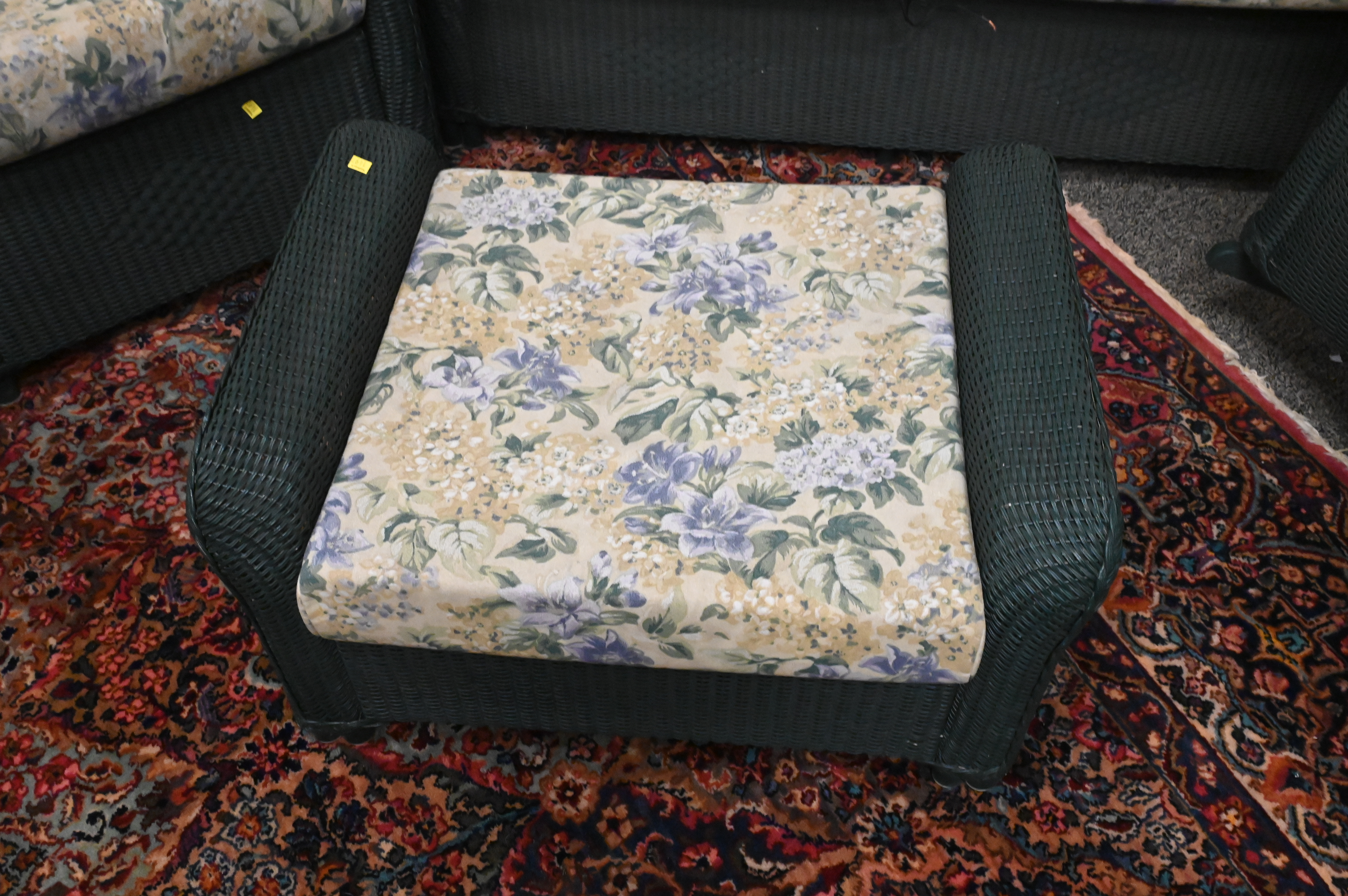 Five Piece Contemporary Wicker Set, to include a loveseat, width 57 inches; rocker; armchair; footstool; along with a small table.