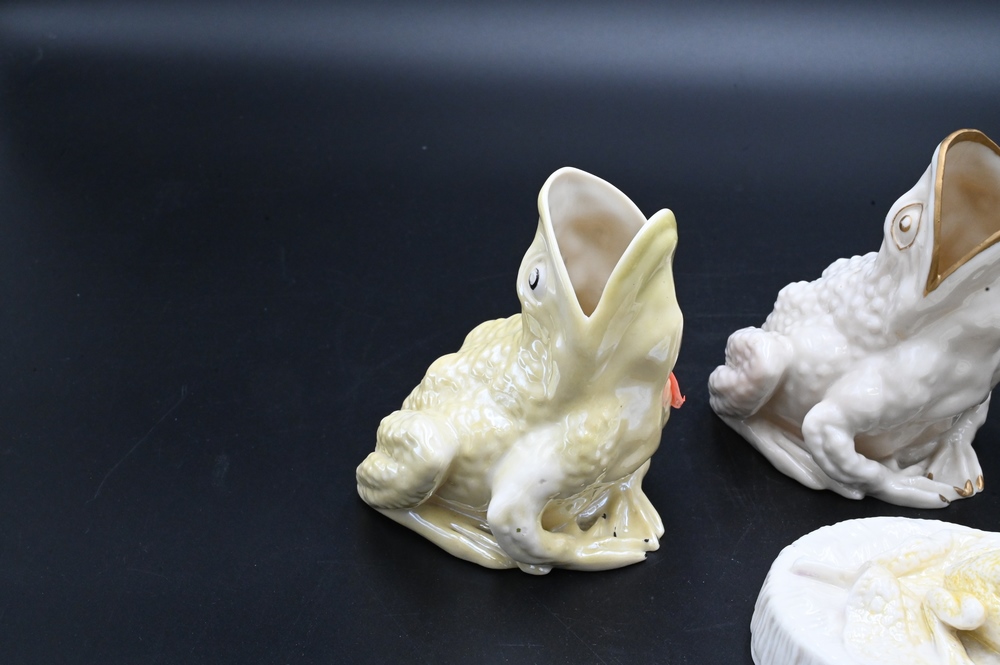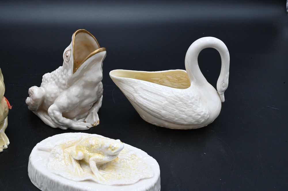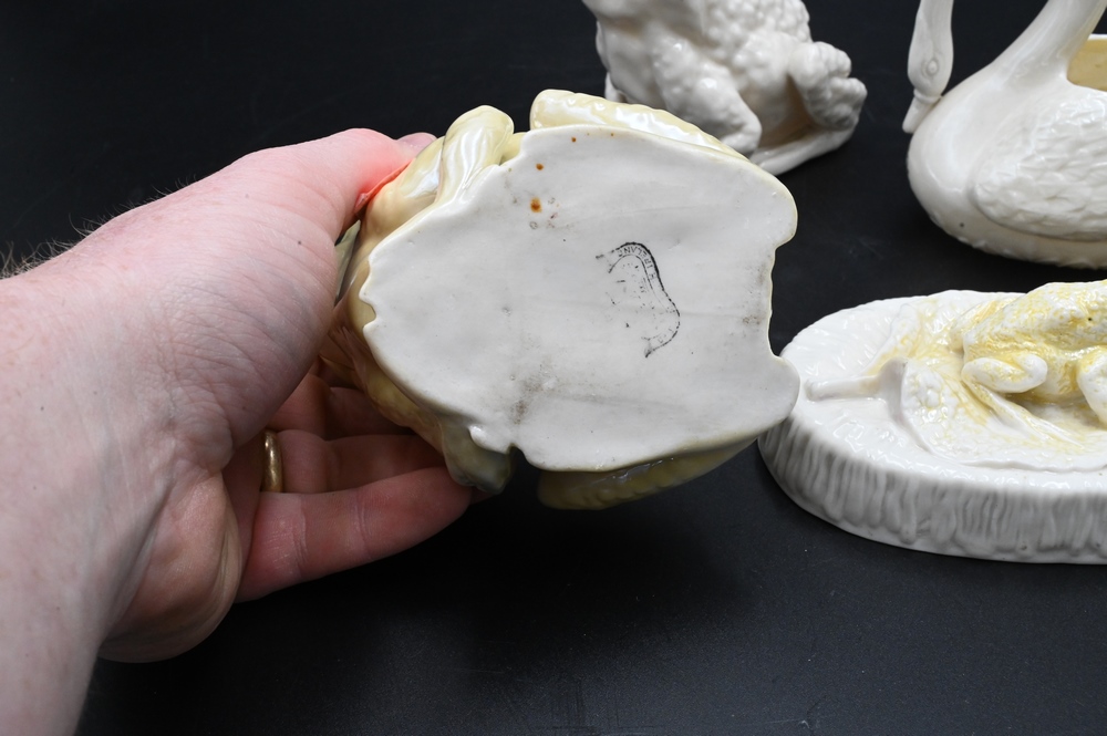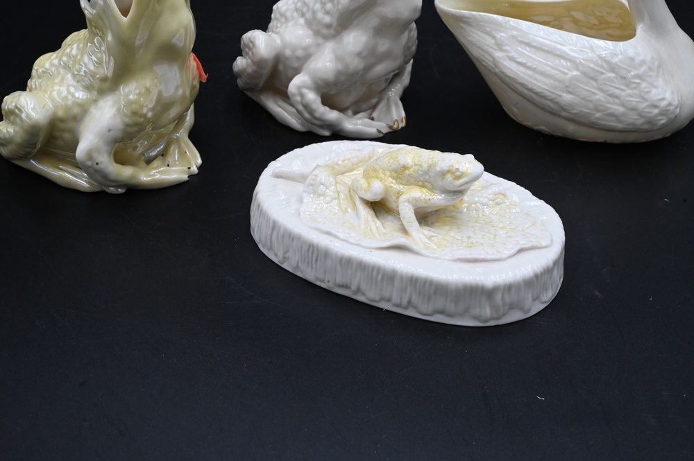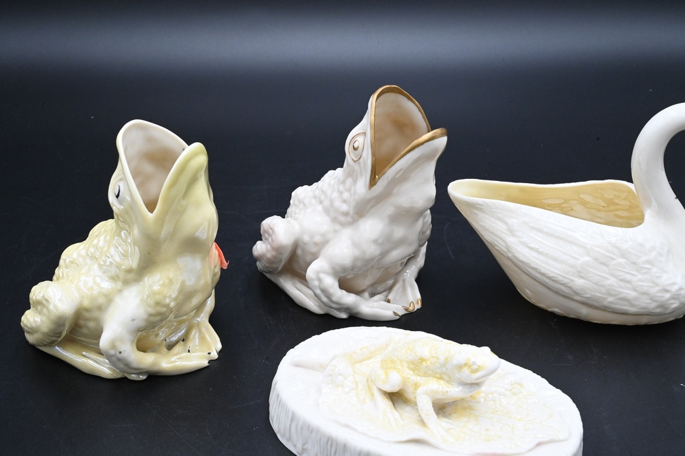 Four Belleek Animals, to include three frogs along with a swan; all with black marks; tallest frog 4 3/4 inches. Provenance: Collections of Norma Reilly, New Jersey.