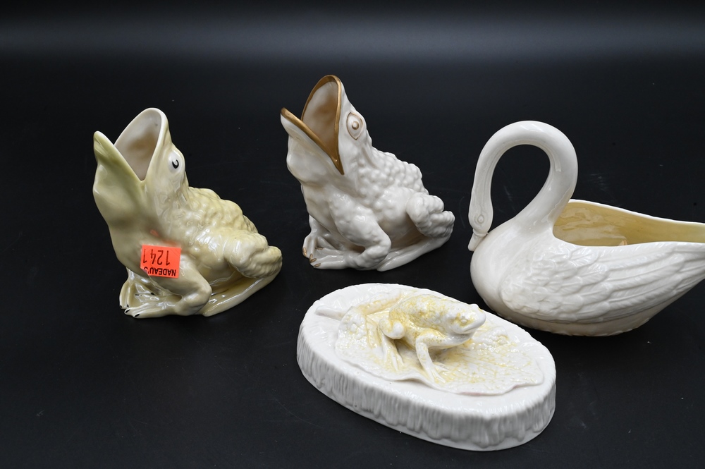 Lot 292: Four Belleek Animals, to include three frogs along with a swan; all with black marks; tallest frog 4 3/4 inches. Provenance: Collections of Norma Reilly, New Jersey.