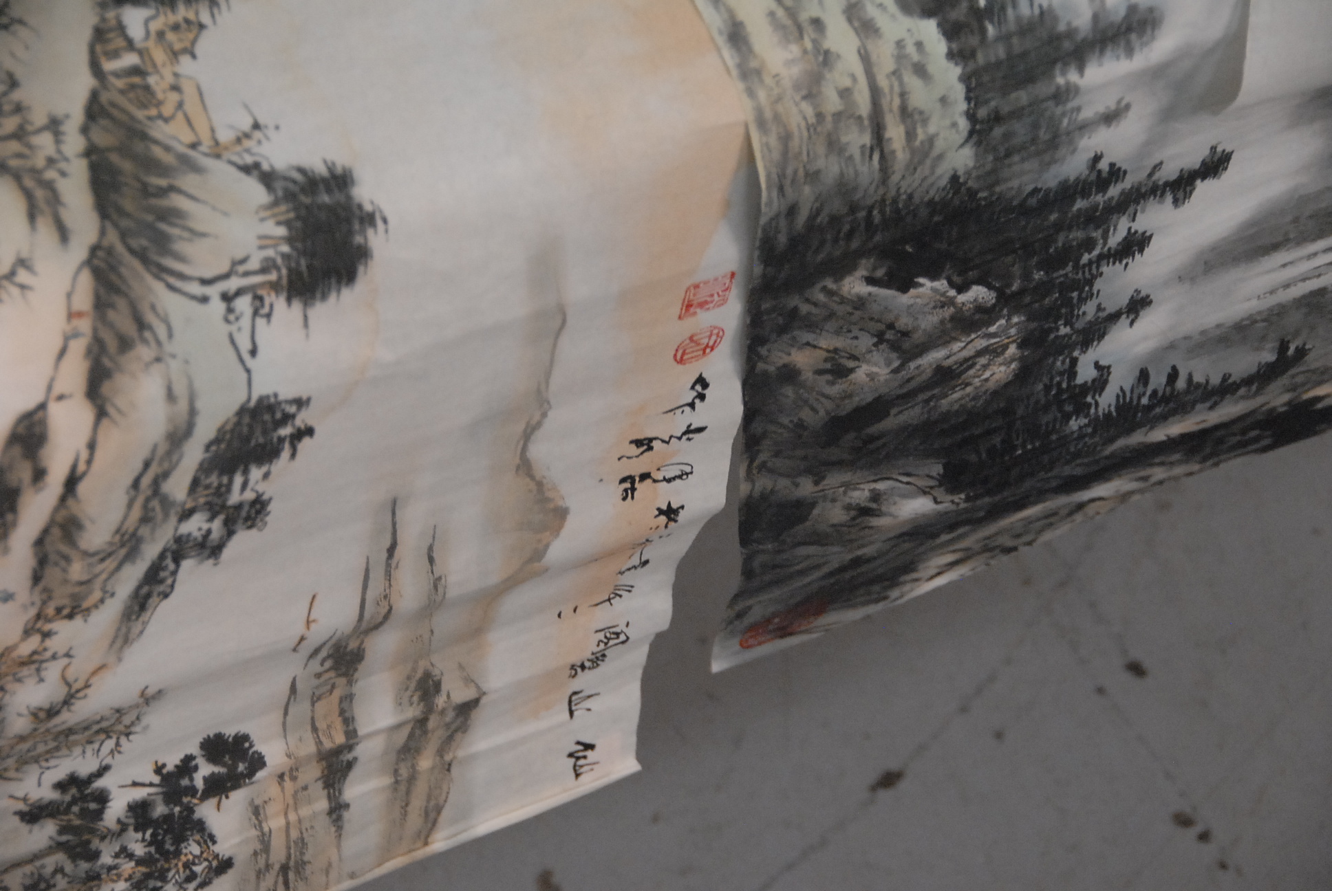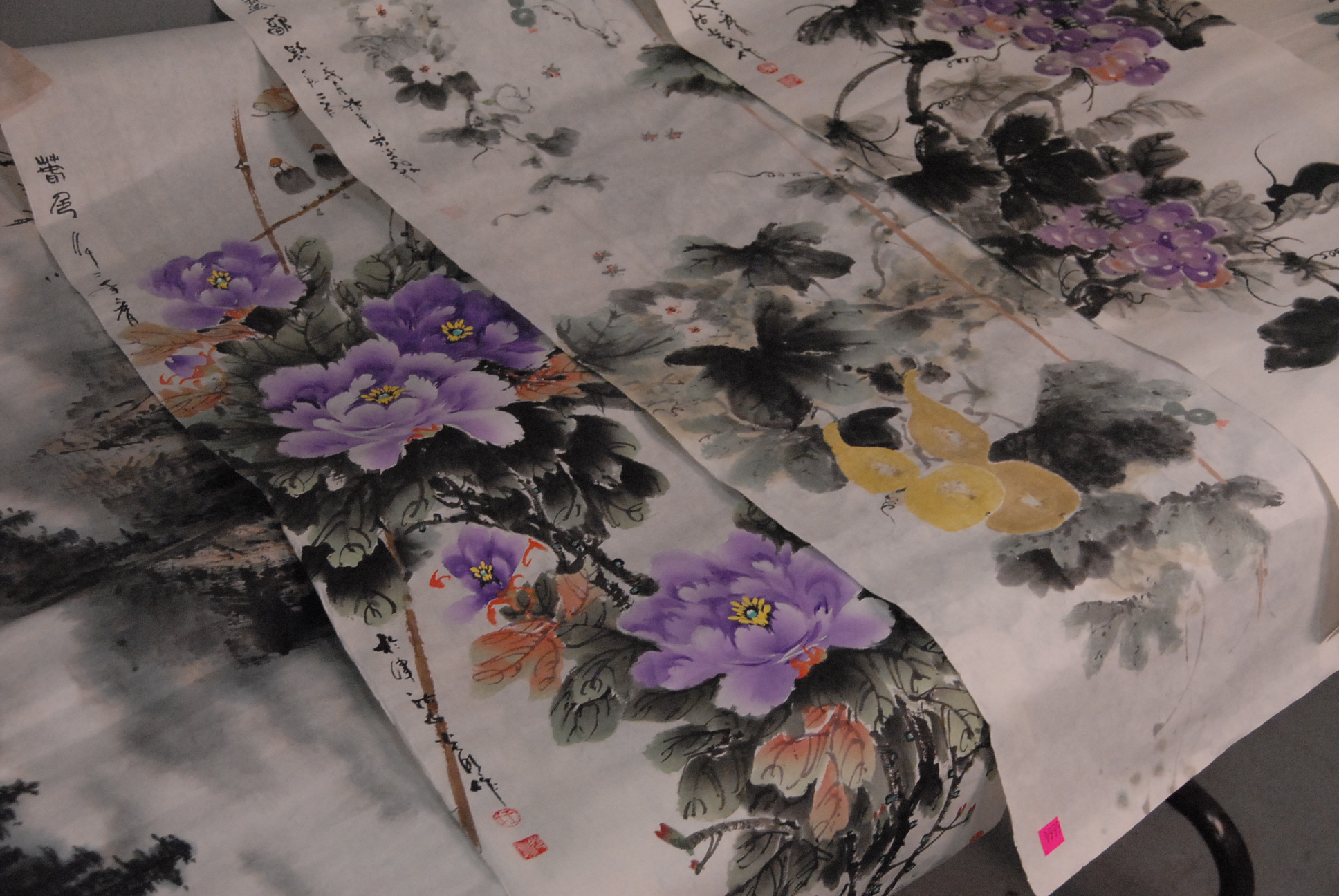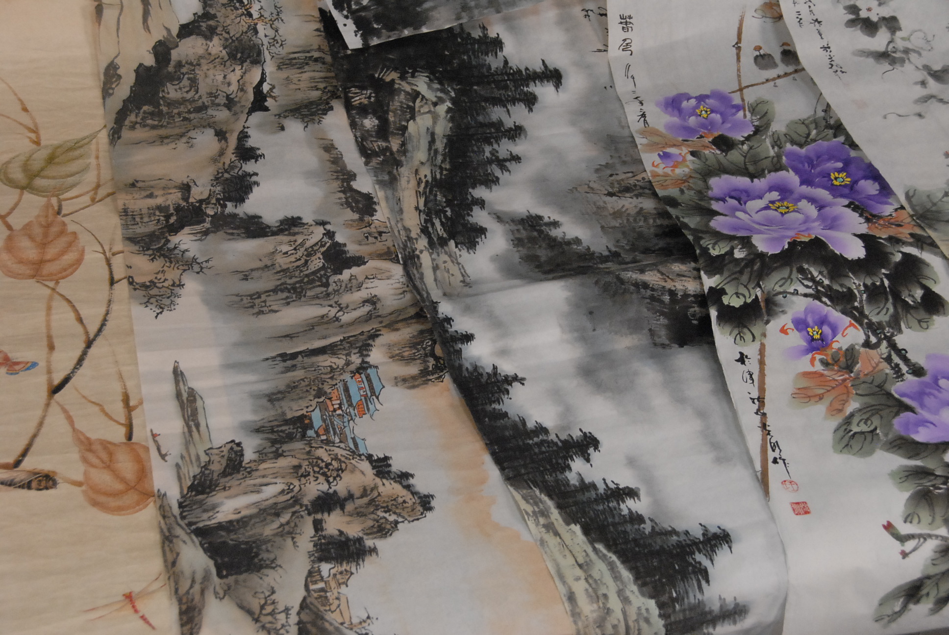 Group of ten Oriental paintings pair of landscapes on tissue paper, group of four paintings on tissue paper of flowers, two paintings on tissue paper of bugs and leaves, and two Oriental scrolls.