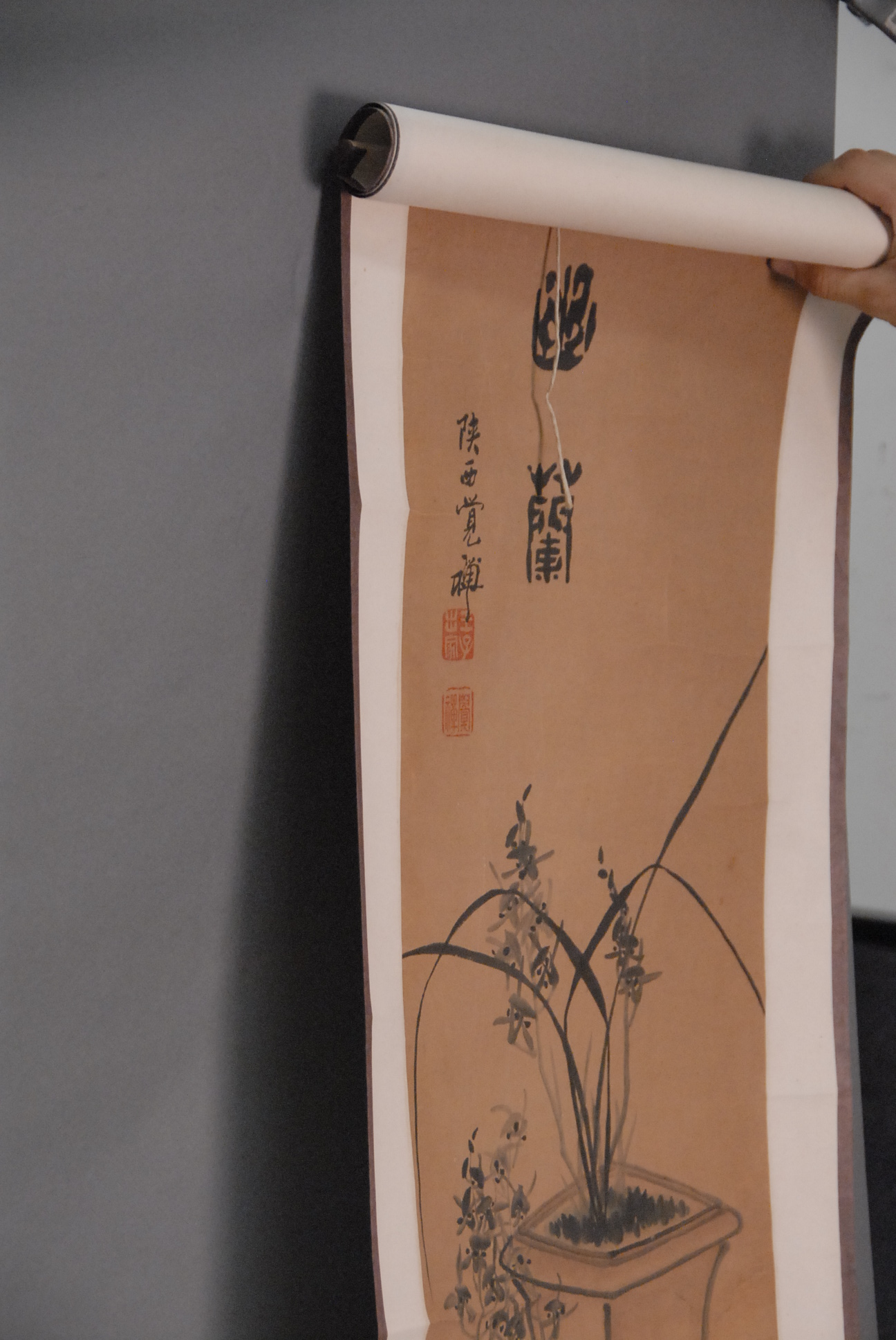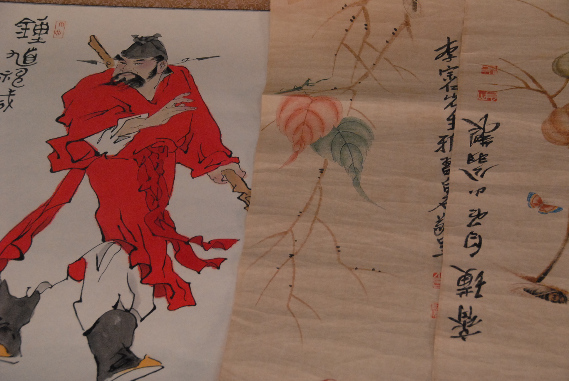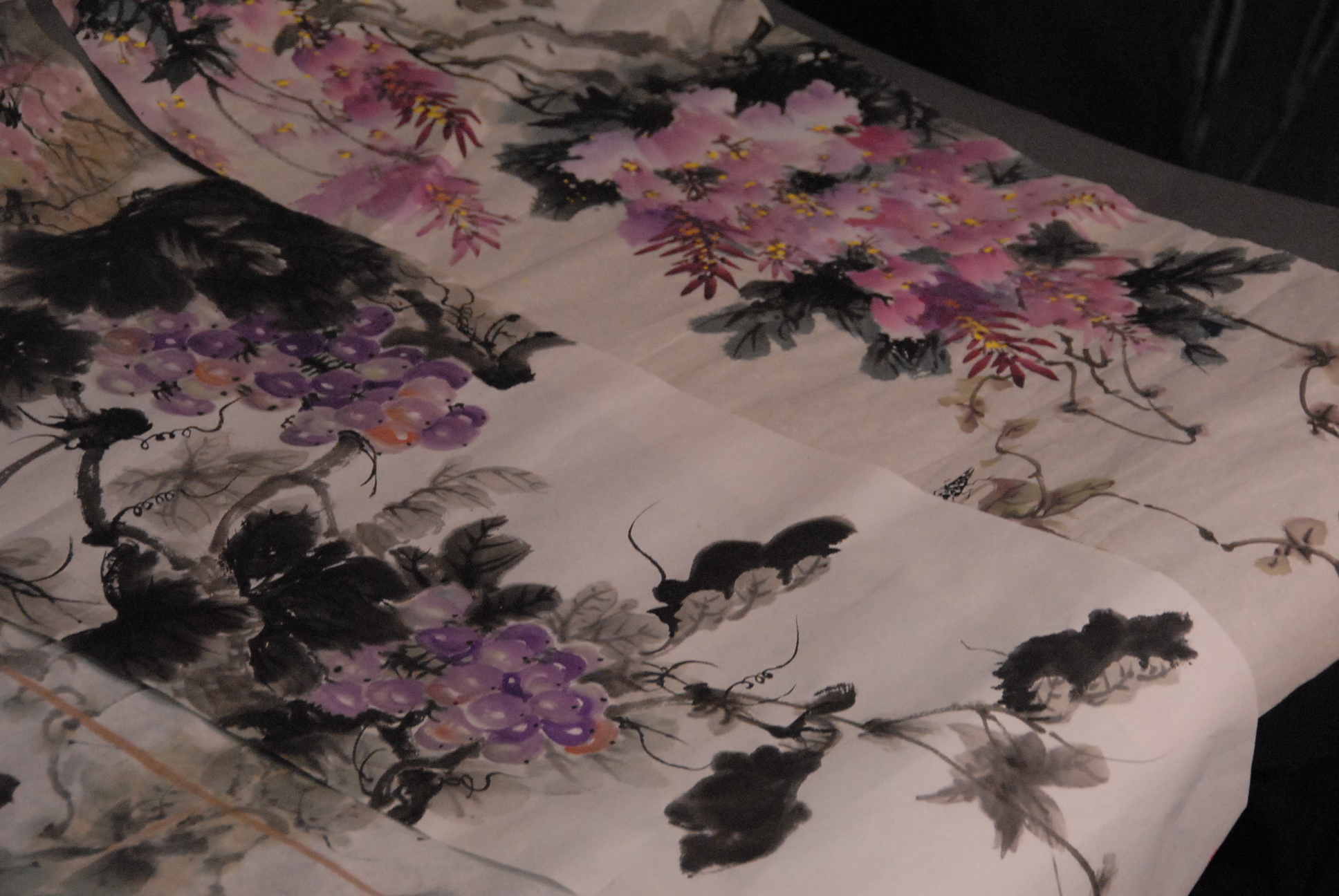 Group of ten Oriental paintings pair of landscapes on tissue paper, group of four paintings on tissue paper of flowers, two paintings on tissue paper of bugs and leaves, and two Oriental scrolls.