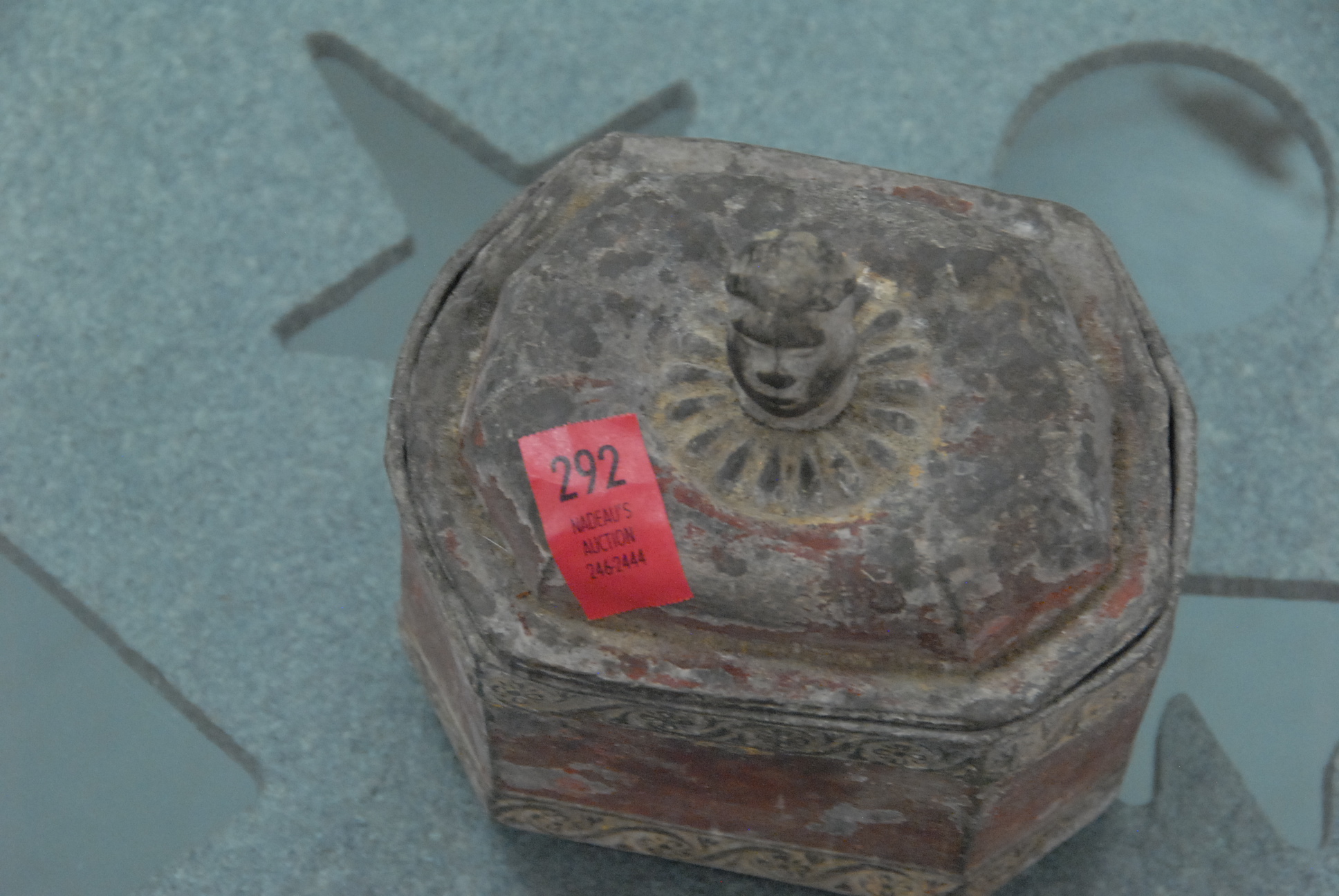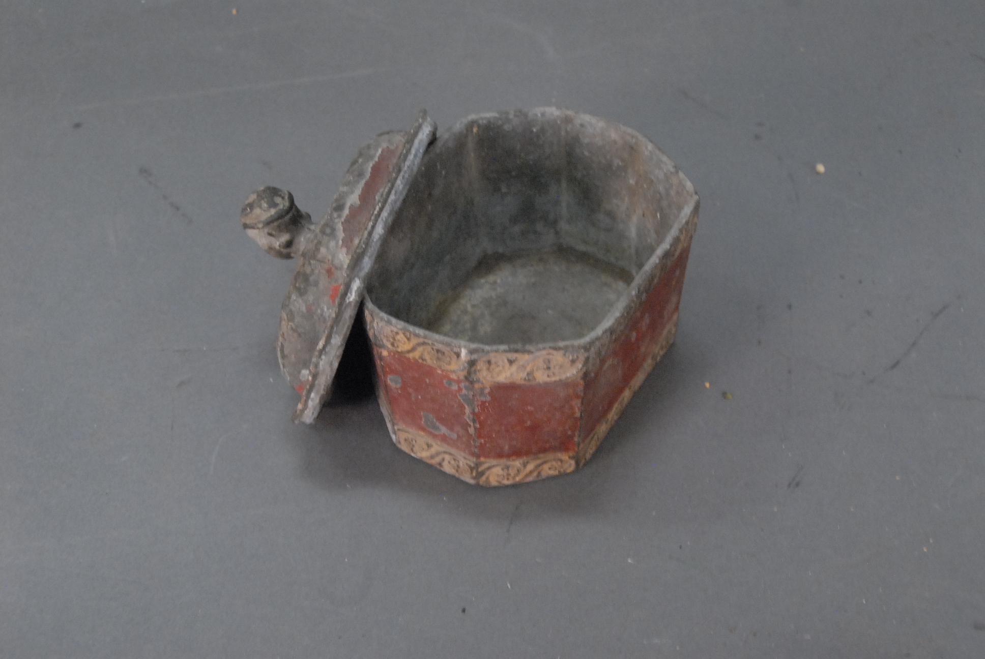Lead container with head figural top painted red, ht. 5, lg. 5.