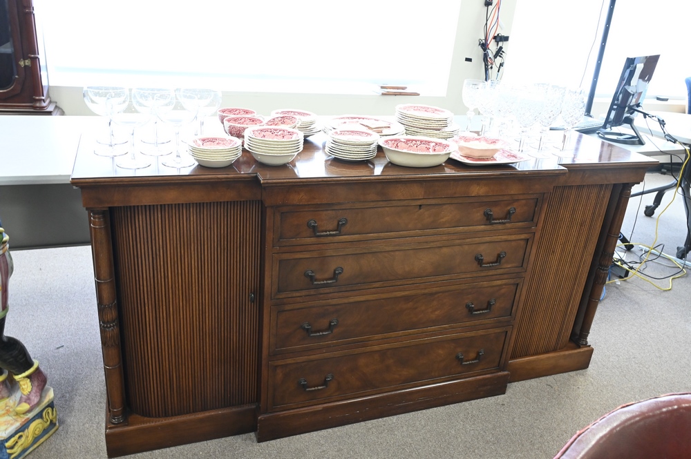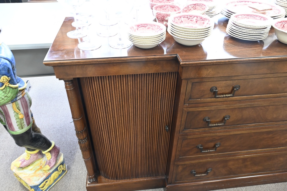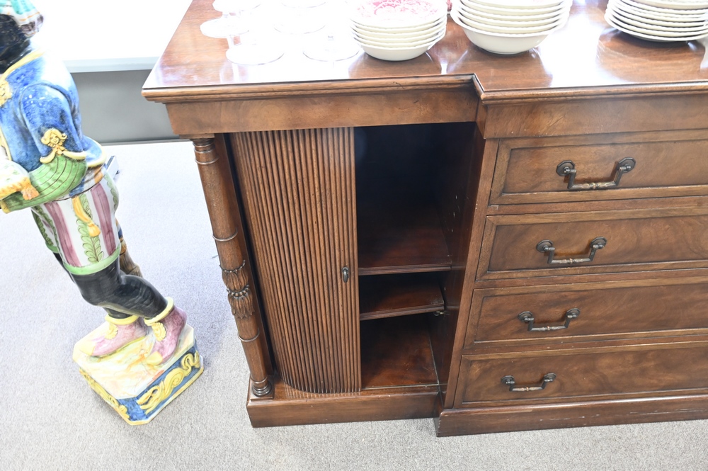 Lot 292: Mahogany Credenza, having four drawers flanked by tambor doors and columns, height 34 1/2 inches, top 19″ x 72″.