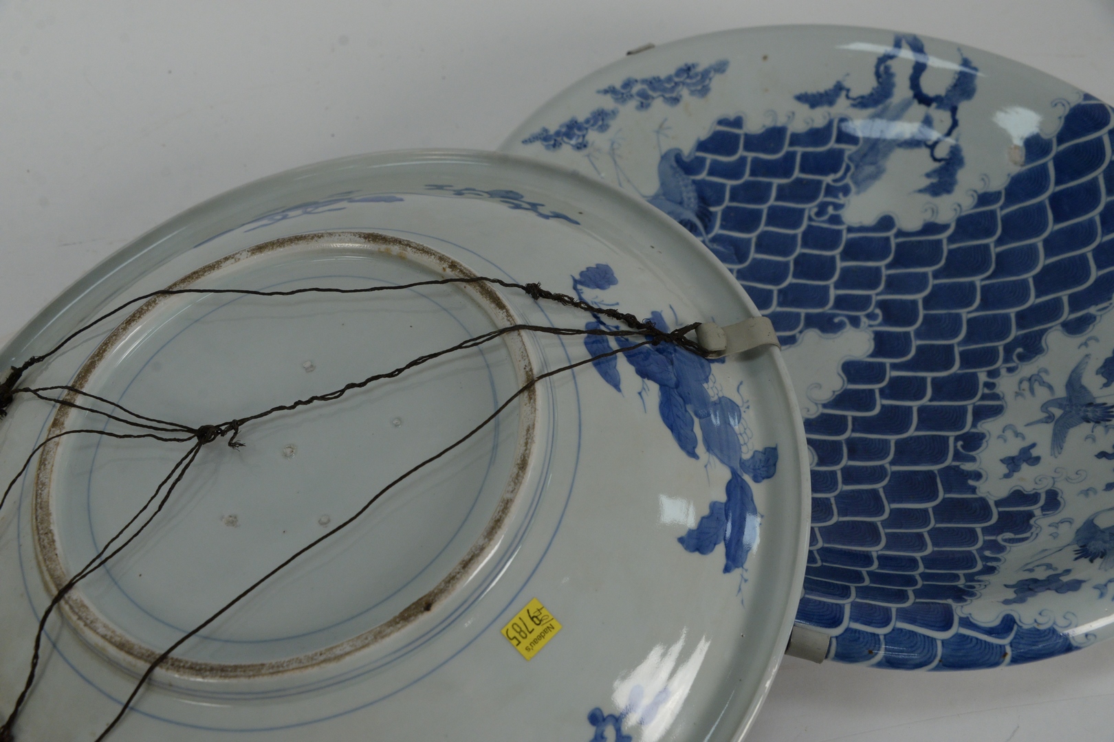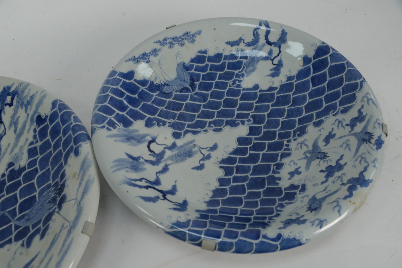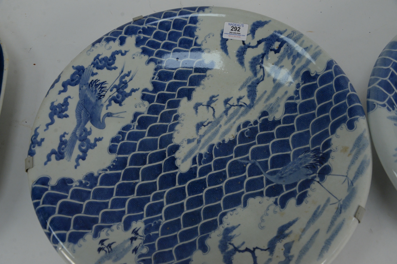 Lot 292: Pair of Japanese Porcelain Blue and White Chargers each depicting flying cranes over stylized waves, Meiji period, diameter 18 inches.
