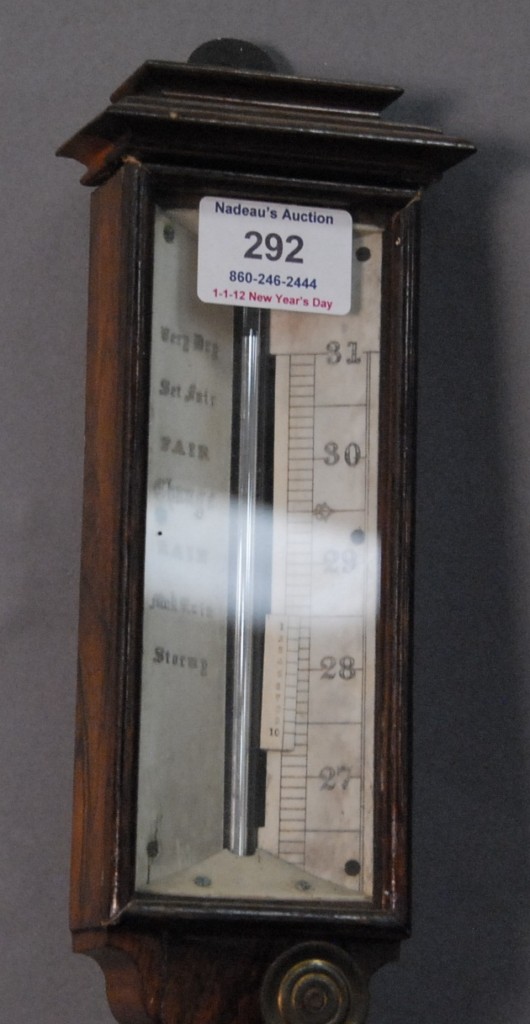 Rosewood ship’s barometer with mother of pearl inlays and brass base. height 36in.
