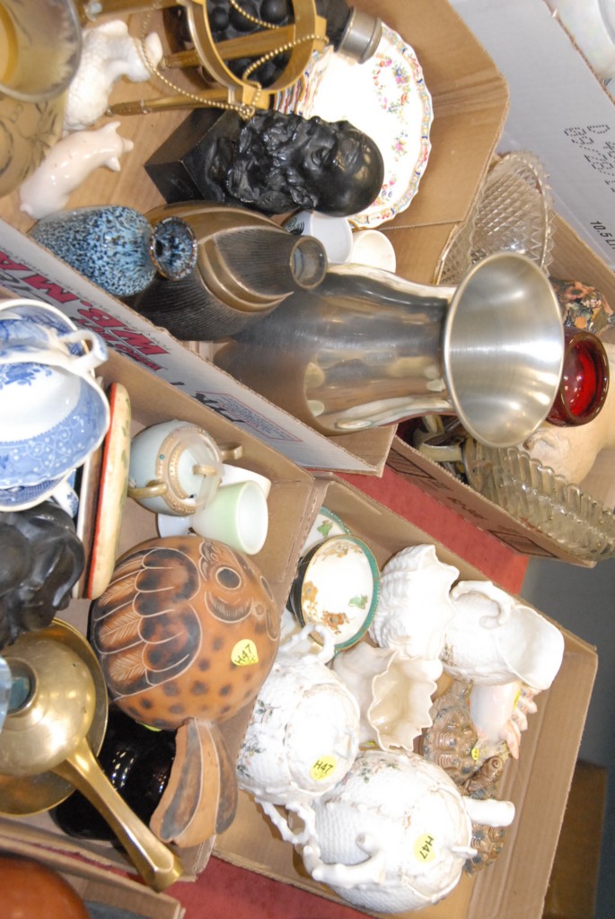 Six box lots hand painted china, canister set, tea set, decorated lamp shade, china, glass, animal figures, Belleek vase.