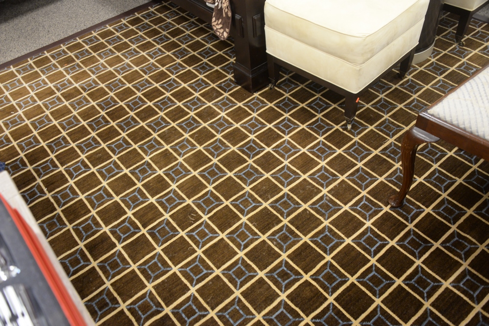 Stark Custom Room Size Carpet, having cutout that can be altered, 13′ 1″ x 15′ 4″, Provenance: David and Cynthia Kim, 22 Stoney Wylde Lane, Greenwich, Connecticut. View home by visiting: https://www.zillow.com/homedetails/22-Stoney-Wylde-Ln-Greenwich-CT-06830/177238281_zpid/.