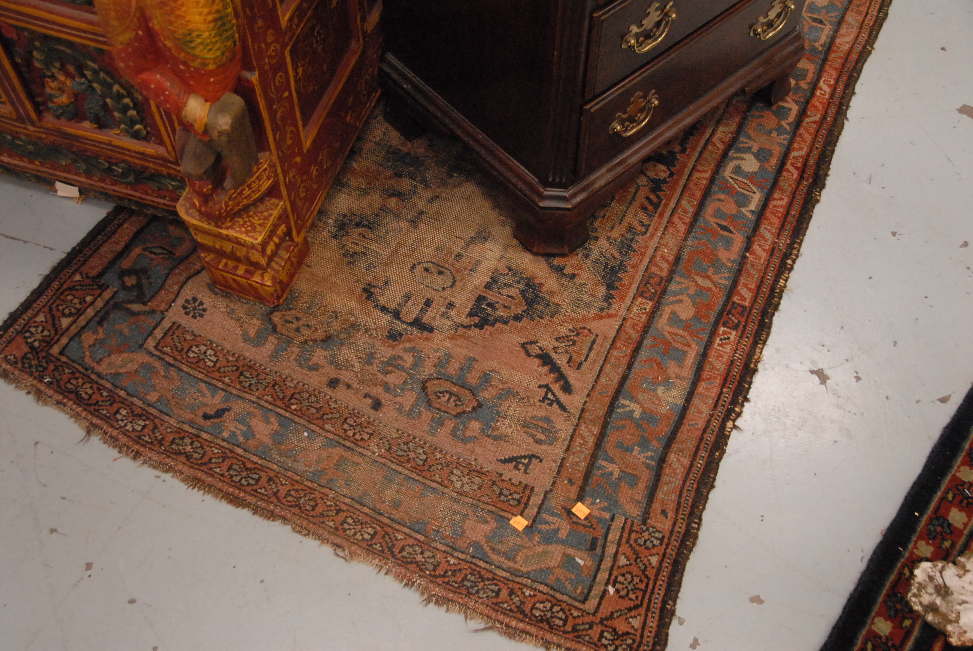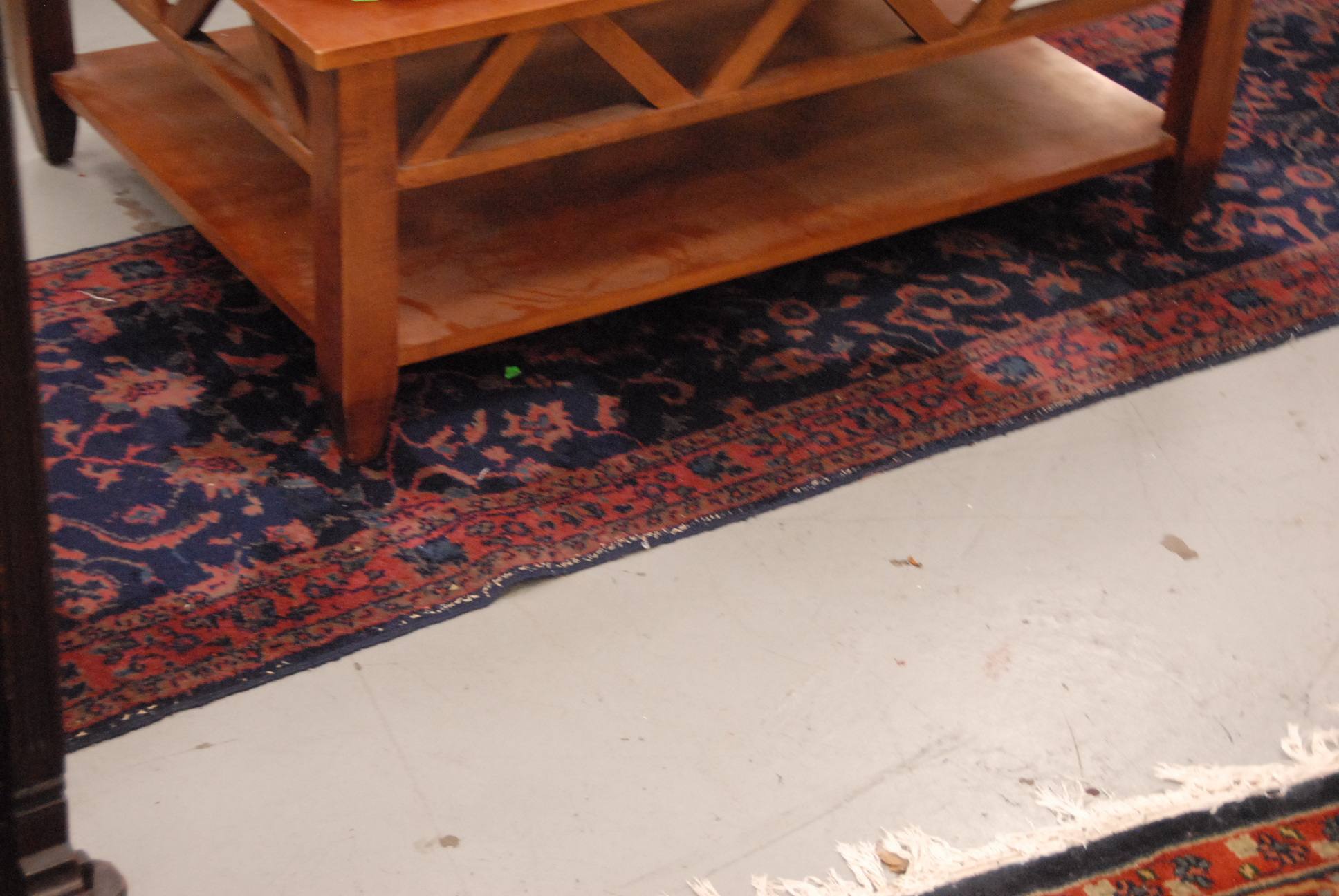 Three antique Oriental rugs and two piece runner, 2’6 X 3′, 2’6 X 9′, , 2’6 X 11’4, 3’4 X 5’11, & 3’8 X 5’11.