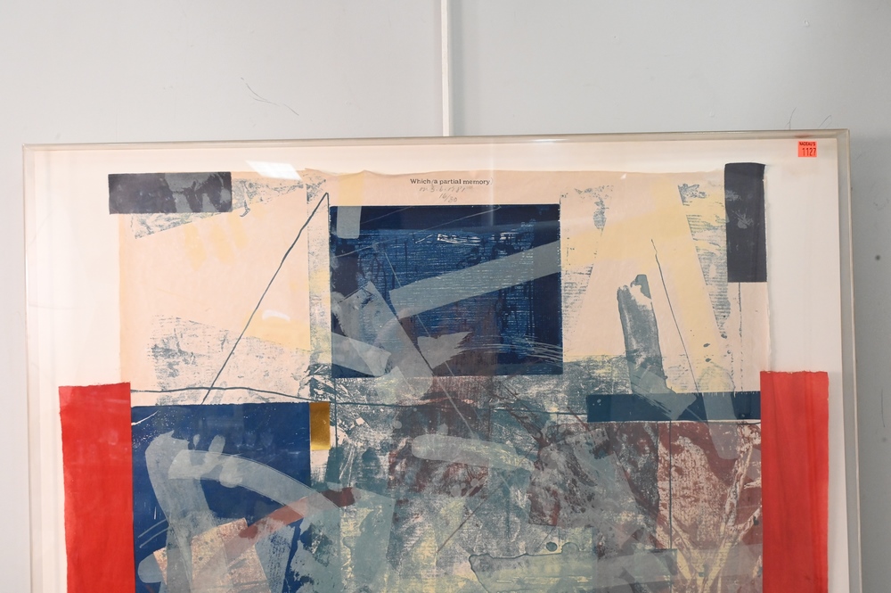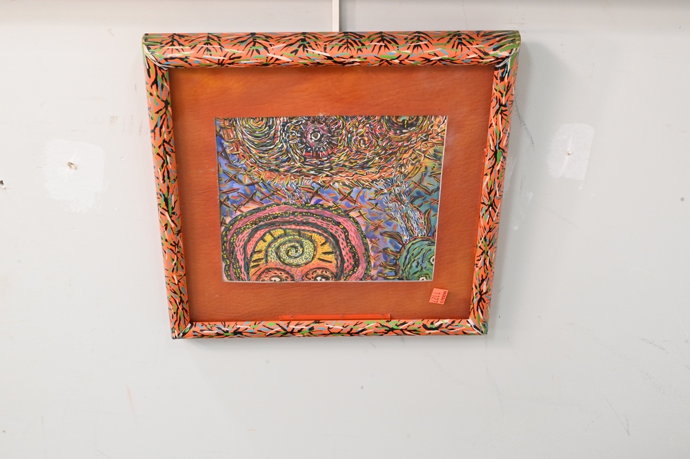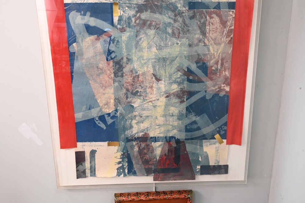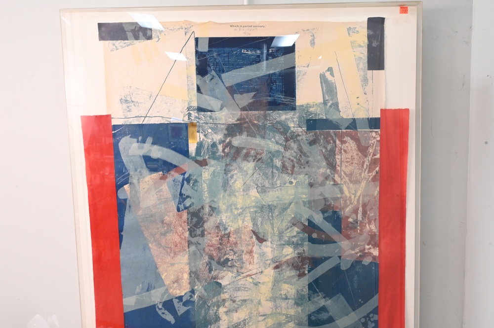 Lot 292: Three Framed Pieces, attributed to Clayton Patterson, abstract, mixed media on paper; Elaine Berger, colored engraving; and a colored lithograph, pencil signed illegibly, largest 41″ x 33.5″.