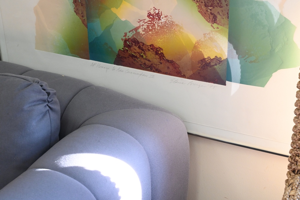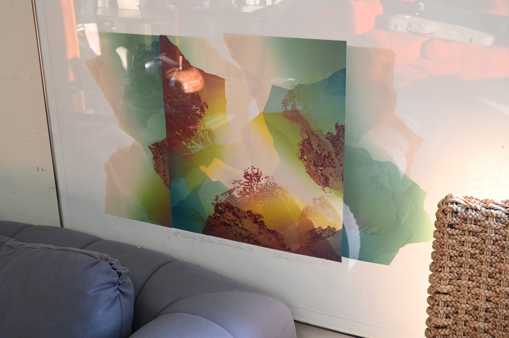 Three Framed Pieces, attributed to Clayton Patterson, abstract, mixed media on paper; Elaine Berger, colored engraving; and a colored lithograph, pencil signed illegibly, largest 41″ x 33.5″.
