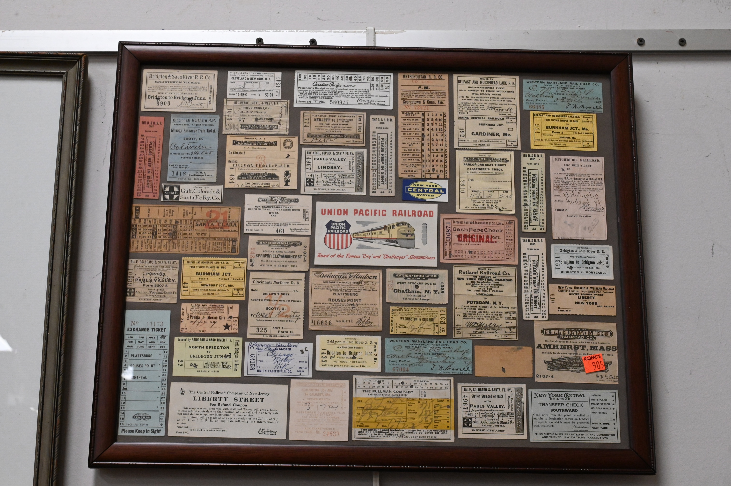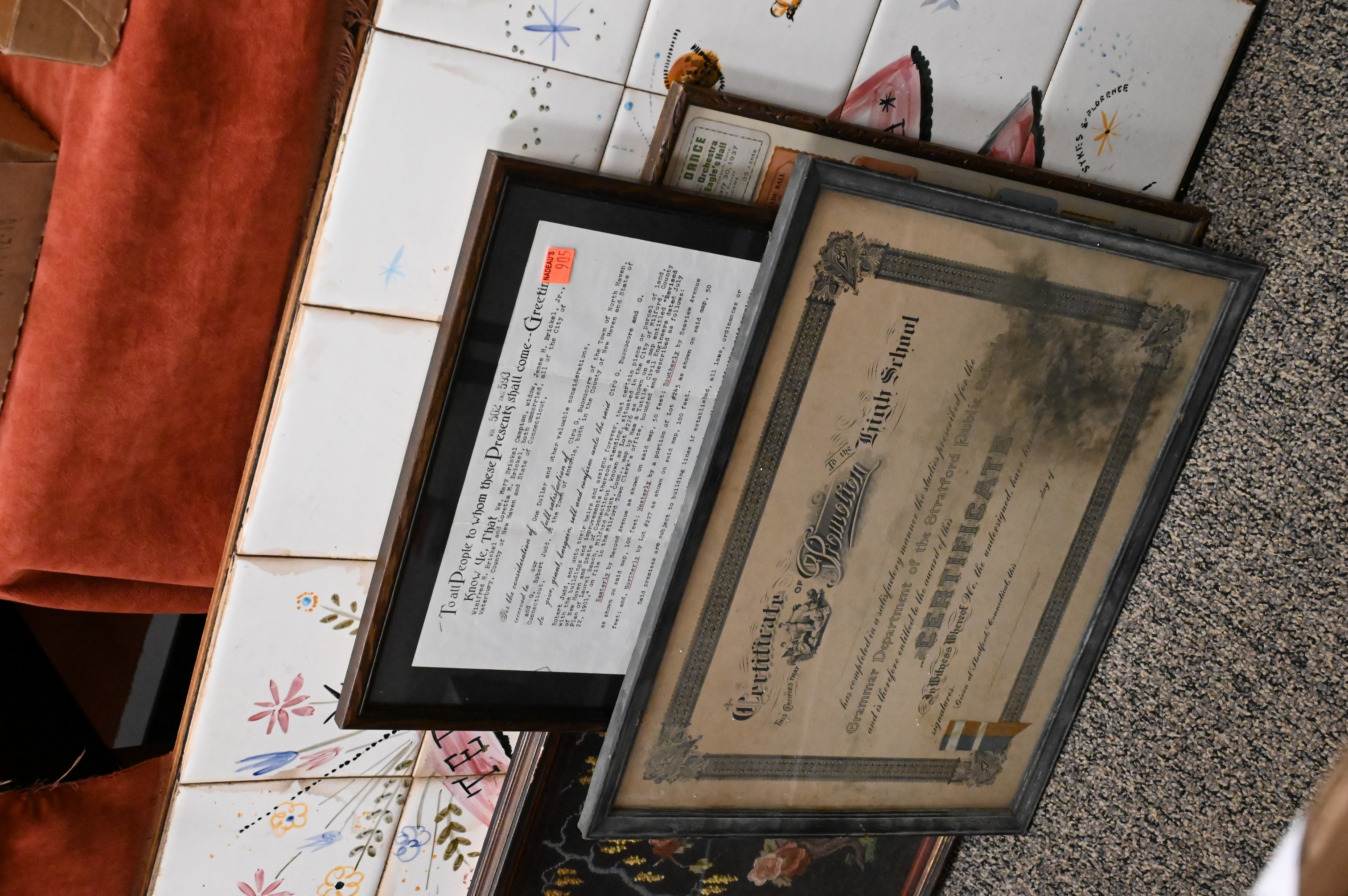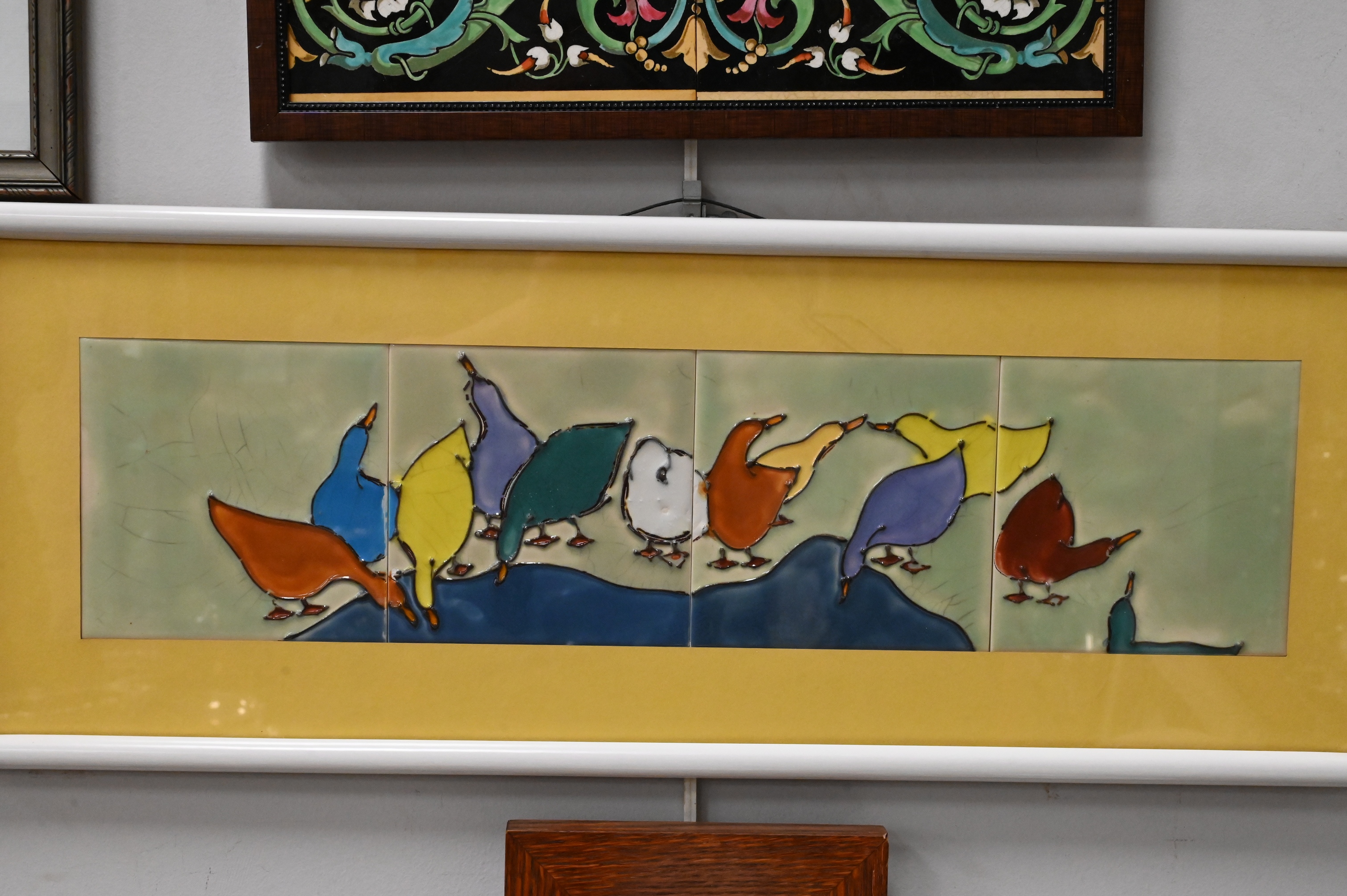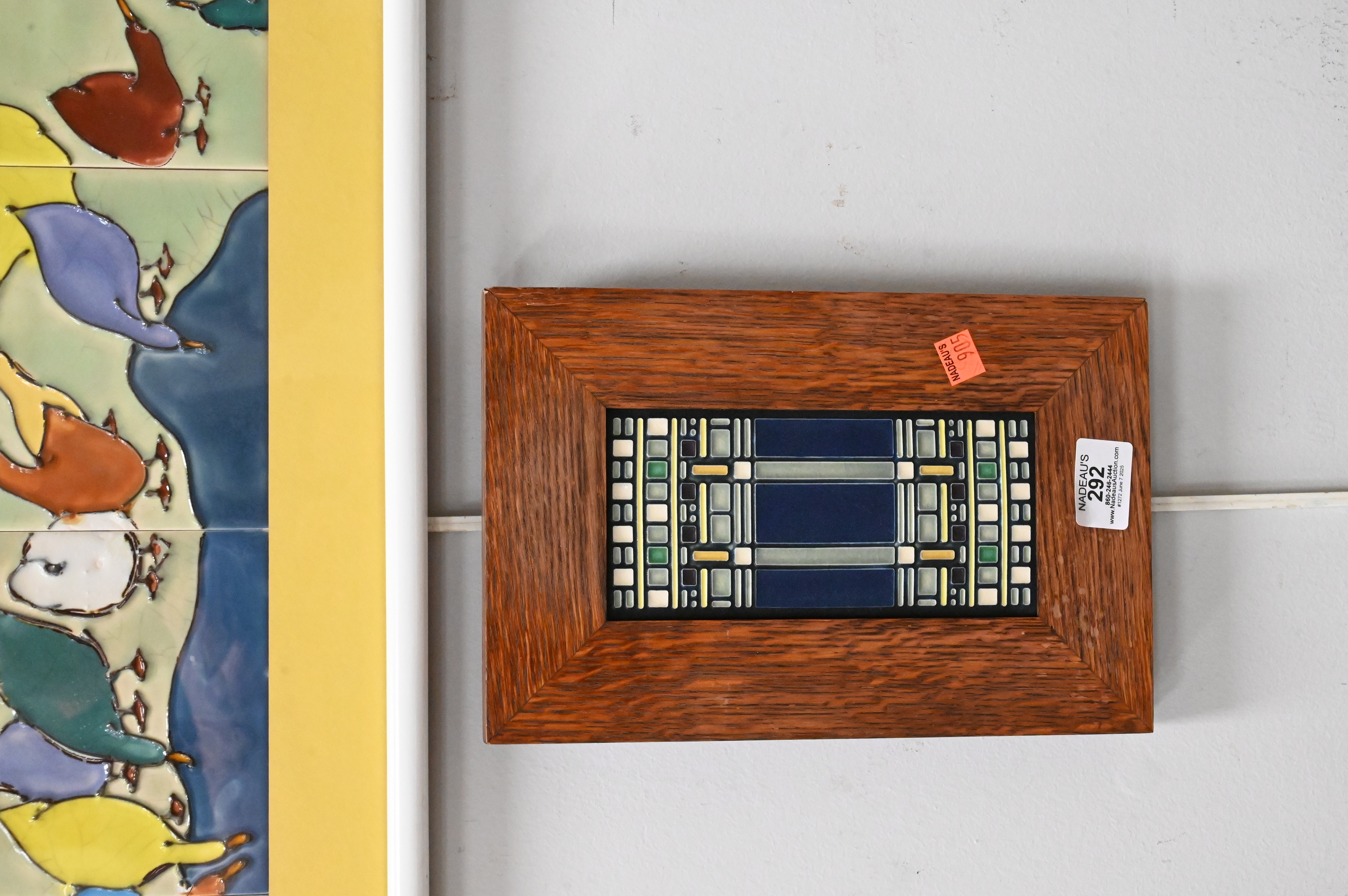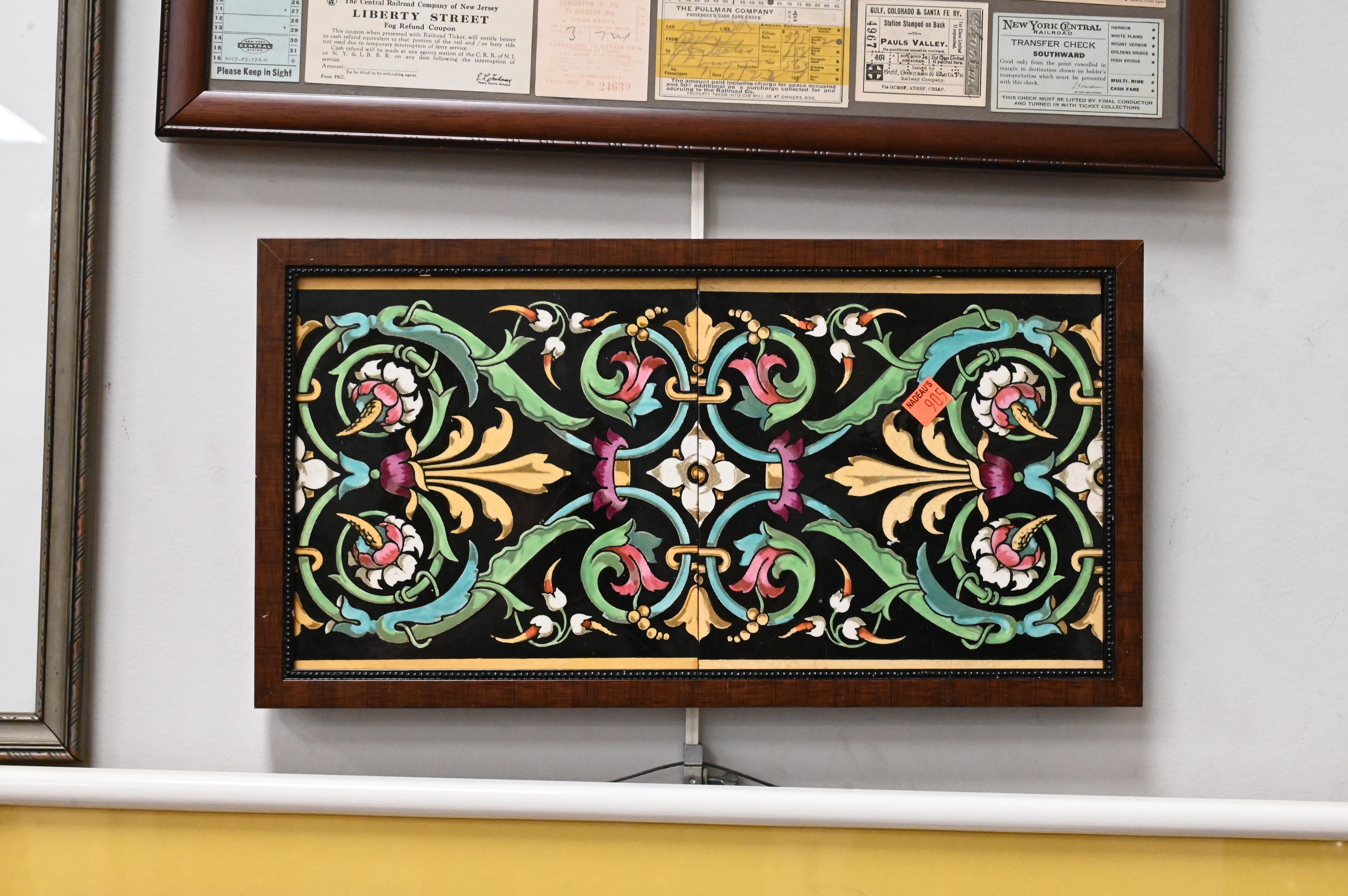 Motawi Tileworks Frank Lloyd Wright plaque, along with several other tile pieces, charcoal drawing of a ballerina, drawing of a ship, vintage framed train tickets etc…