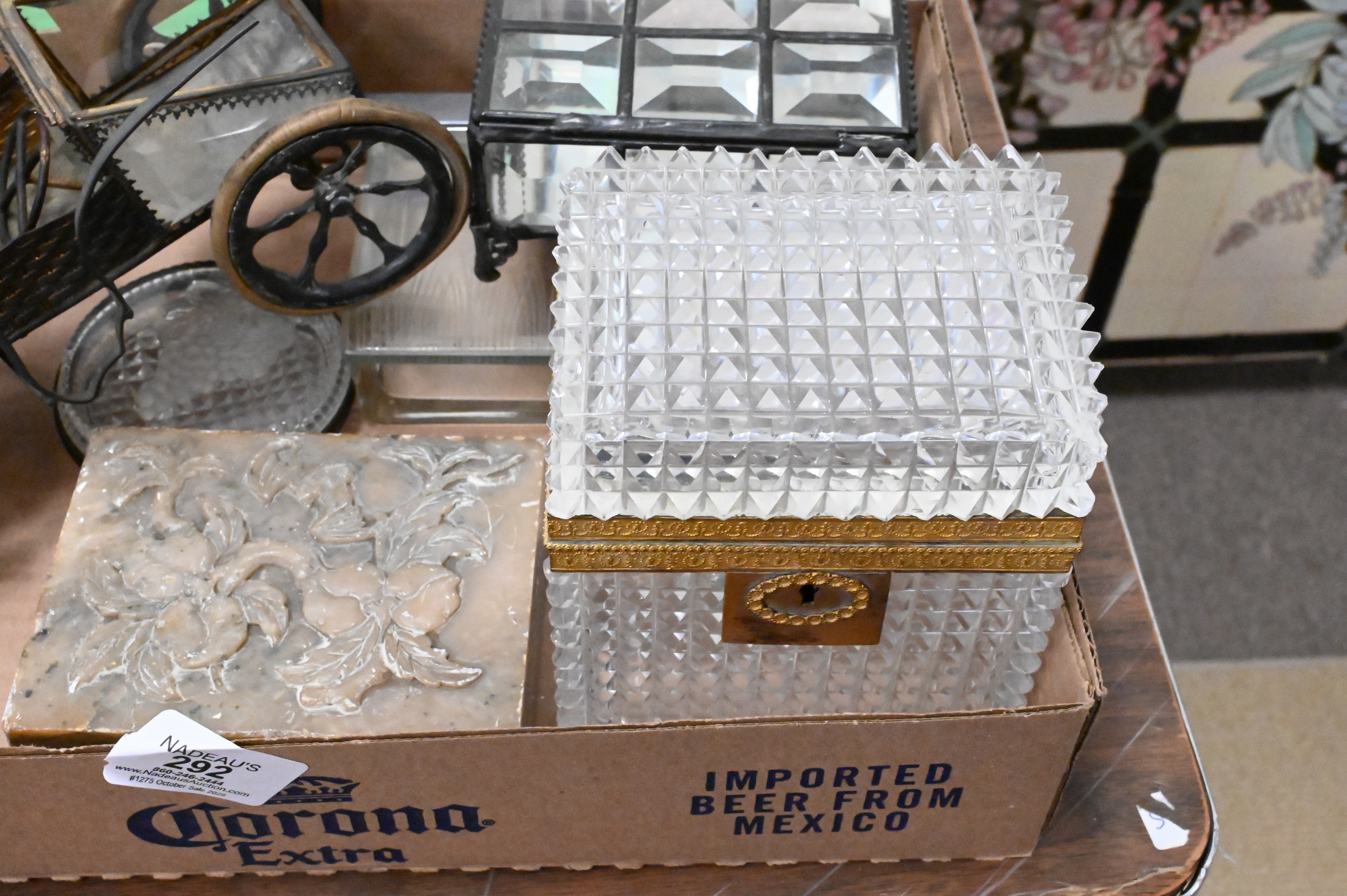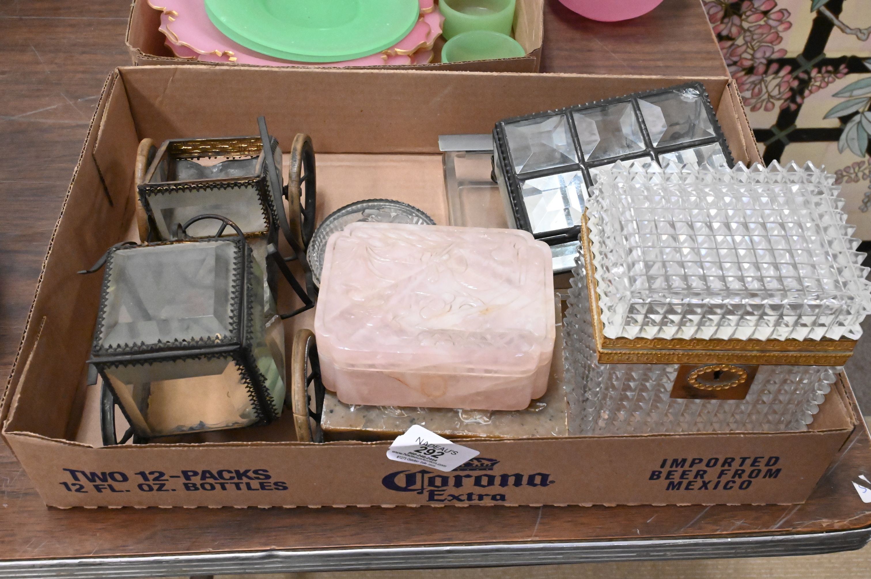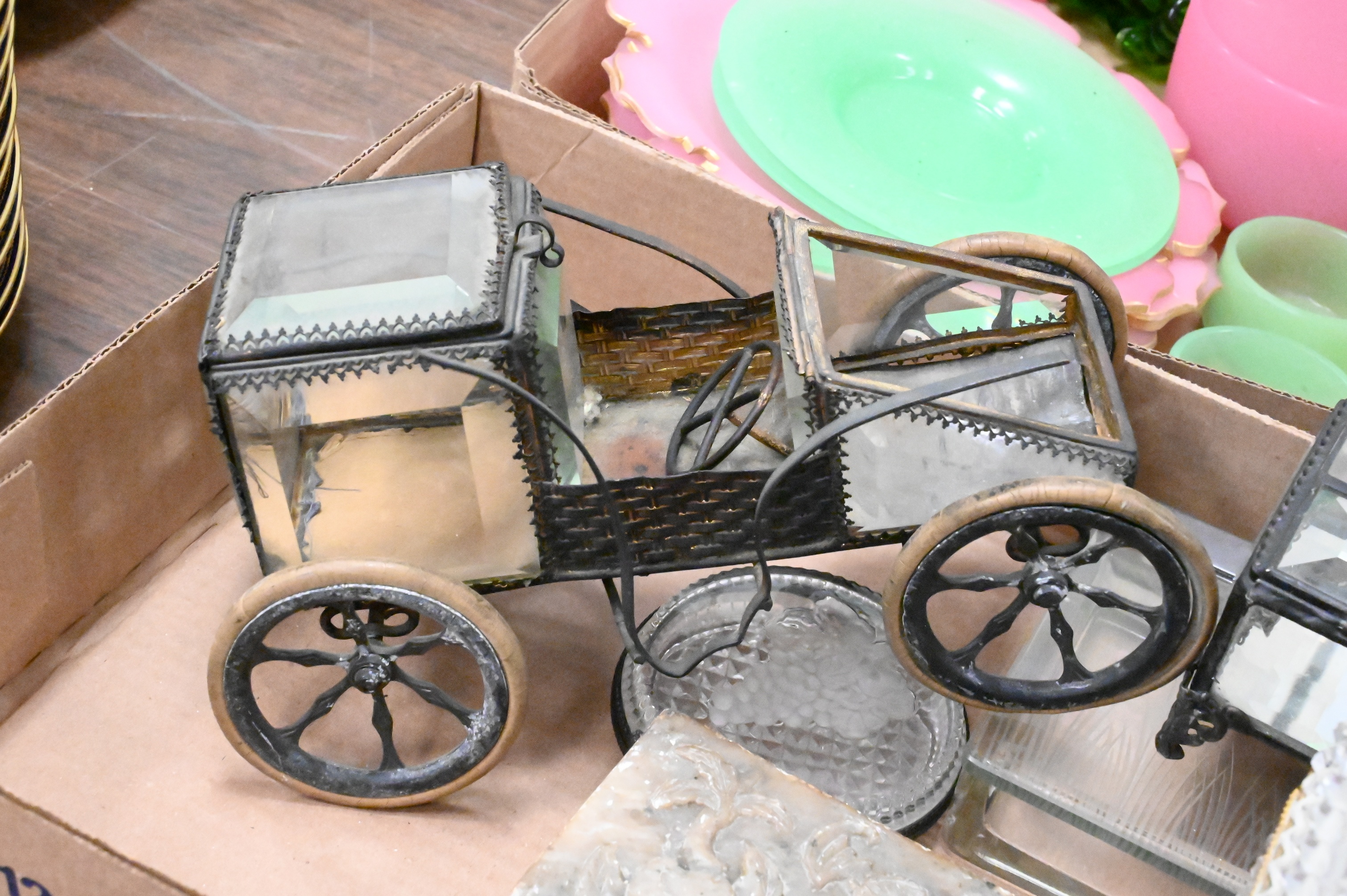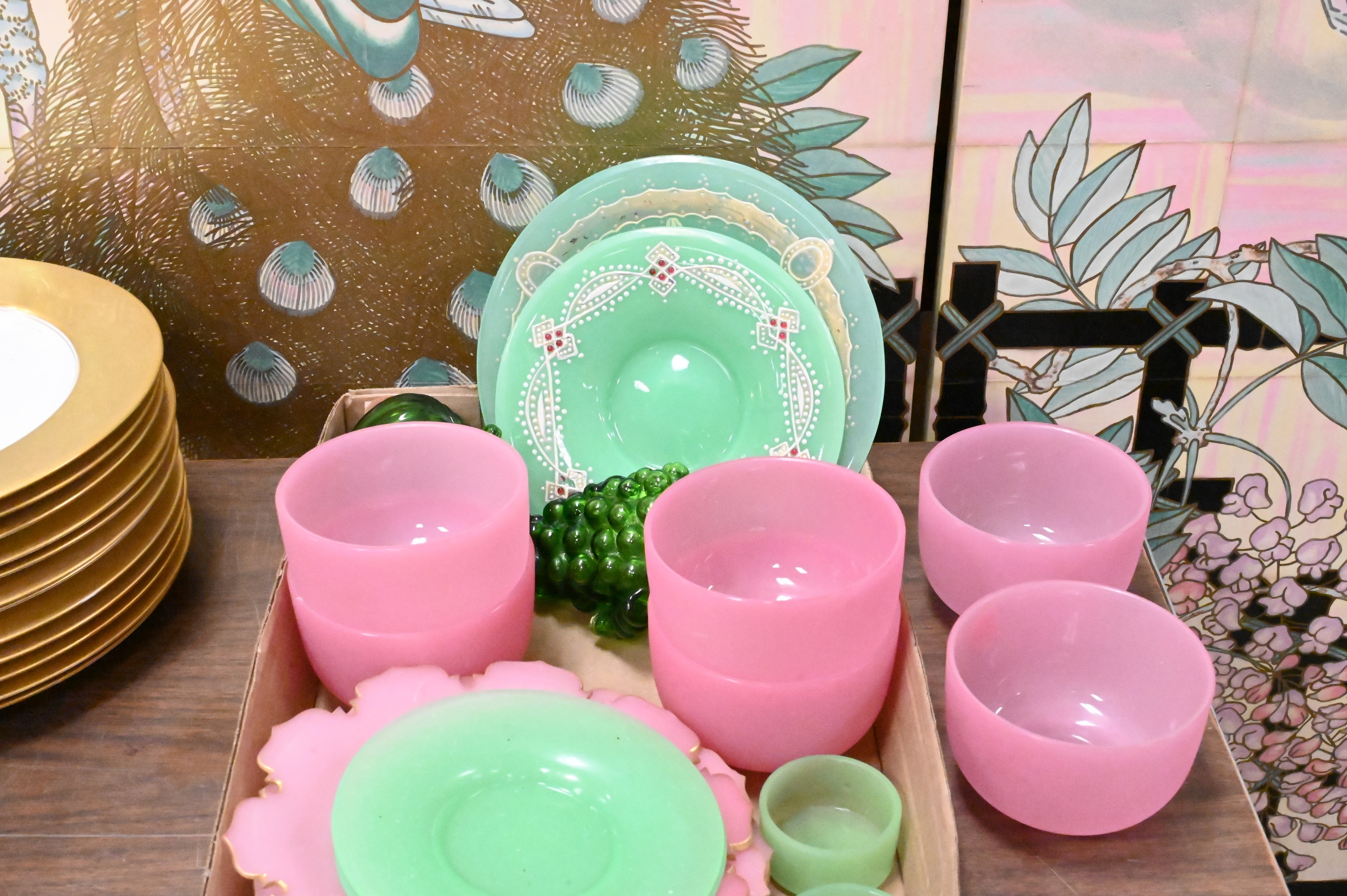 to include glass fruit, several boxes, pink and green glass bowls, and plates