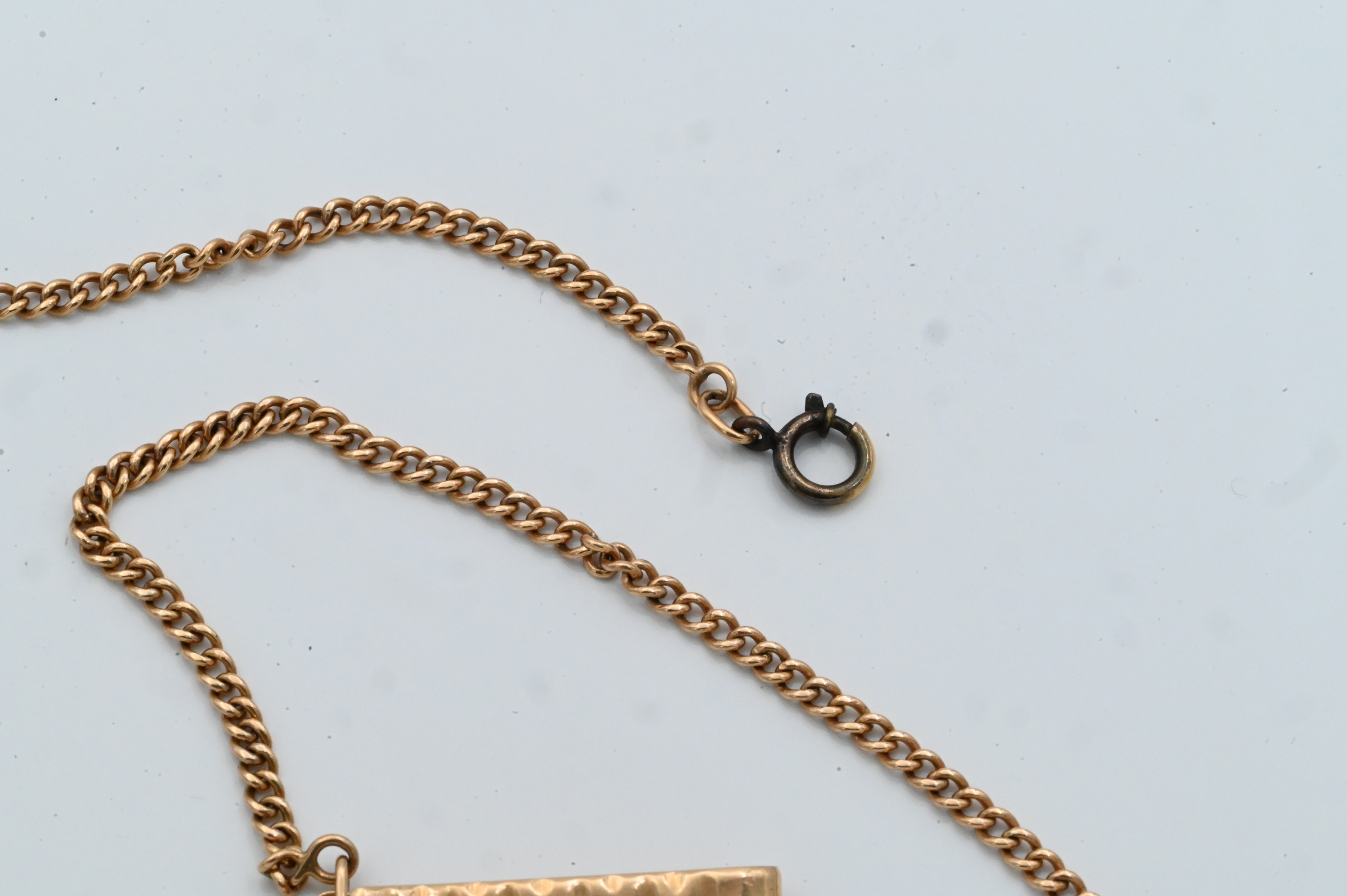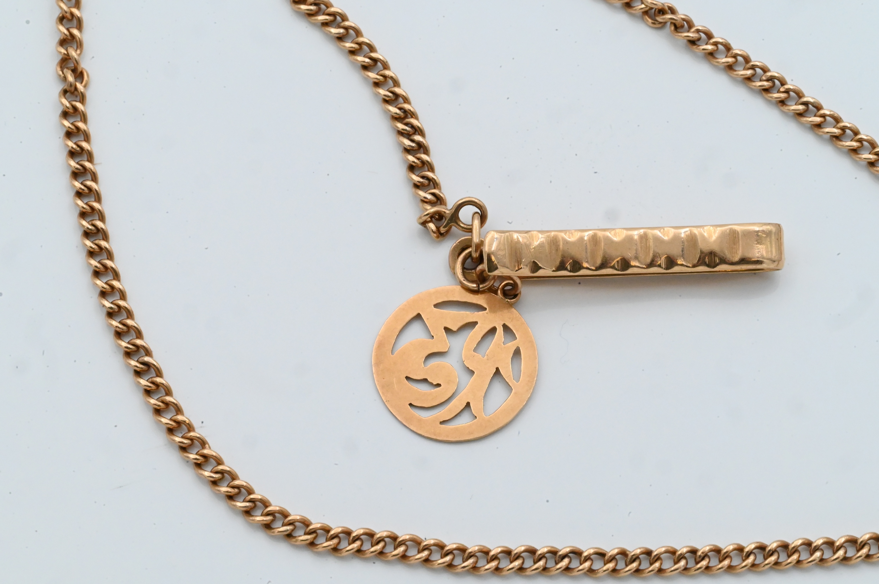 Composed of a 14K yellow gold curb link chain with textured bar and circular openwork monogram fob, total length 17 1/2 inches; total weight 18.9 grams.