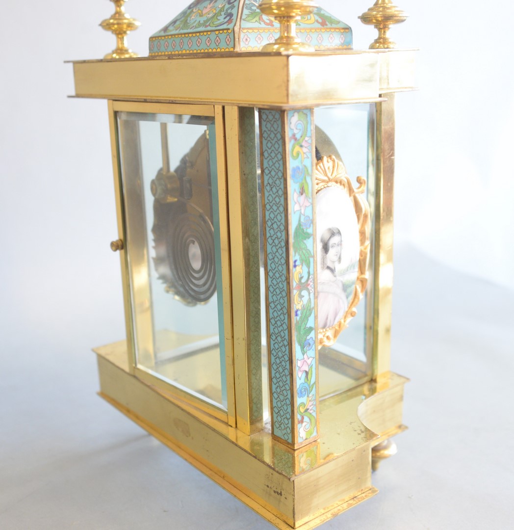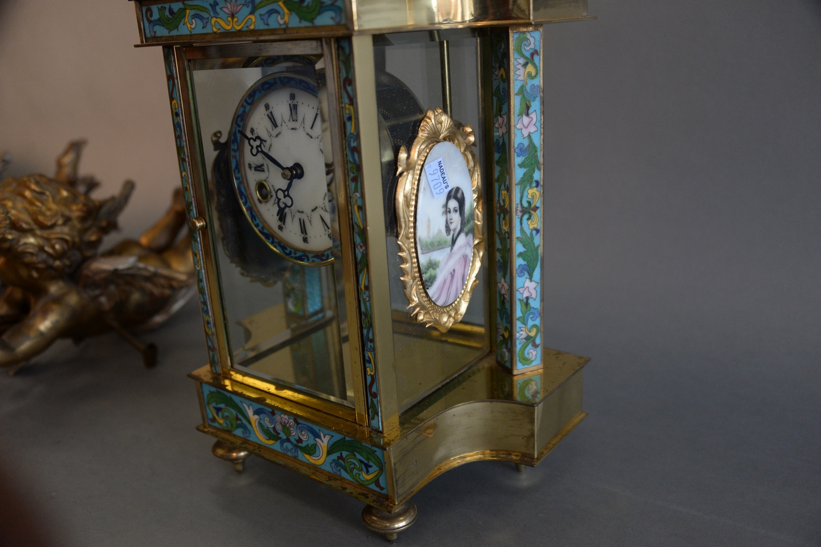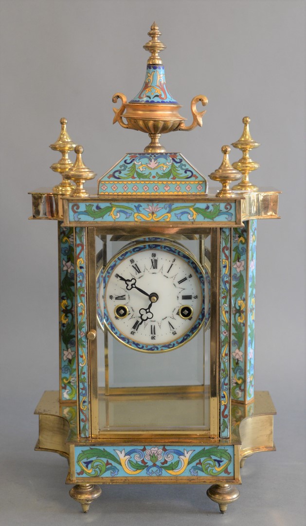 Lot 293: Cloisonne and Brass Regulator Clock with painted side panels height 20 inches, width 10 7/8 inches