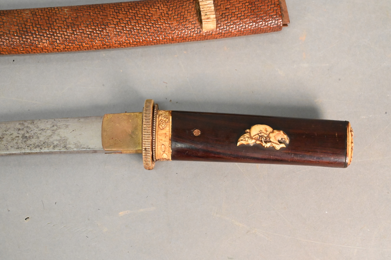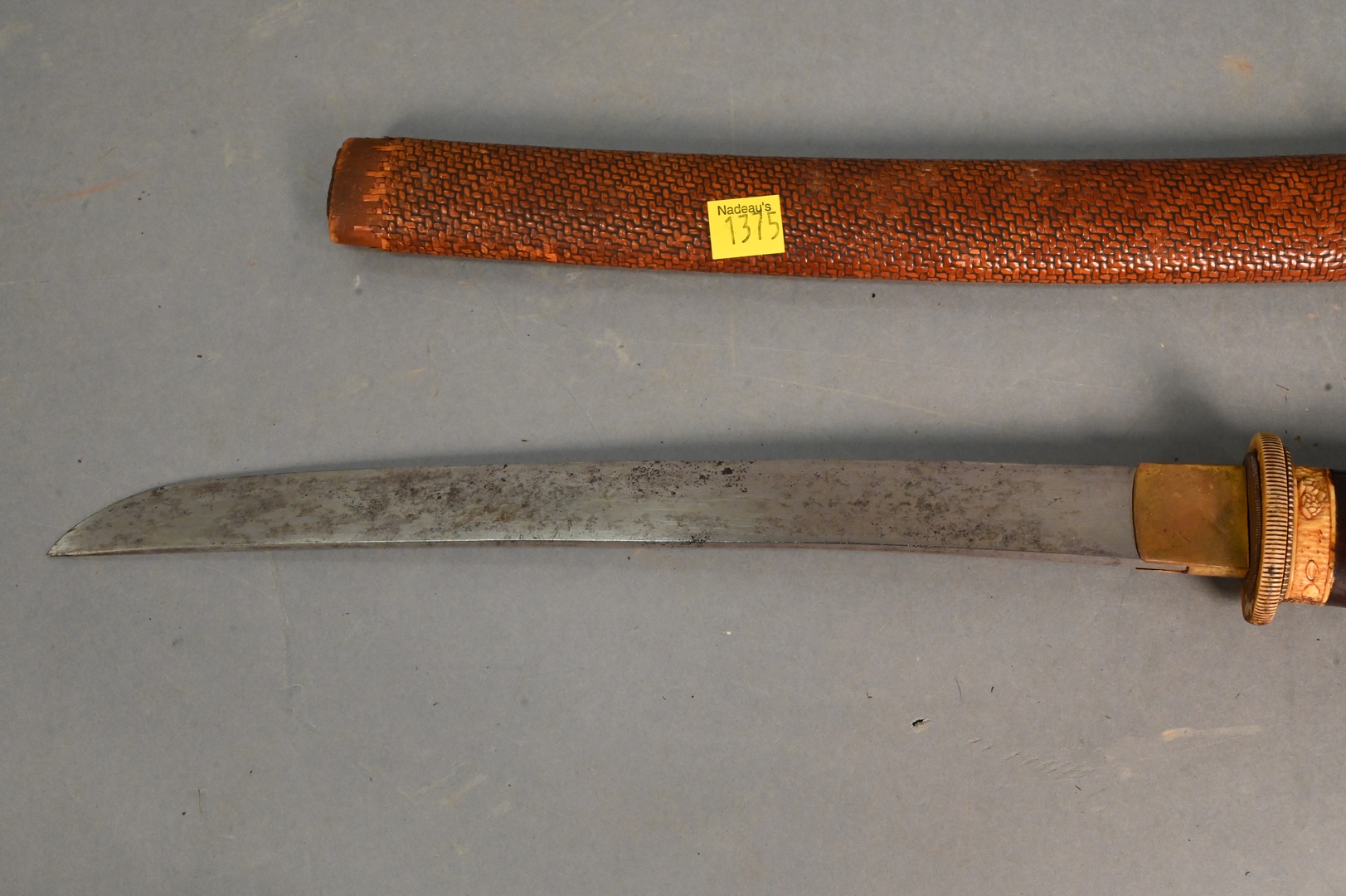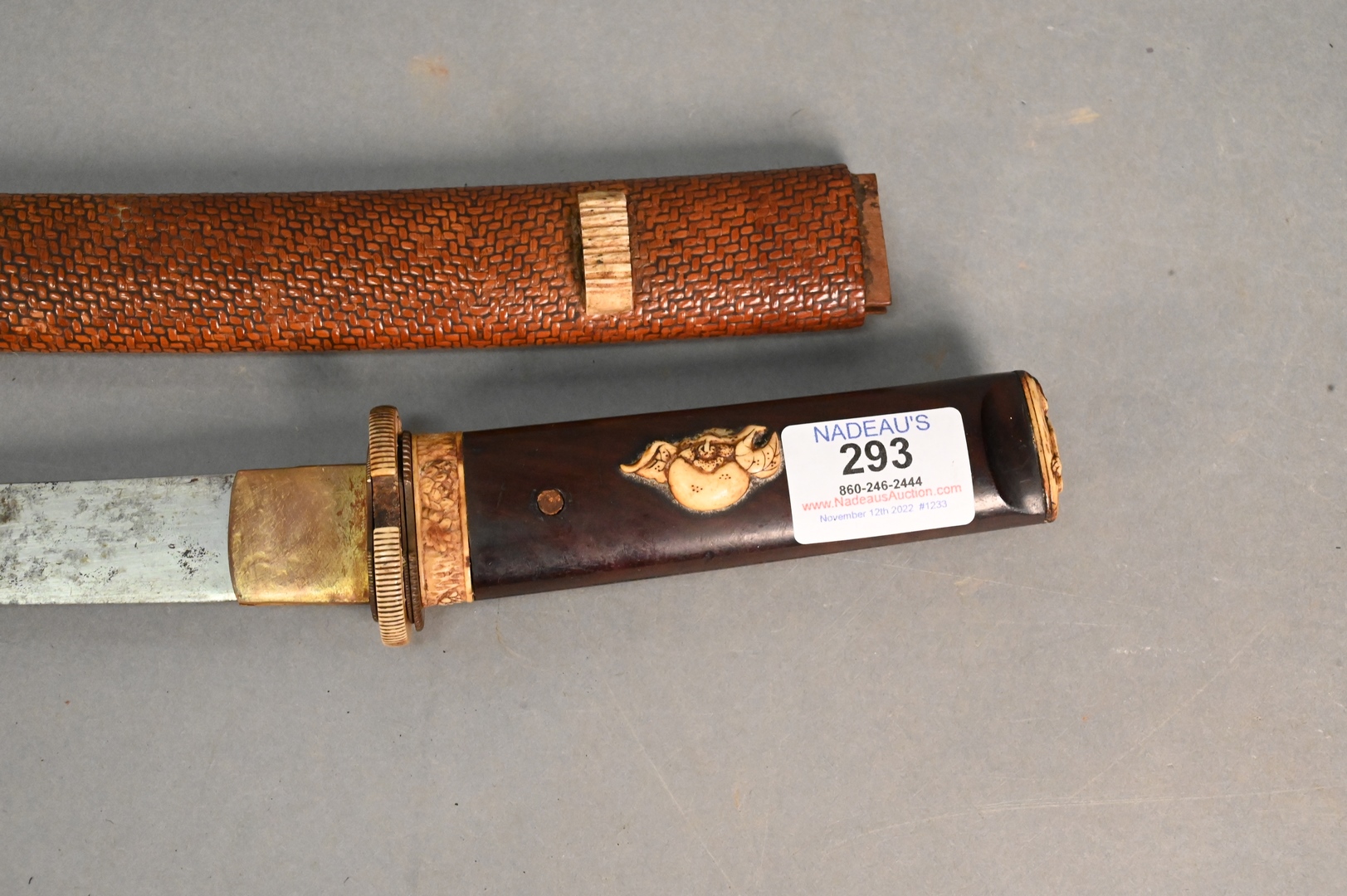 Early Japanese Samurai Sword, having wood Tsuka handle along with a woven Saya sheath, total length 20 inches, Provenance: Estate of Cyril H. Moore Jr, Kent, Connecticut.