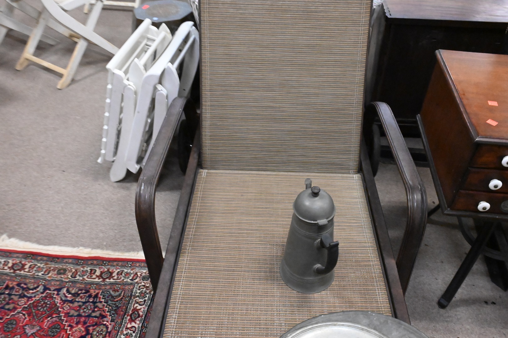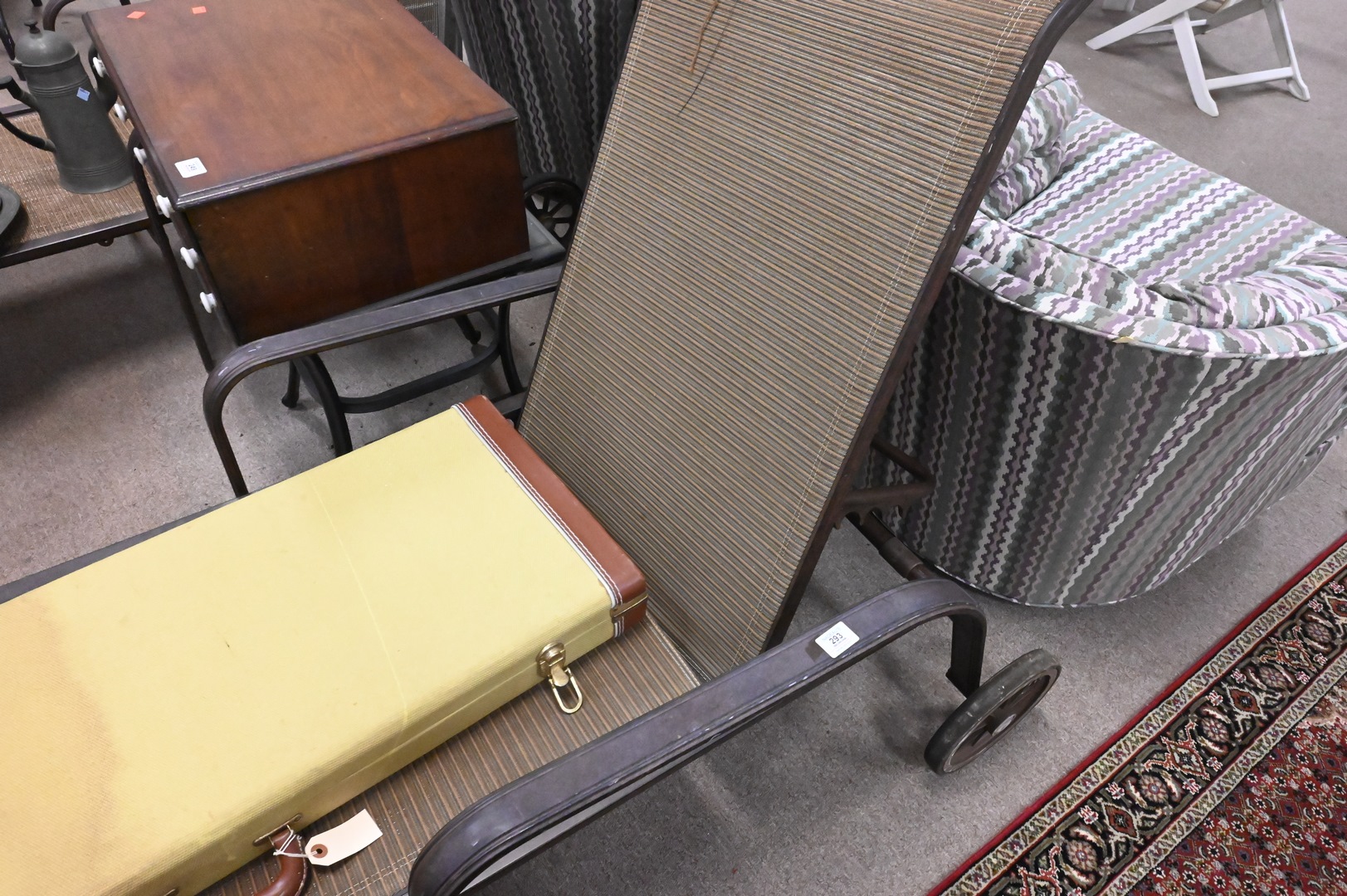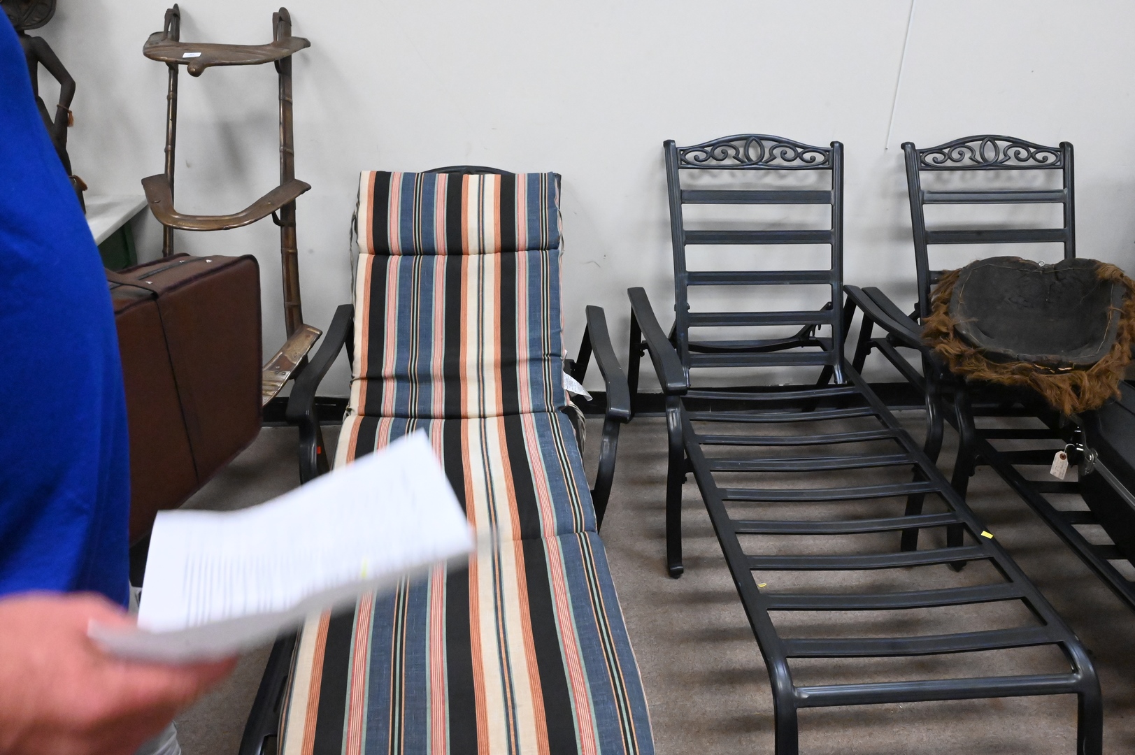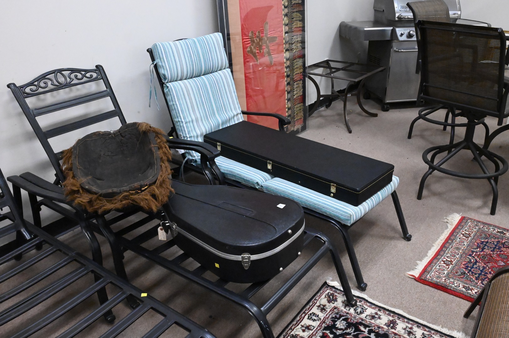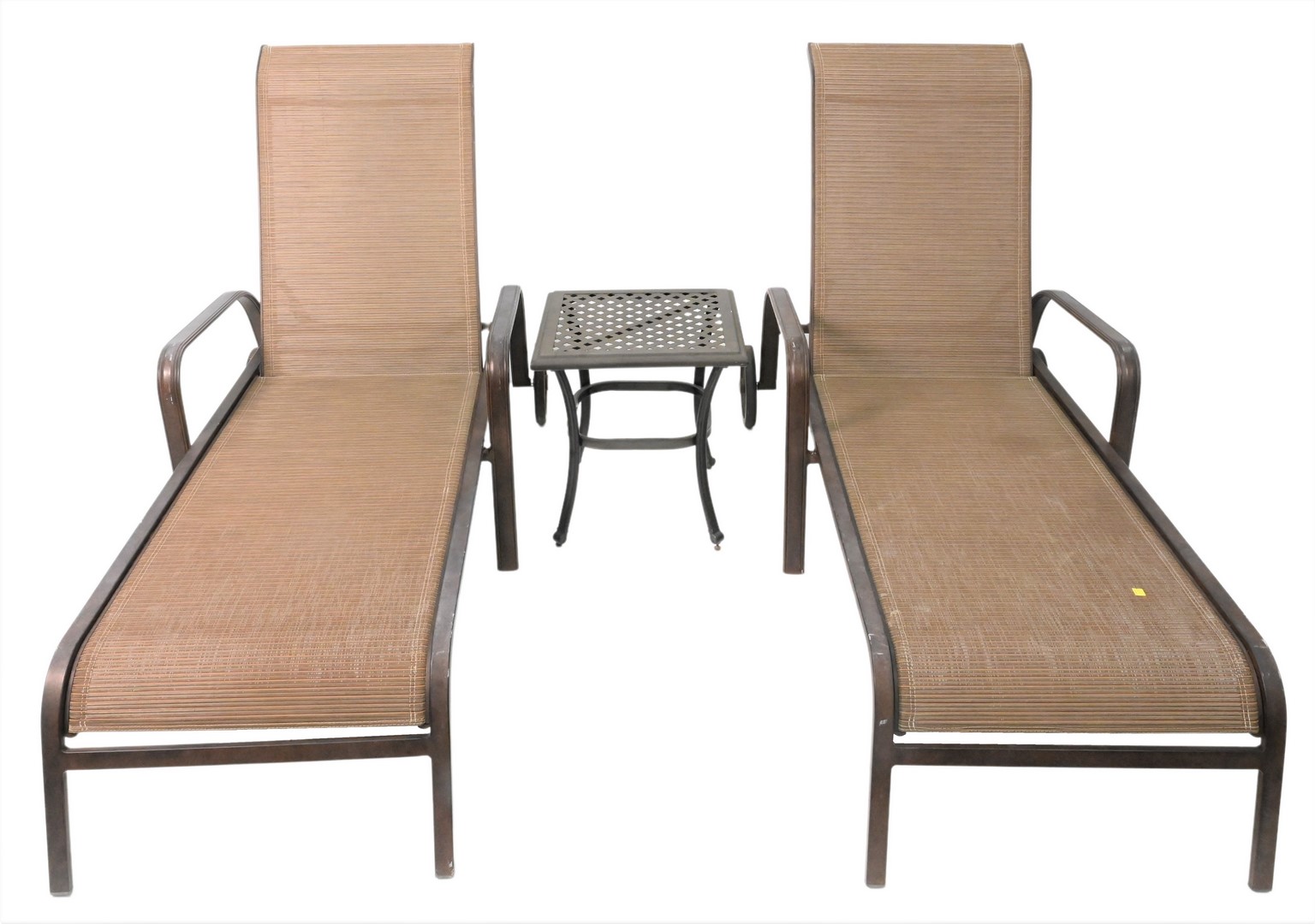 Eight Piece Outdoor Lot, to include six chaise lounges, length 72 inches, with two cushions; adjustable umbrella; along with a side table.