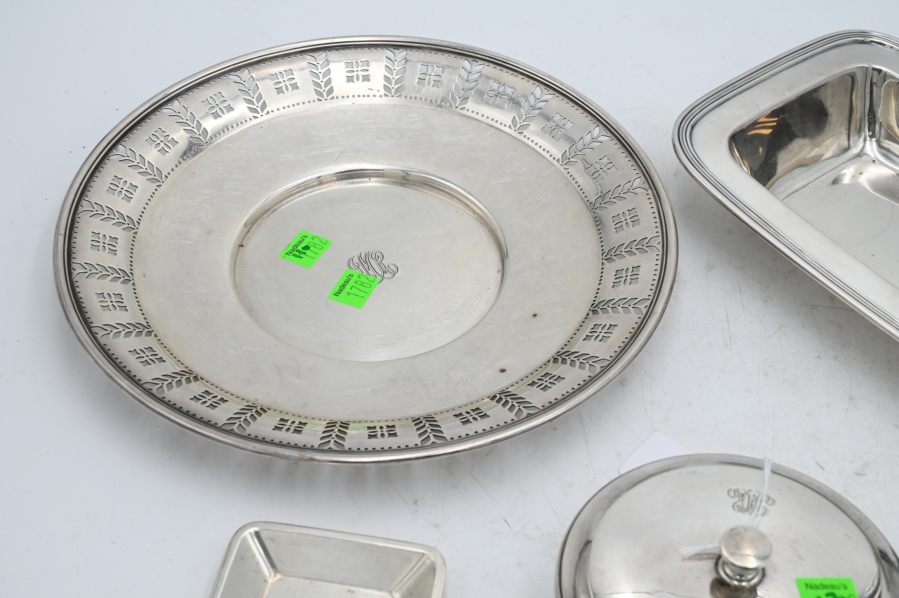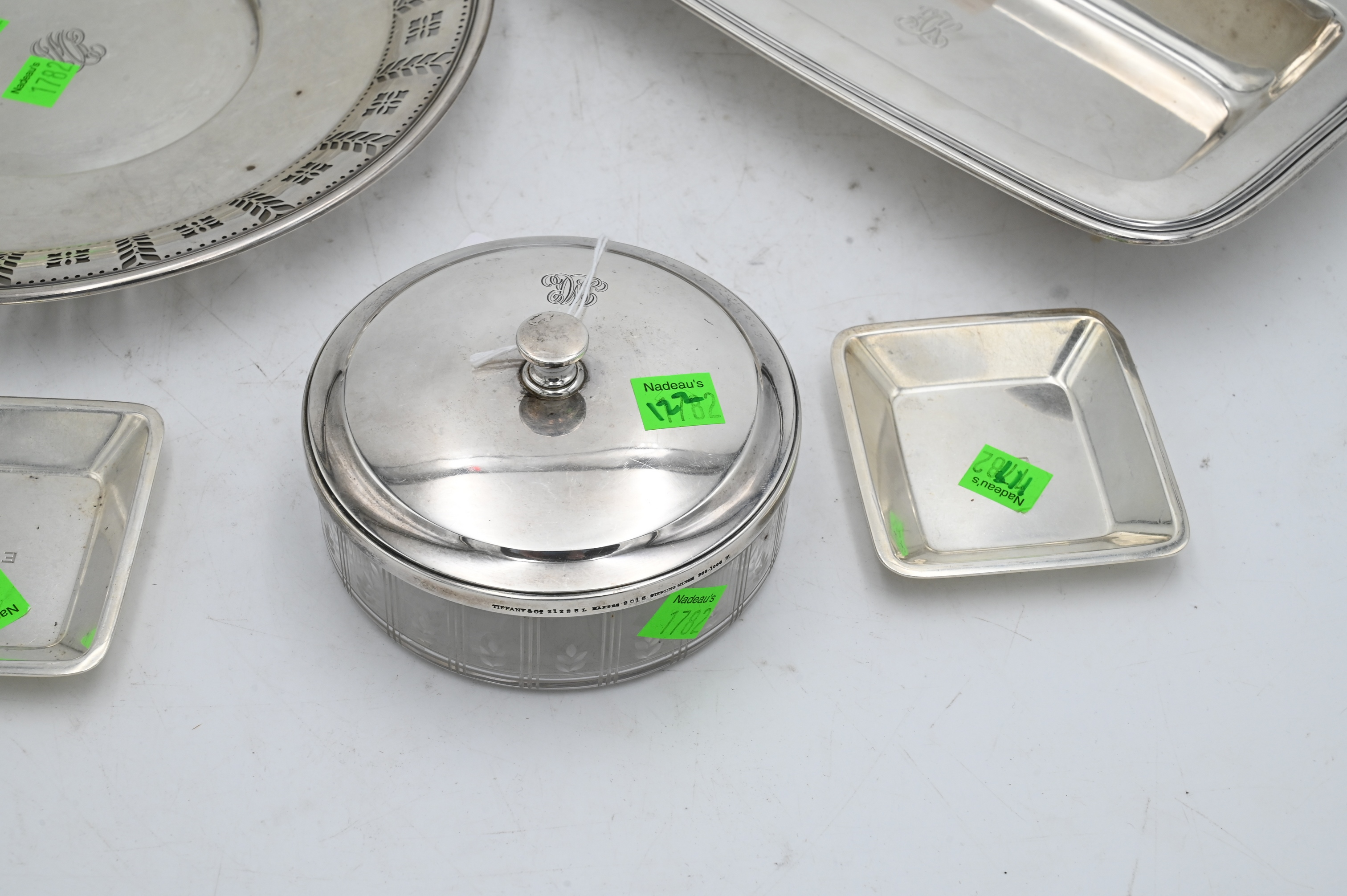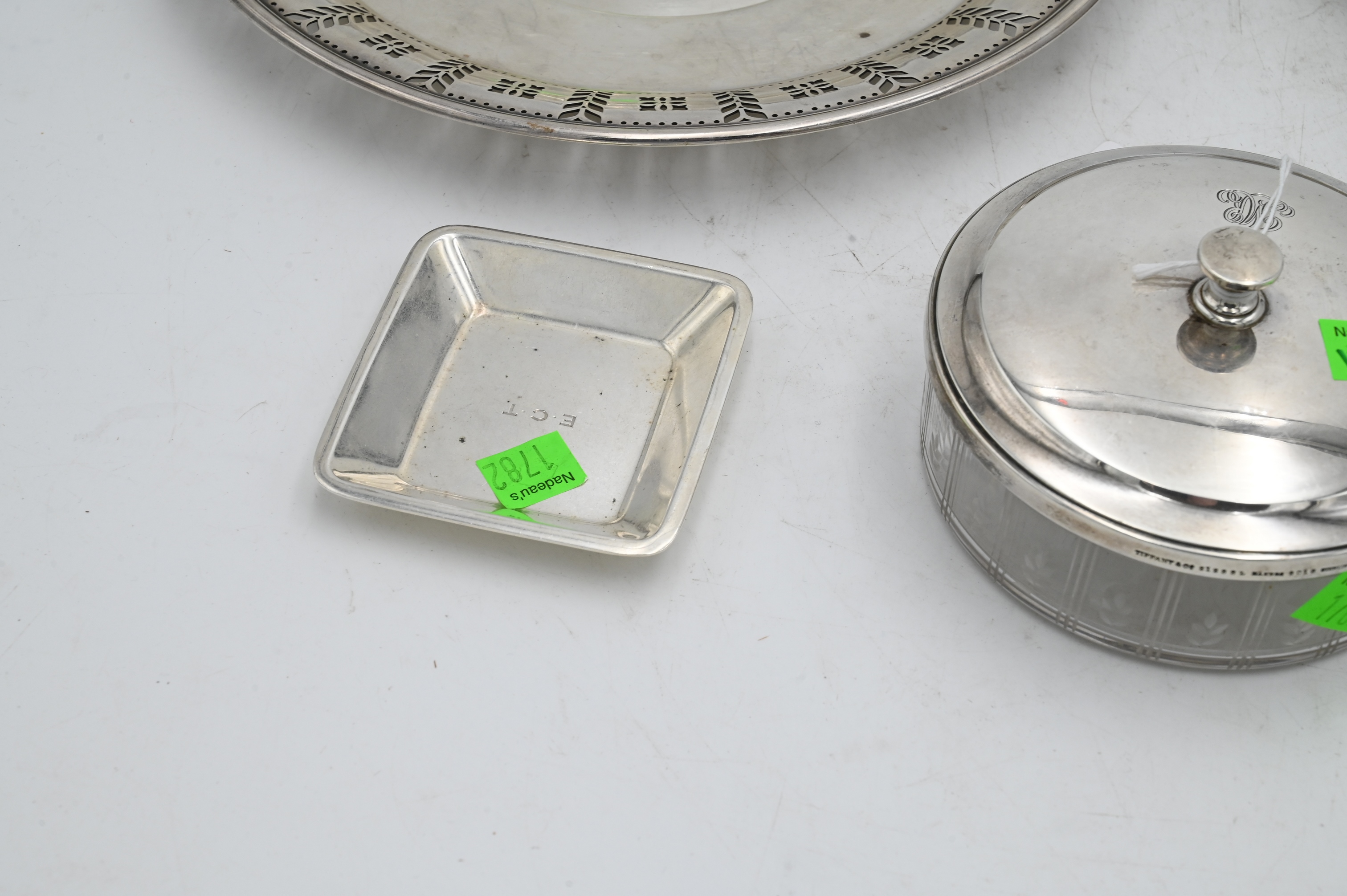 two monogrammed one round with reticulated border one rectangular shaped dish, two small trays, powder jar having sterling top
