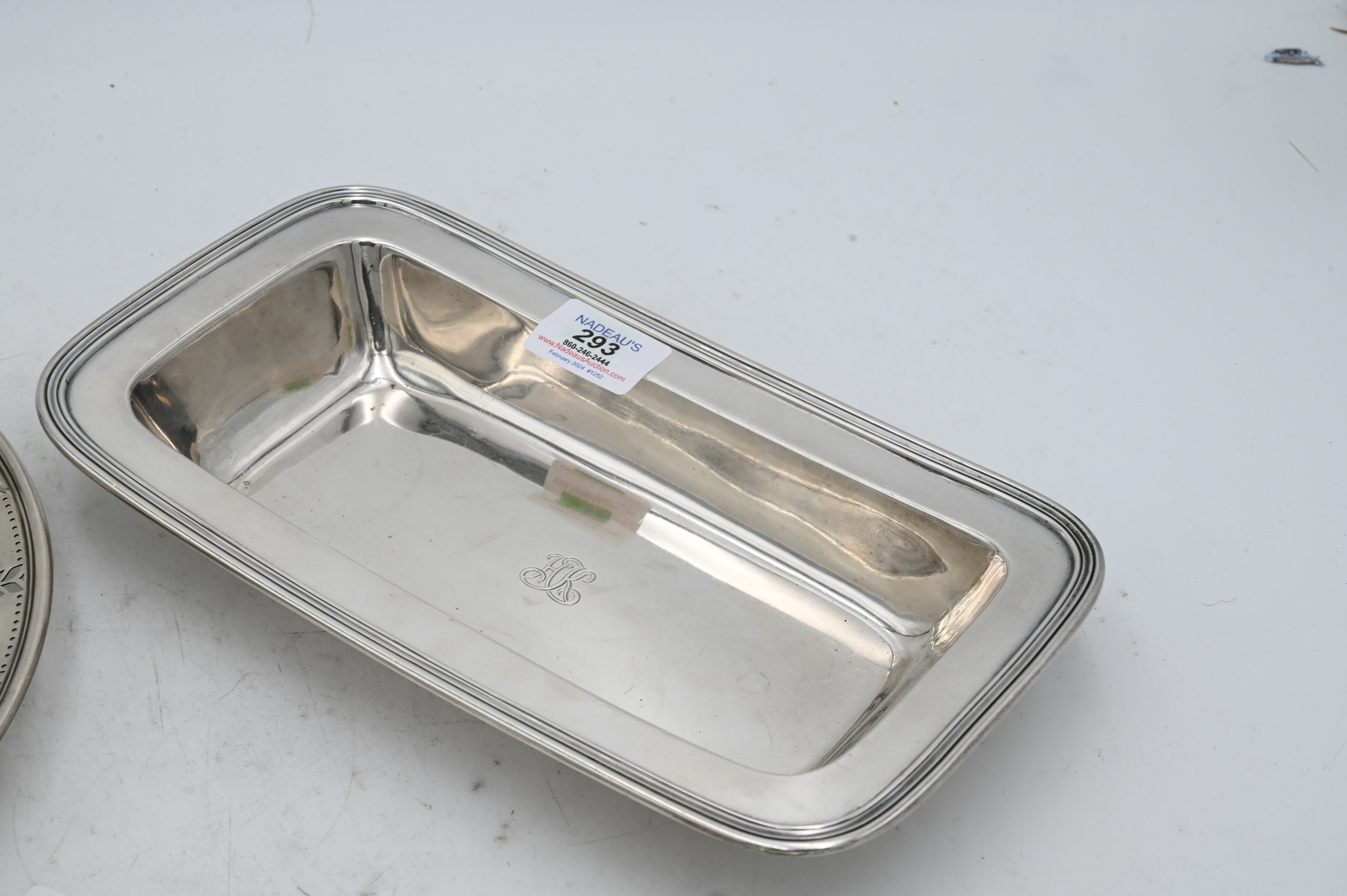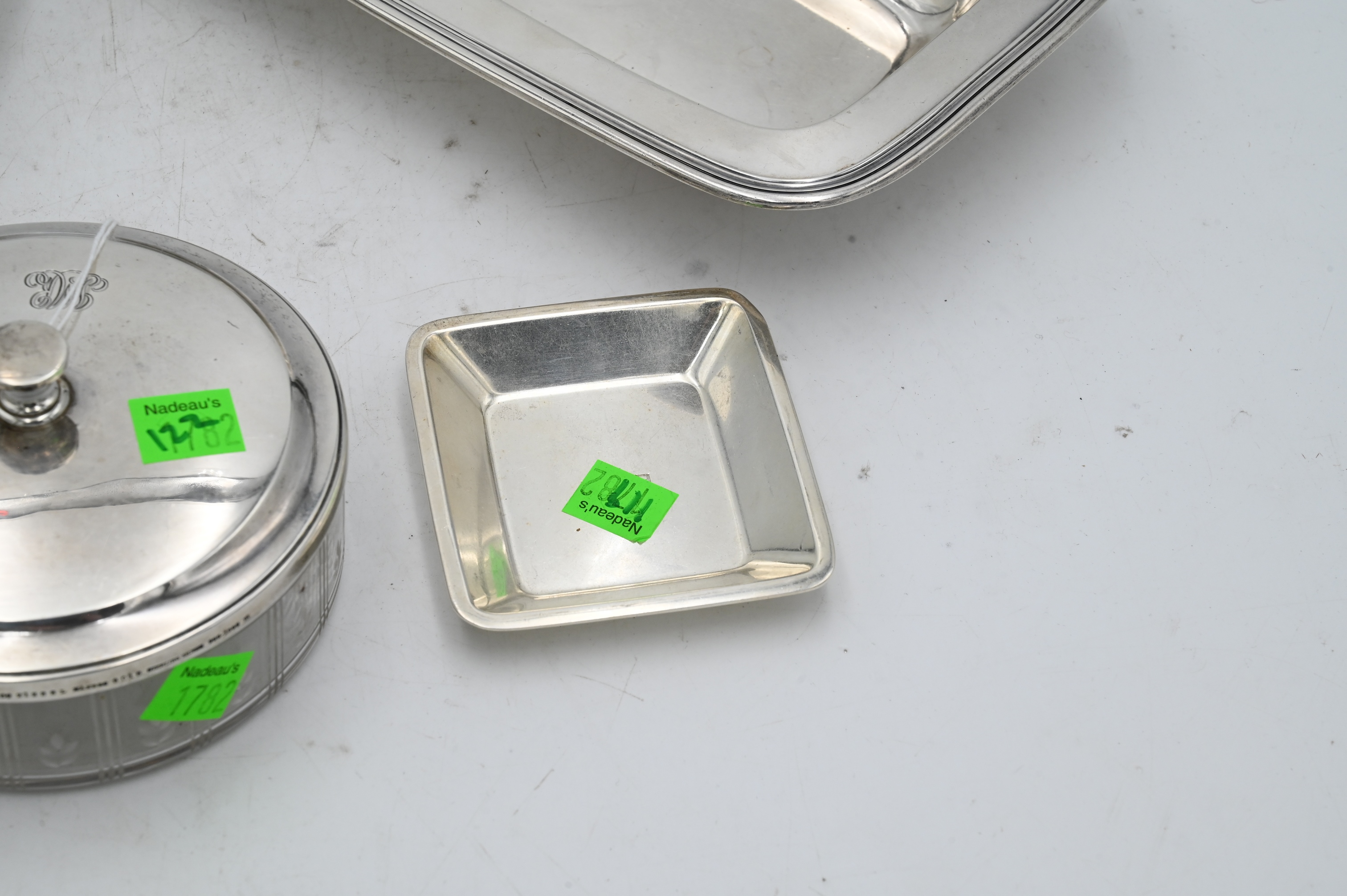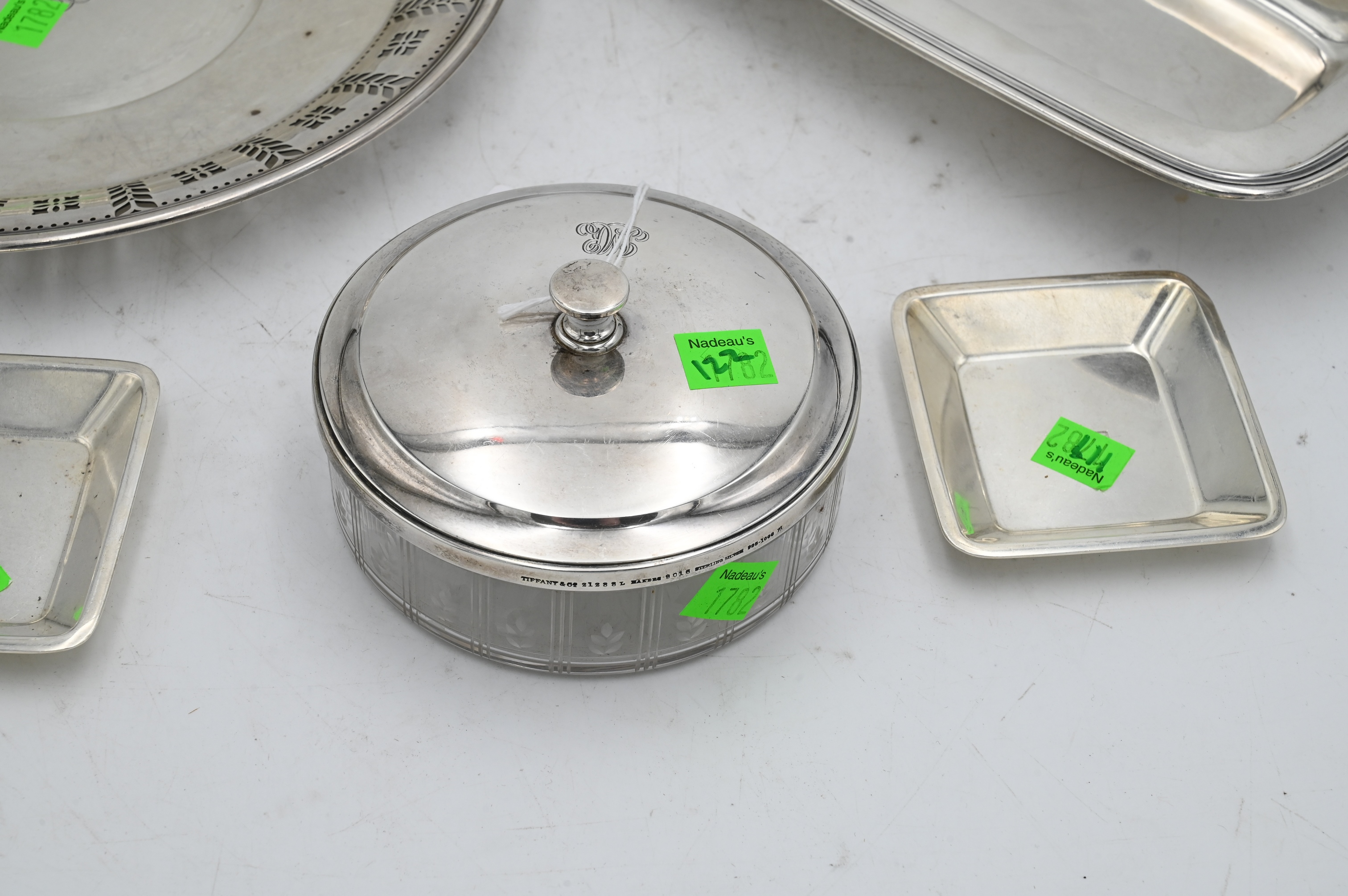 two monogrammed one round with reticulated border one rectangular shaped dish, two small trays, powder jar having sterling top