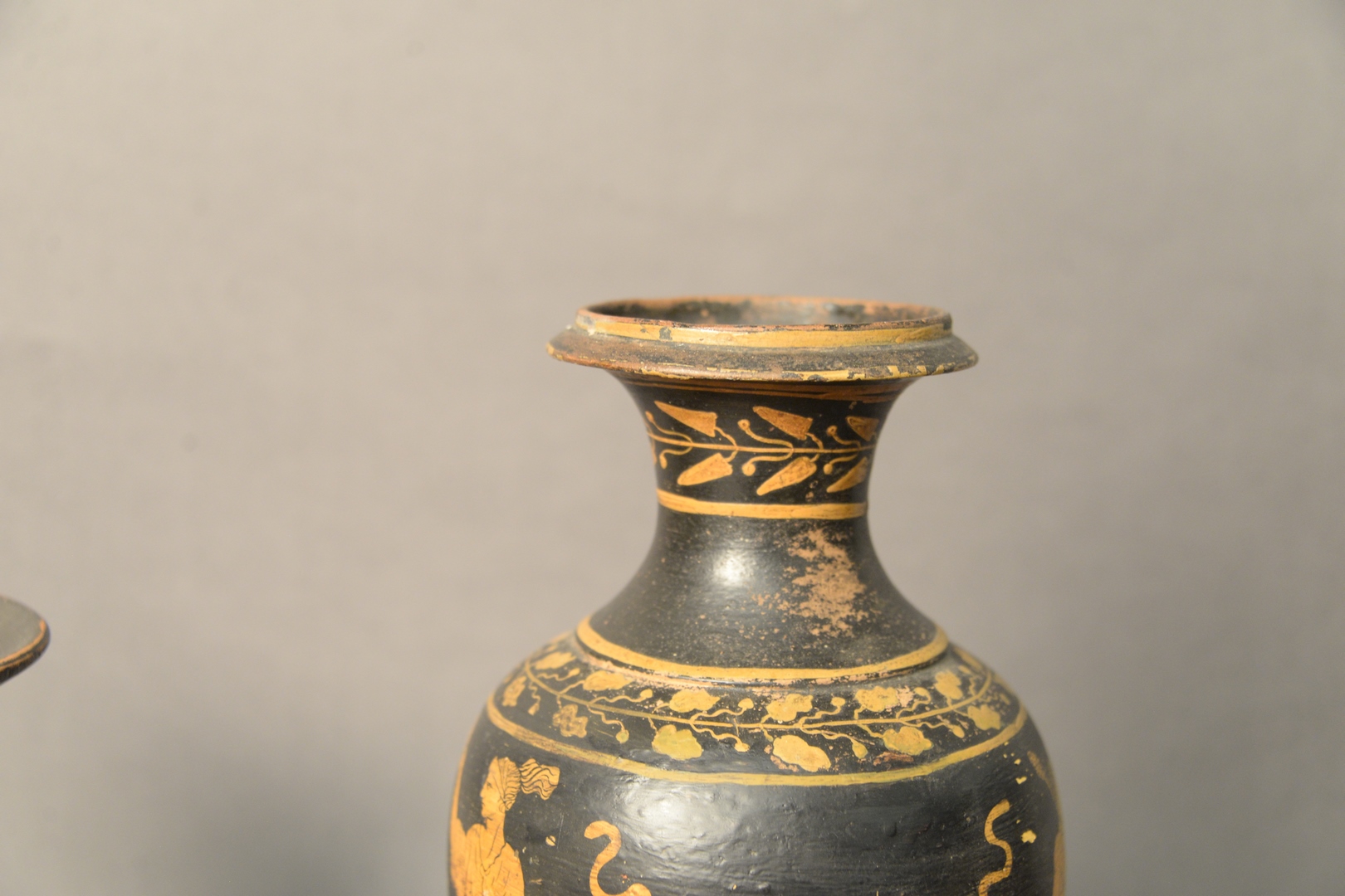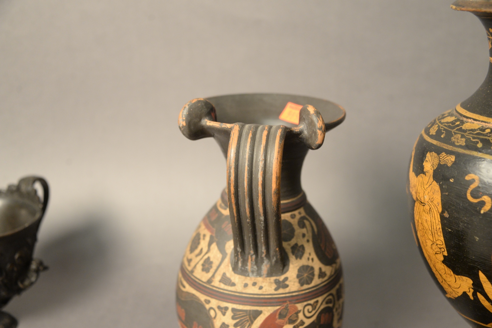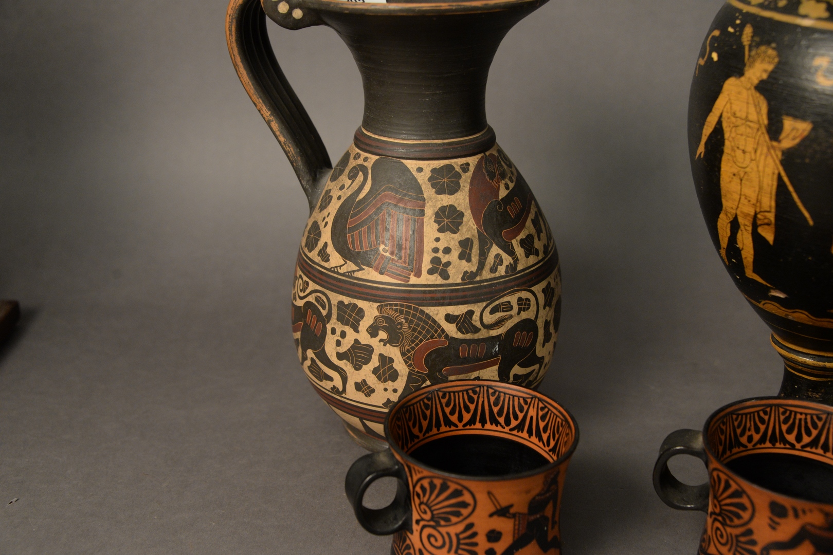 Lot 293: Four Piece Group of Greek Revival Pottery, to include a pair of red and black cups, marked illegibly on the bottom a pitcher painted with animals along with a vase with classic Greek figures, height 13 1/2 inches.