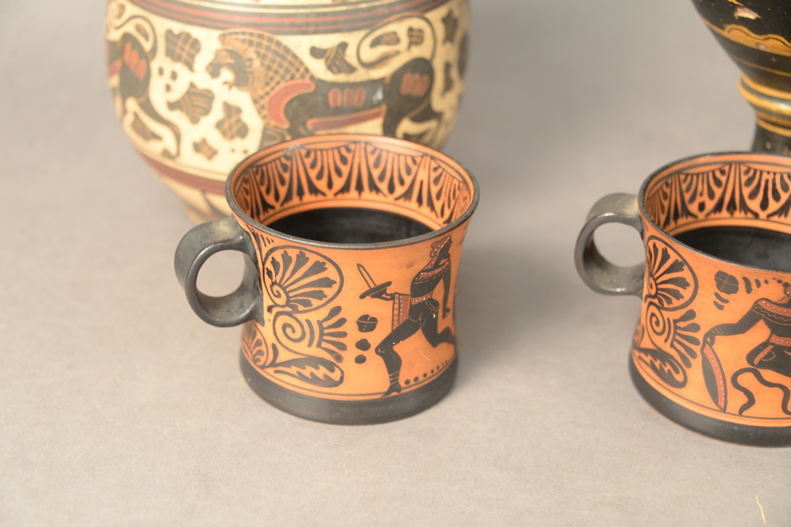 Four Piece Group of Greek Revival Pottery, to include a pair of red and black cups, marked illegibly on the bottom a pitcher painted with animals along with a vase with classic Greek figures, height 13 1/2 inches.