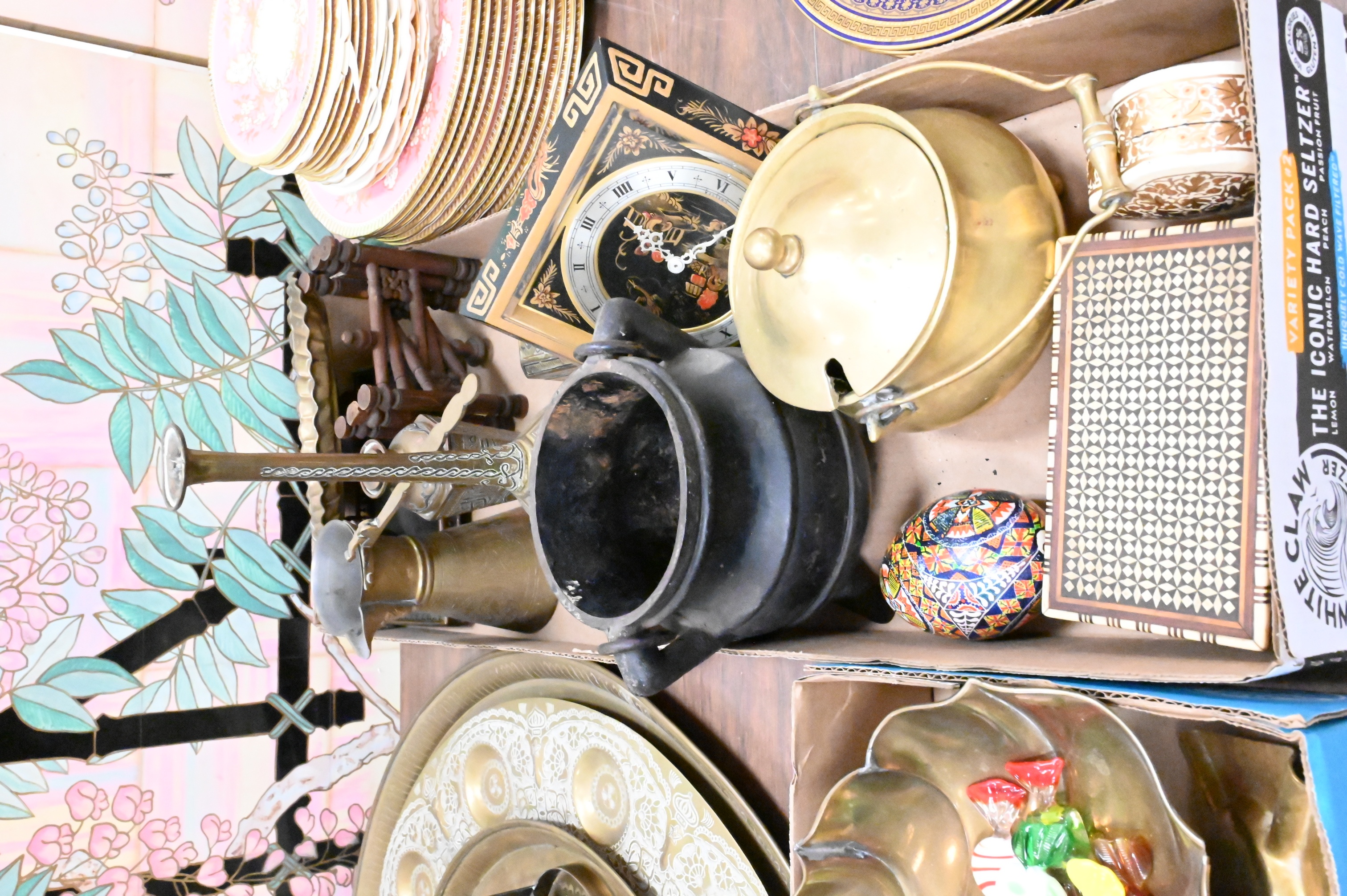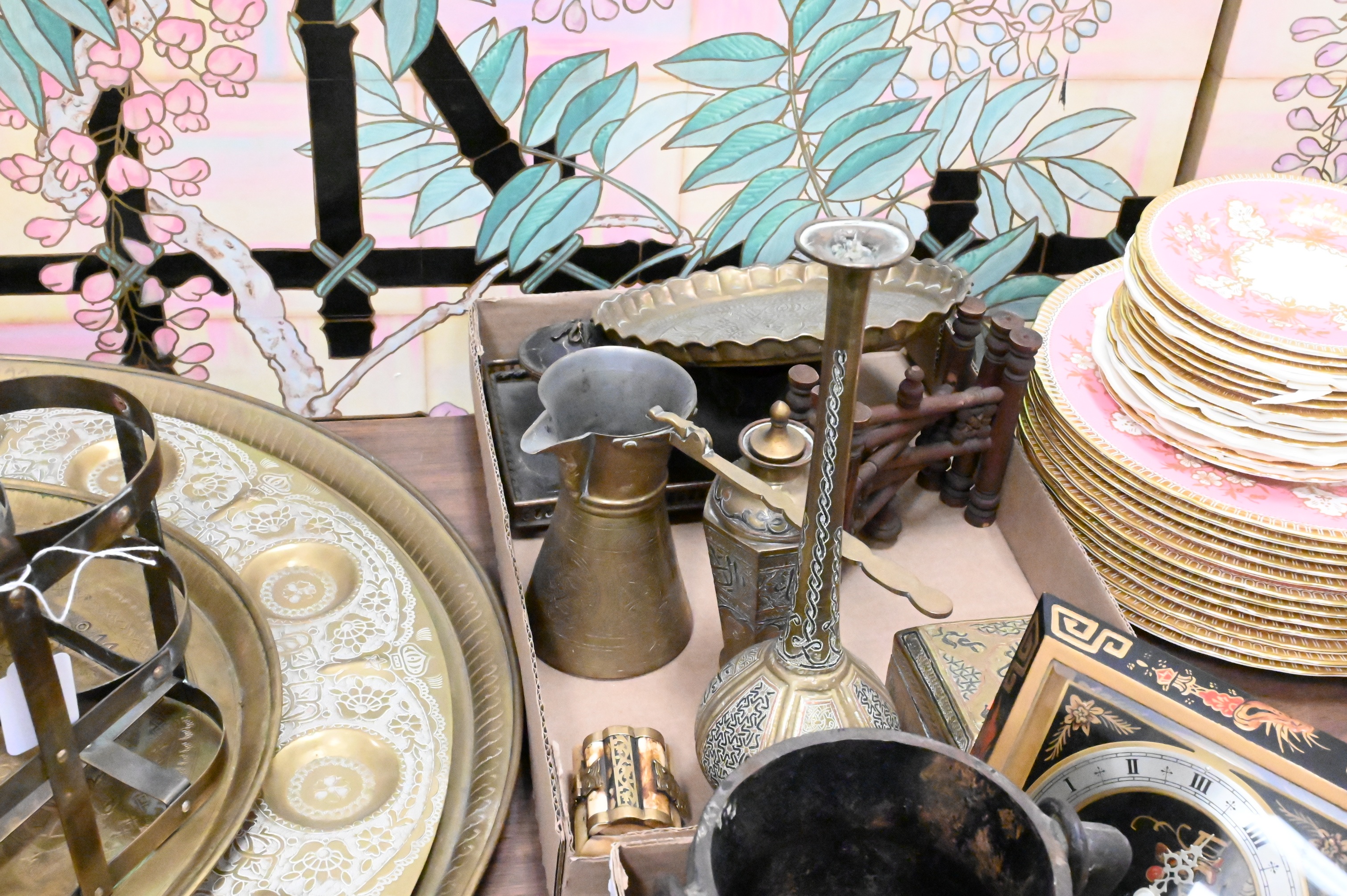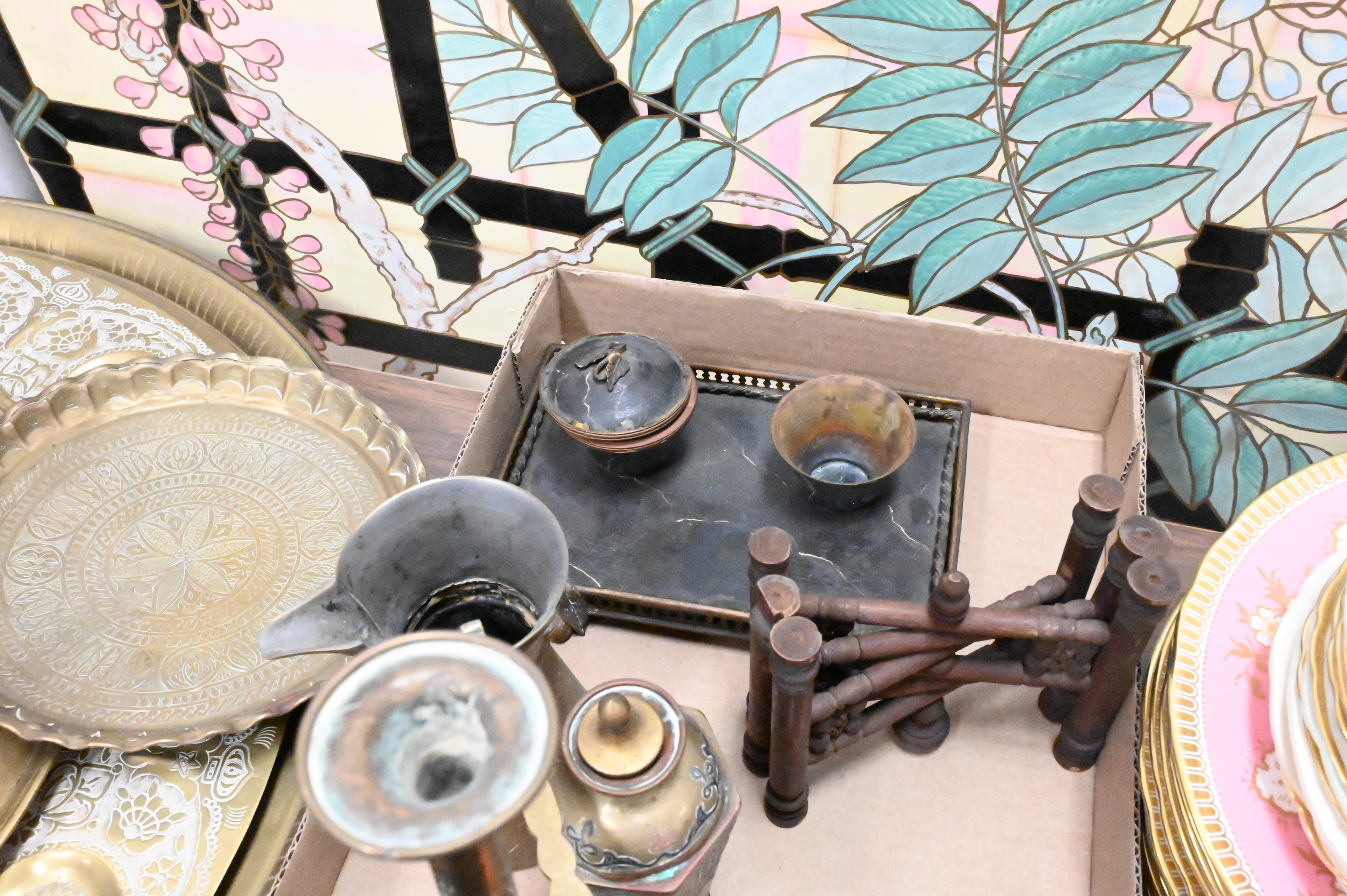 Turkish coffee pot, cigarette dish, small bowls, copper inlaid trinket box, Morrocan spice tray, along with cauldrons, inlaid boxes, inkwell etc..