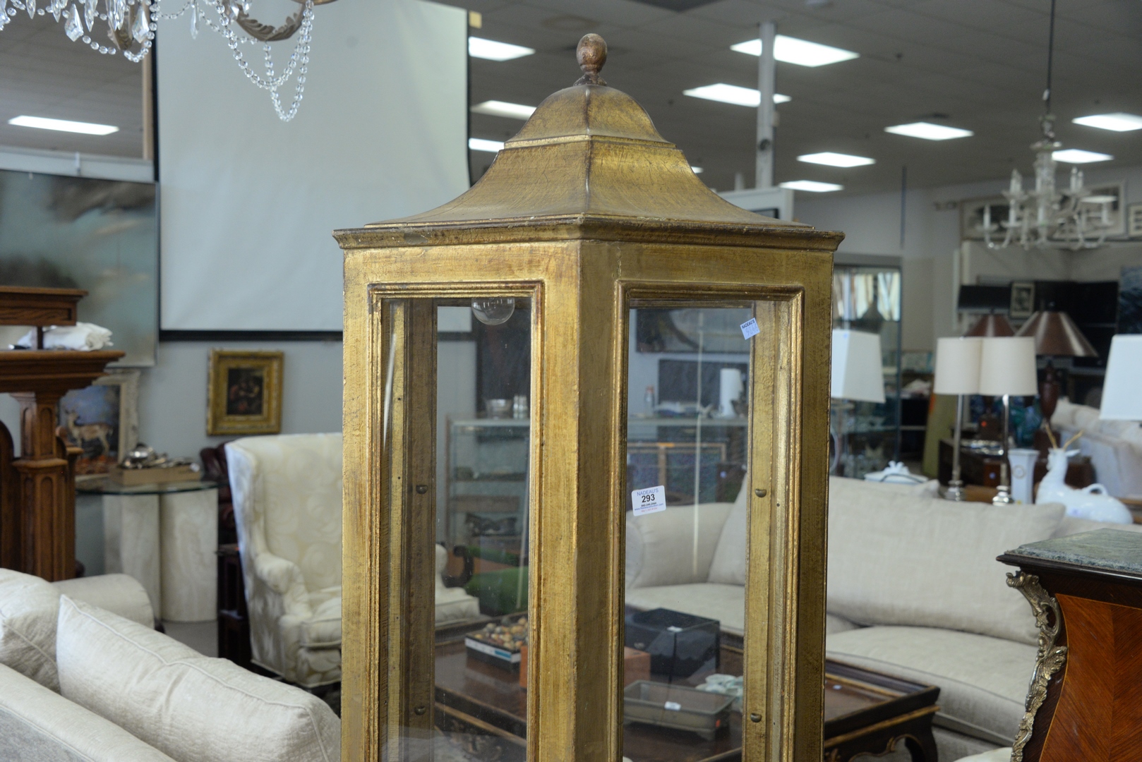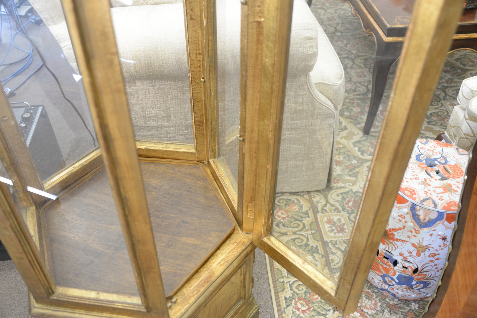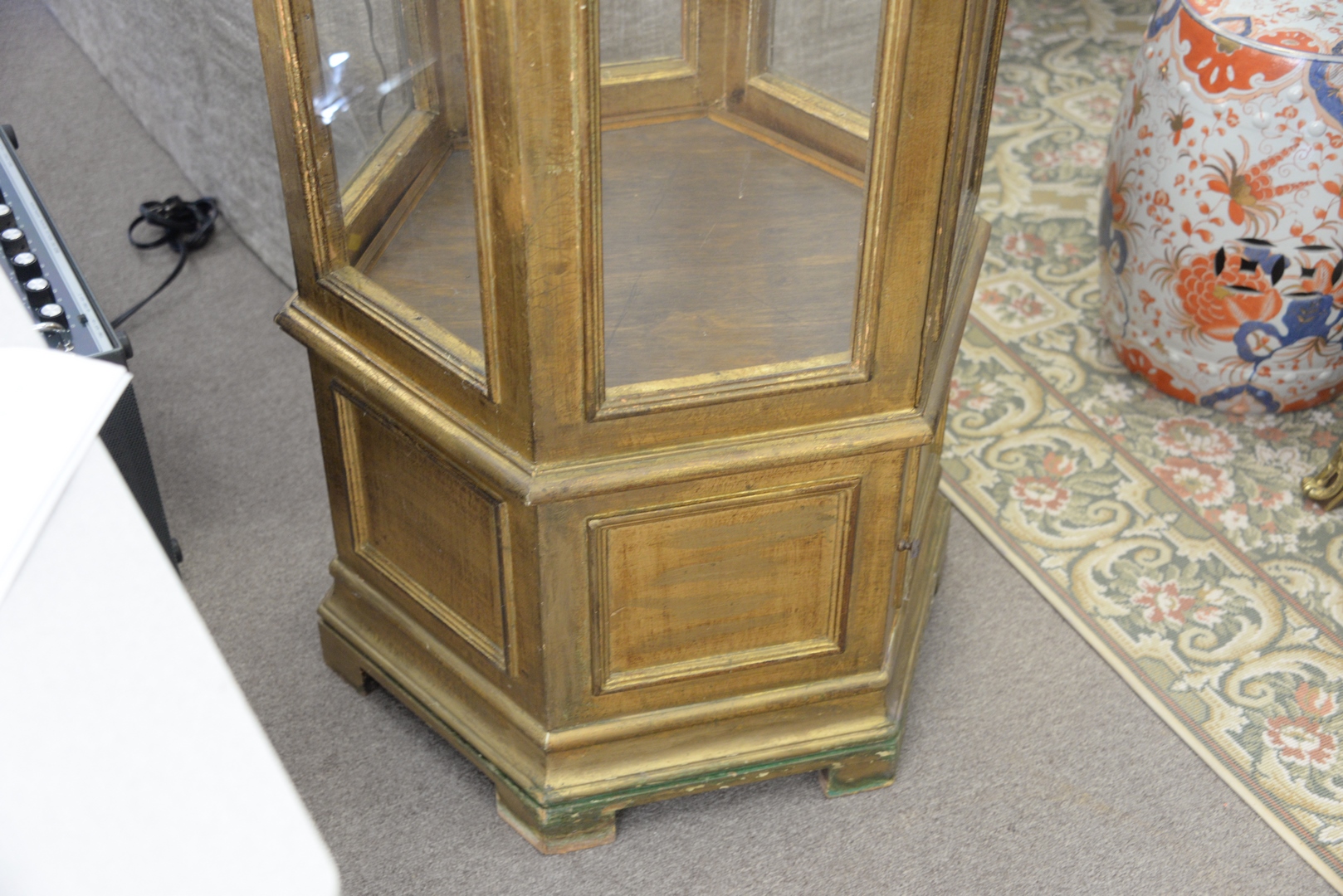 Lot 293: Gilt Curio Cabinet having pagoda type top, six sided with glass shelves, height 74 inches, width 24 inches.