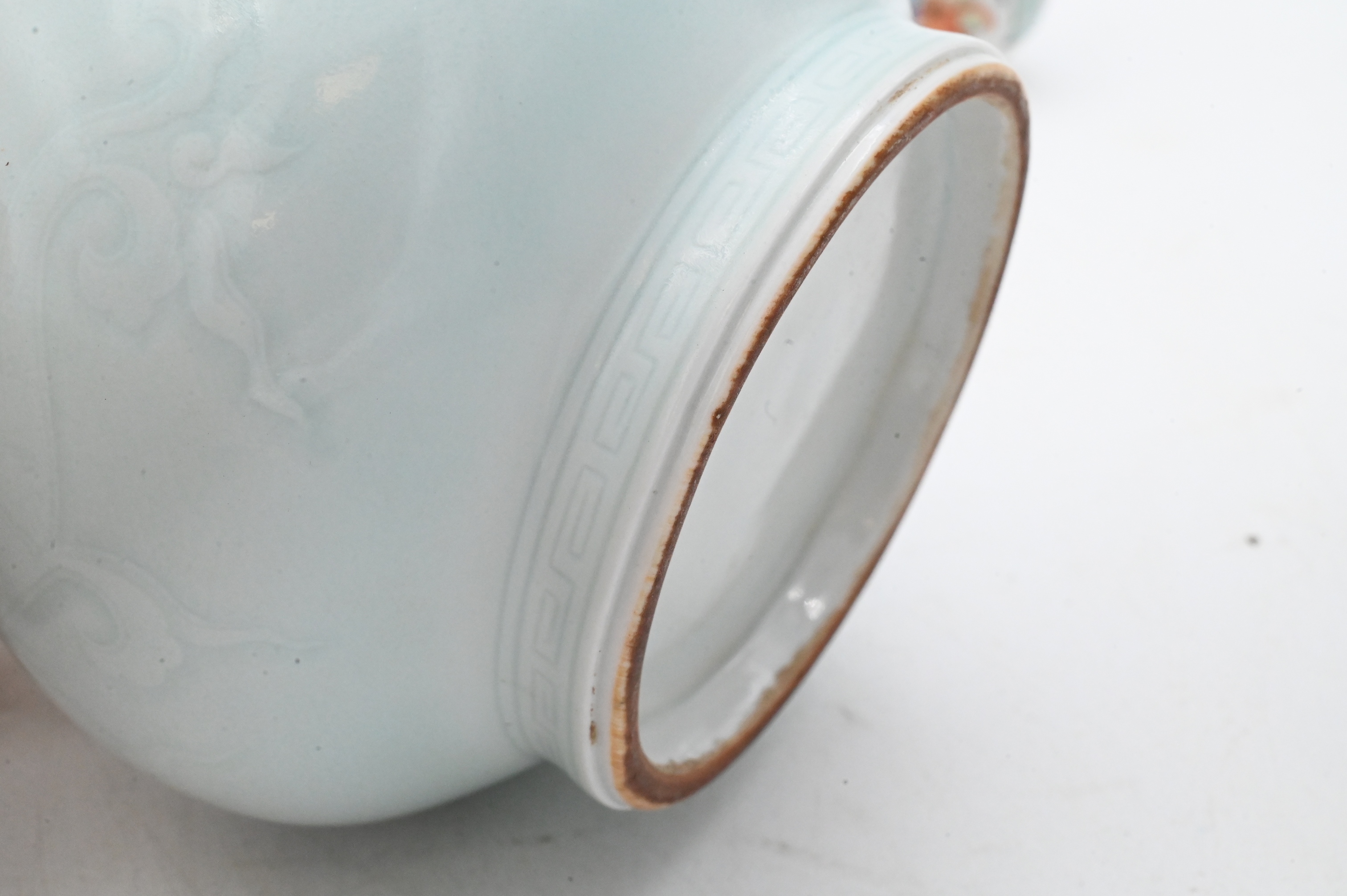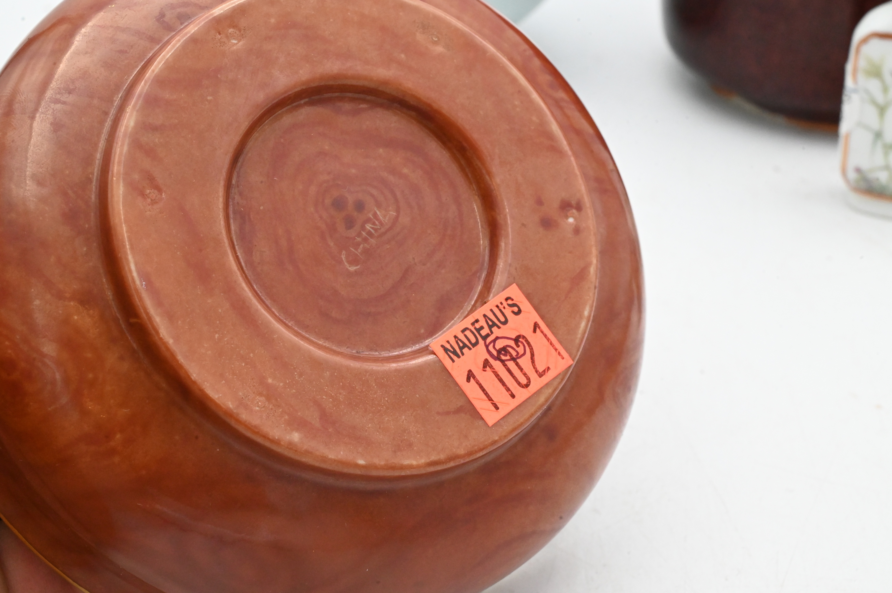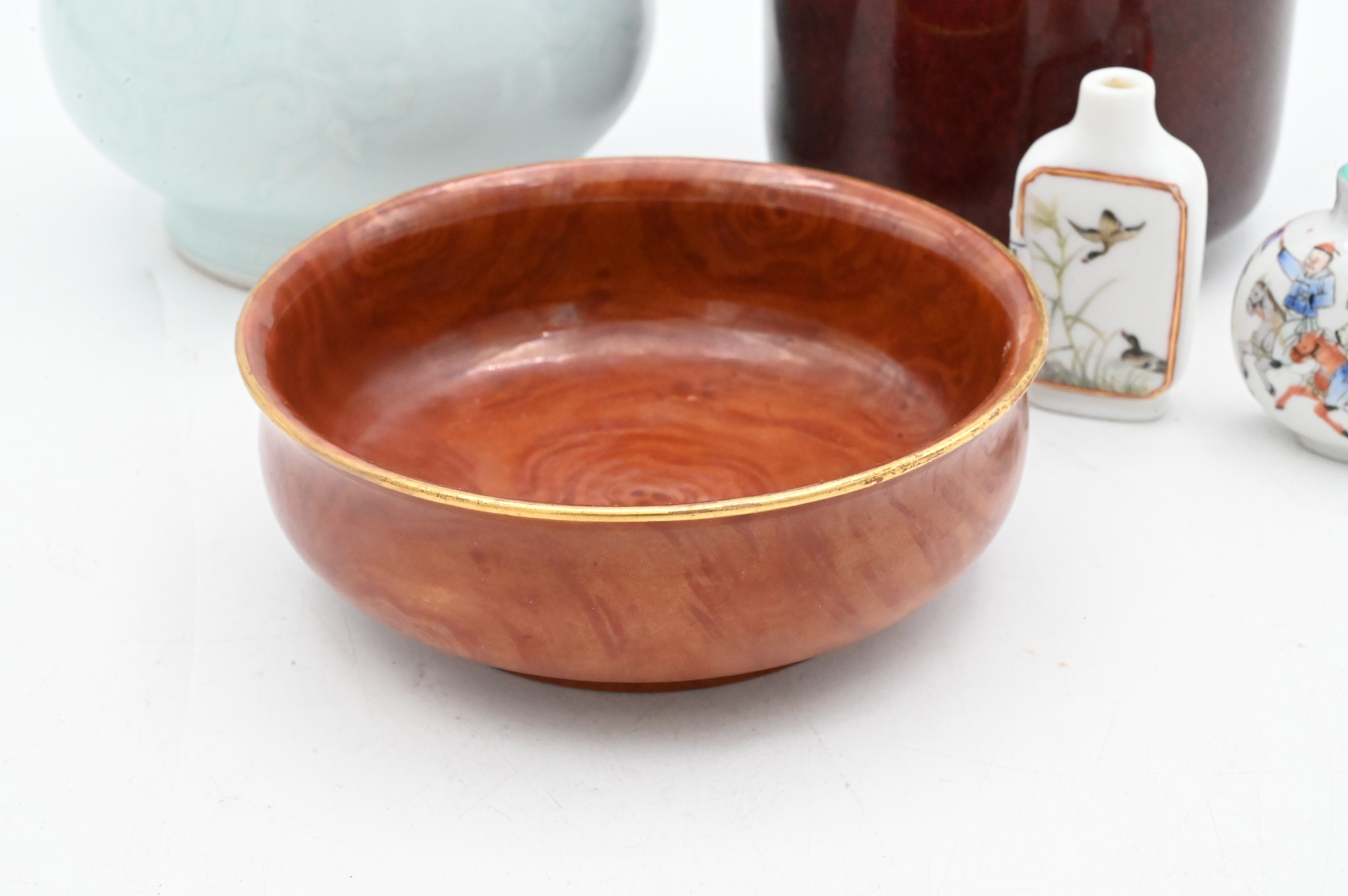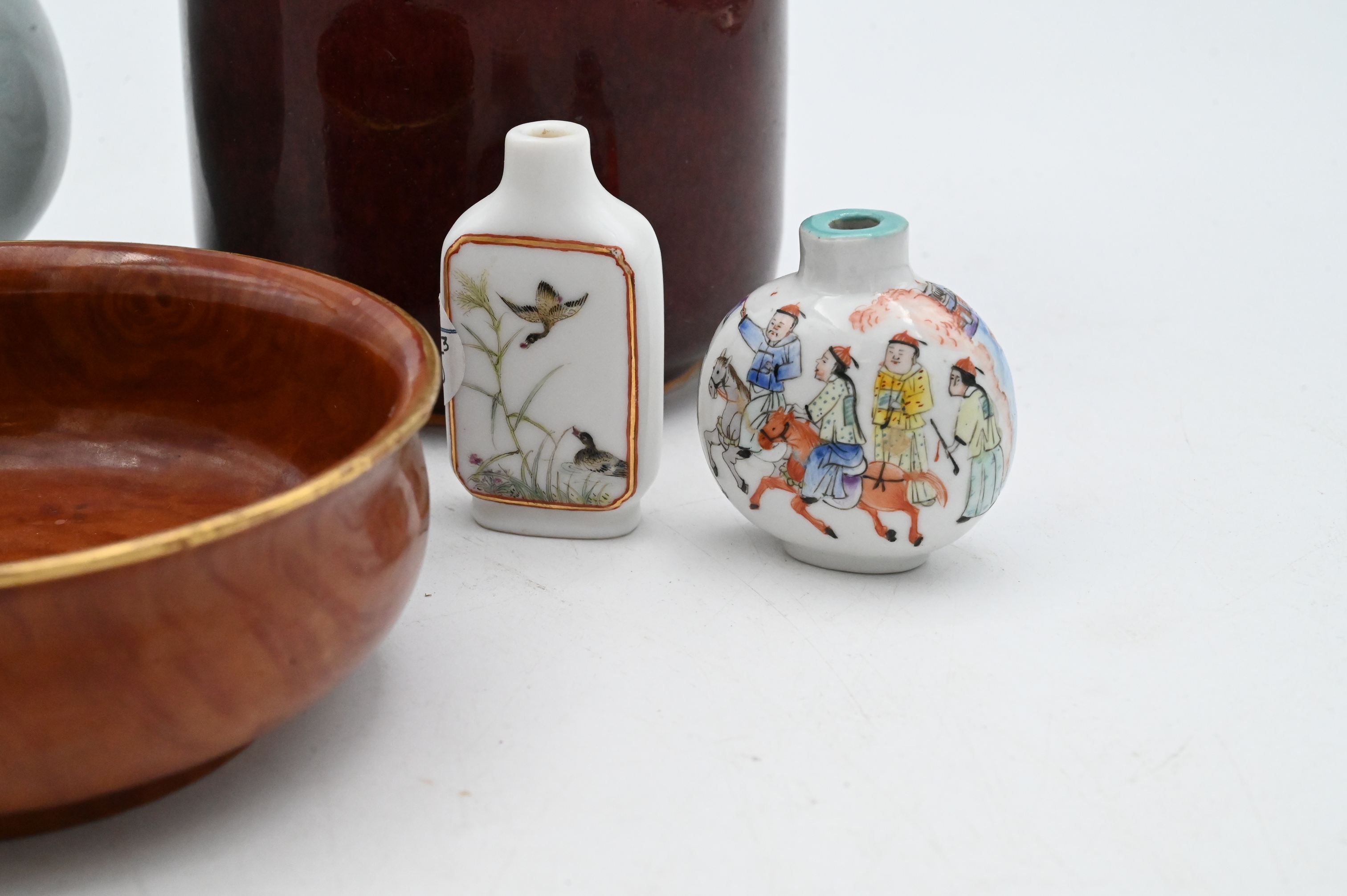 Comprising a tall celadon-glazed vase with molded decoration, a copper-red glazed brush pot, a blue and white bowl, an iron-red glazed bowl, together with two porcelain snuff bottles—one painted with figural scene, the other with floral decoration.