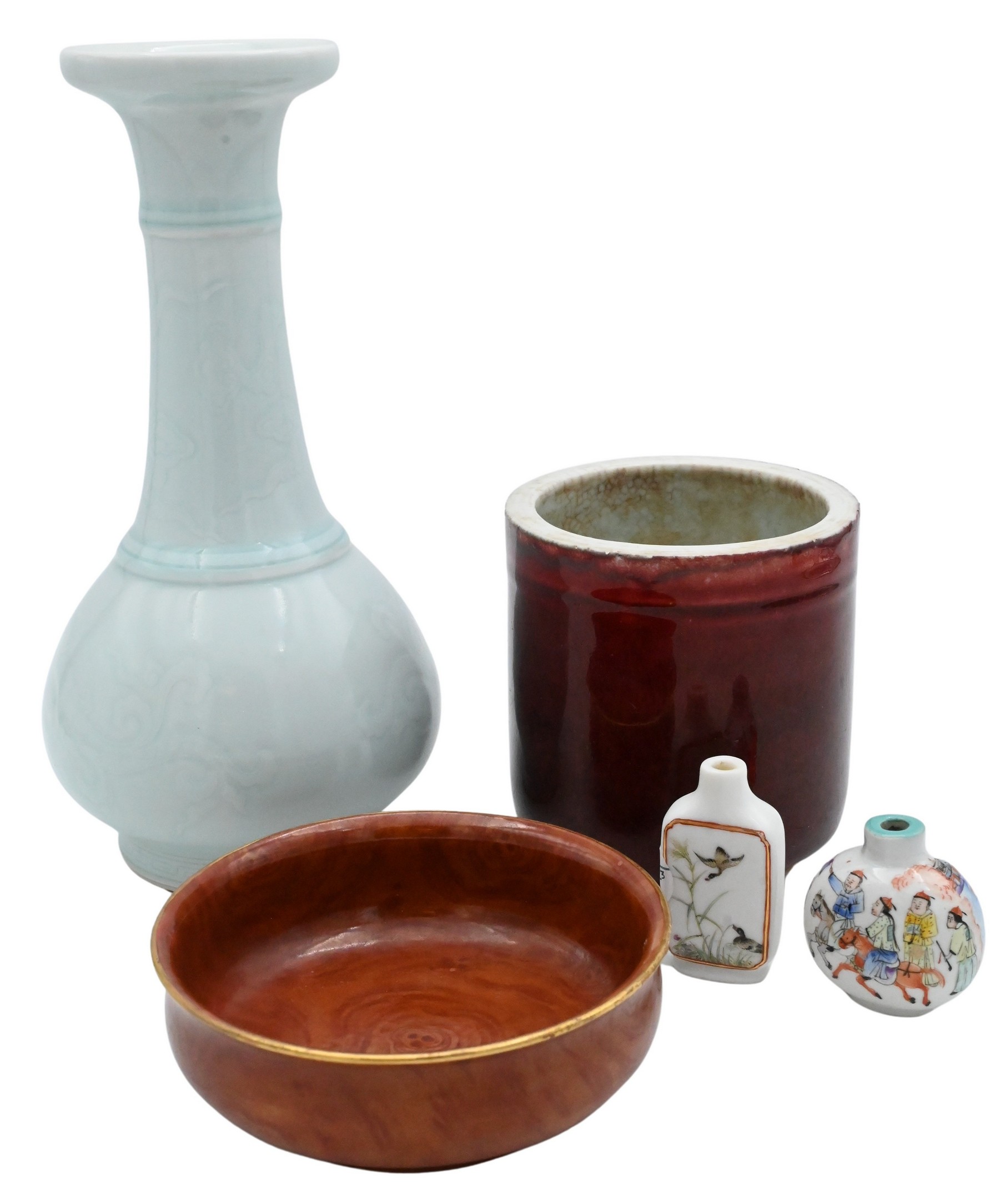 Condition: Varying; celadon vase with minor firing imperfections, brush pot with interior staining, bowls with minor rim wear, snuff bottles in good overall condition