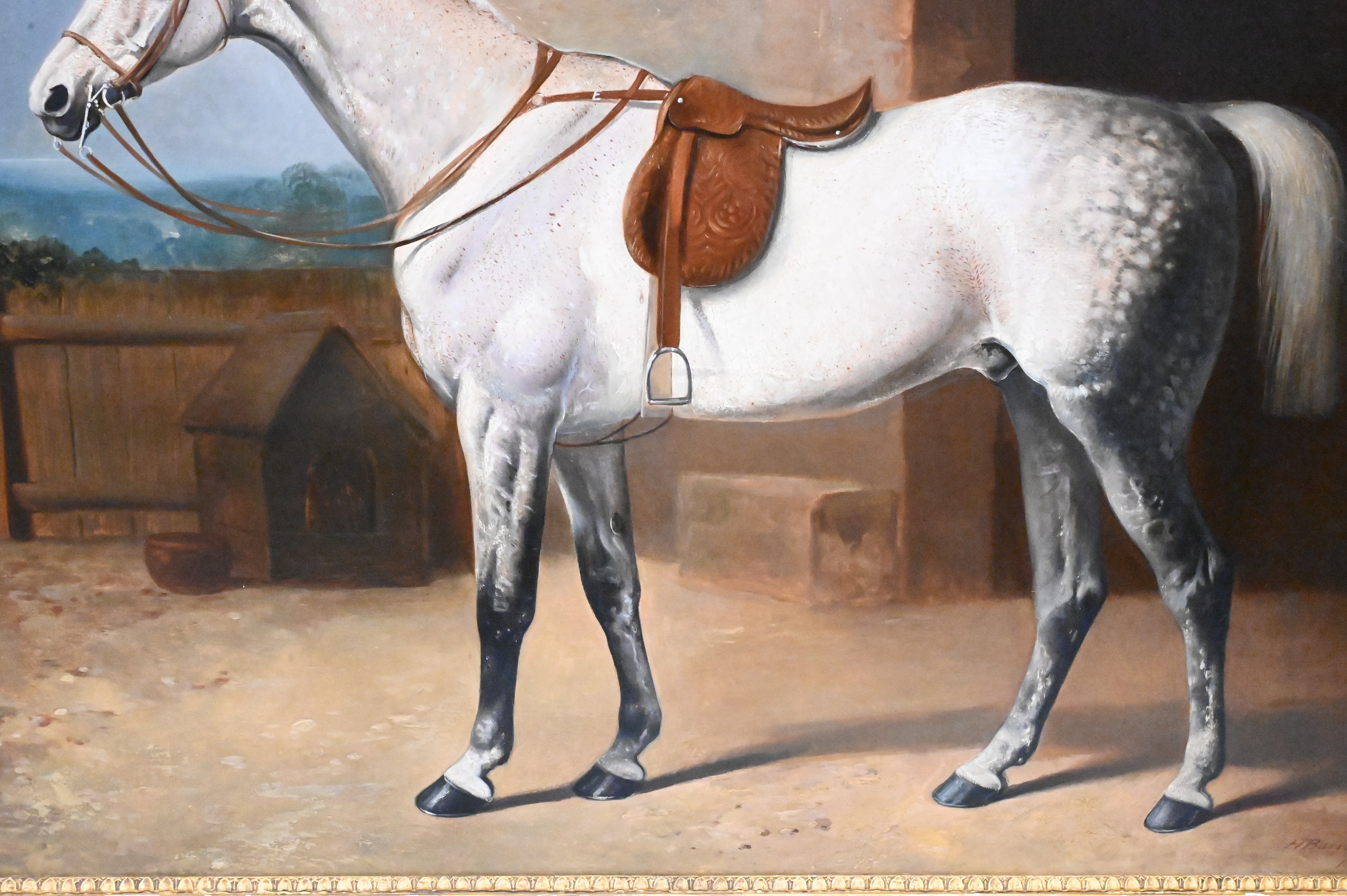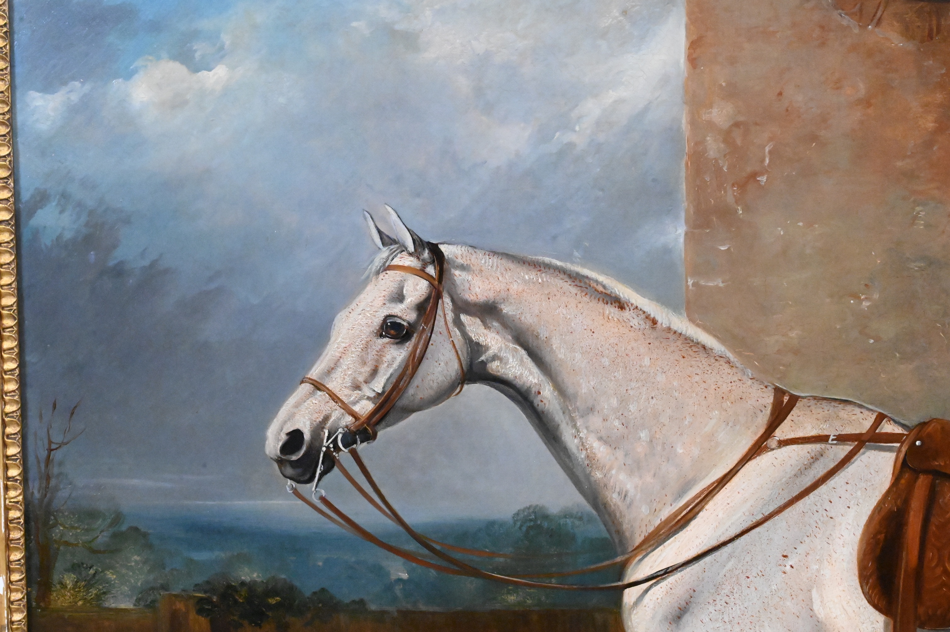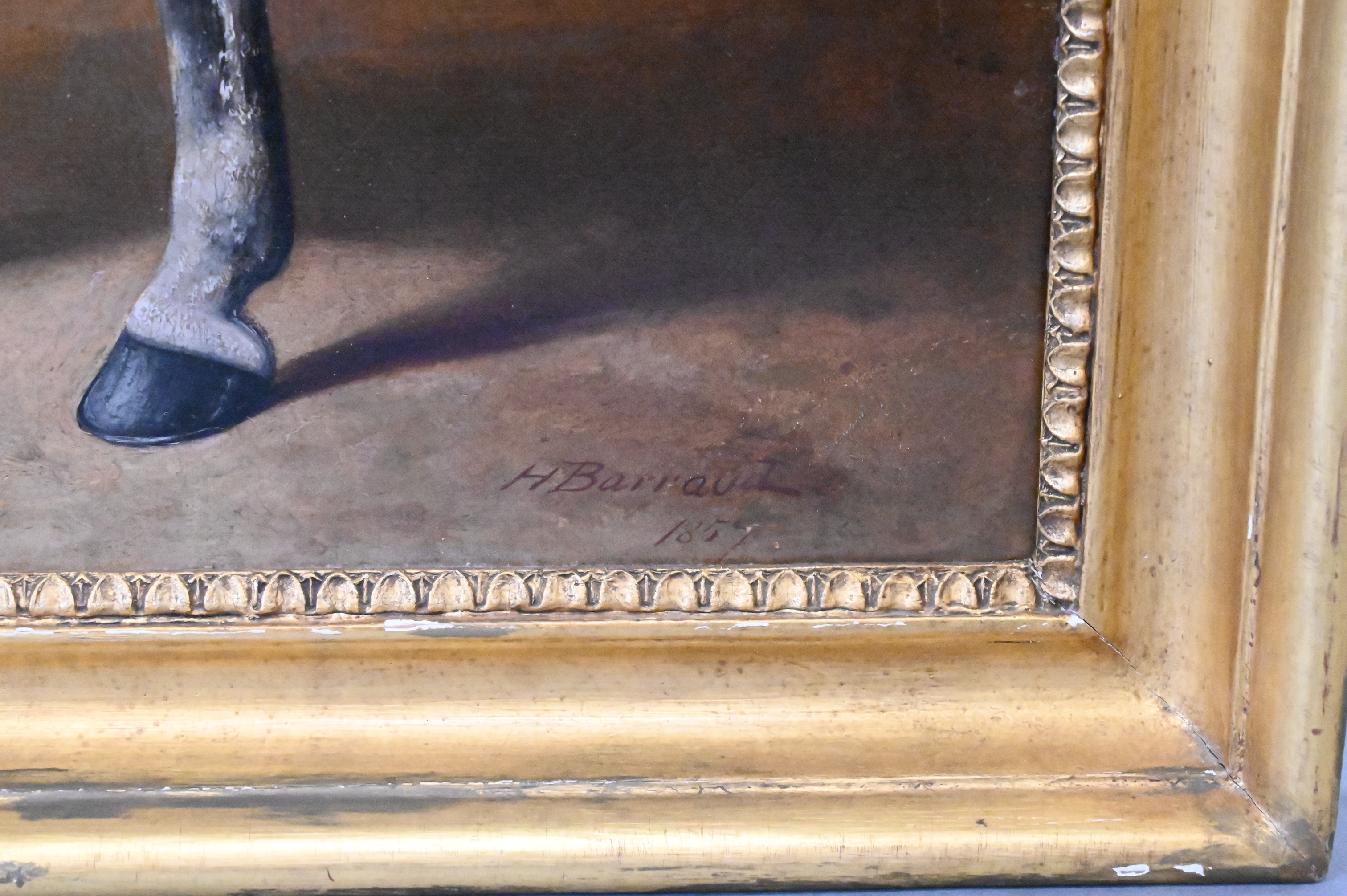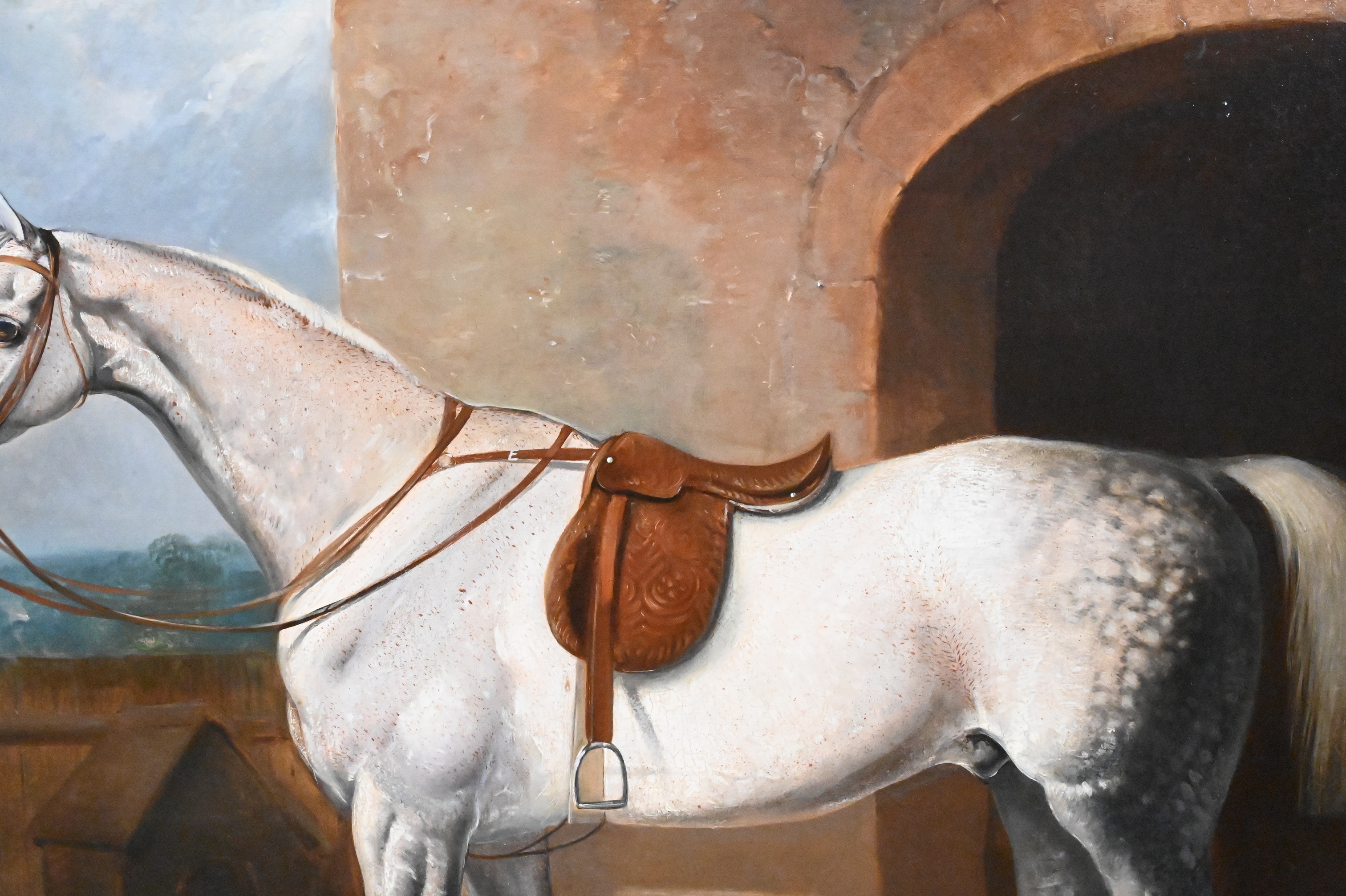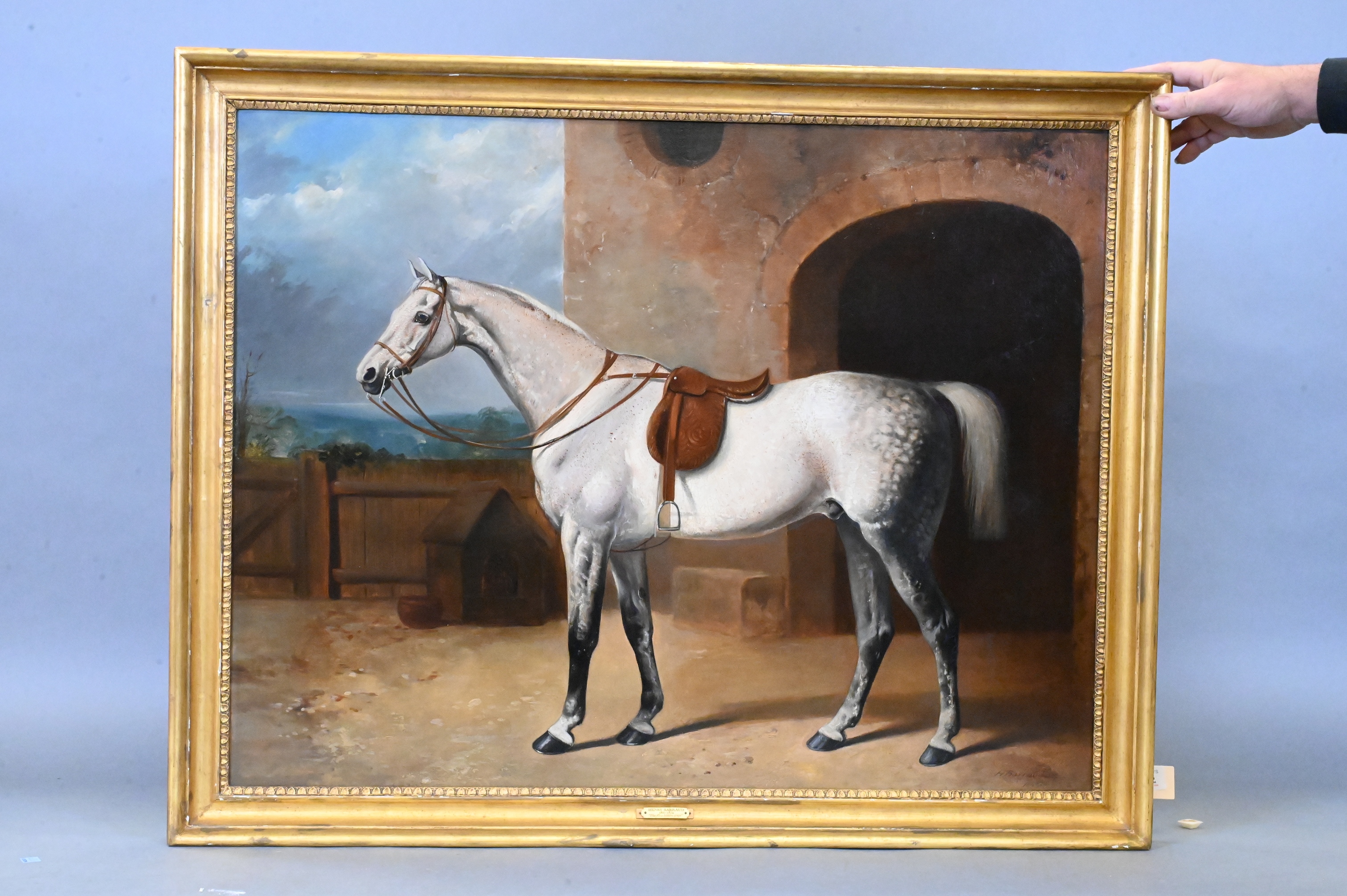 depicting a white stallion standing before a stable interior, the animal portrayed with meticulous anatomical accuracy and a refined sense of tone and light; Barraud’s equestrian works reflect the precision and elegance of mid-19th-century British sporting art