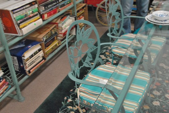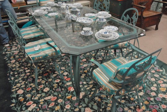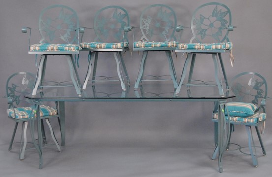 Iron and glass top table with six swivel armchairs. ht. 30 1/2in., lg. 84in., wd. 42in.