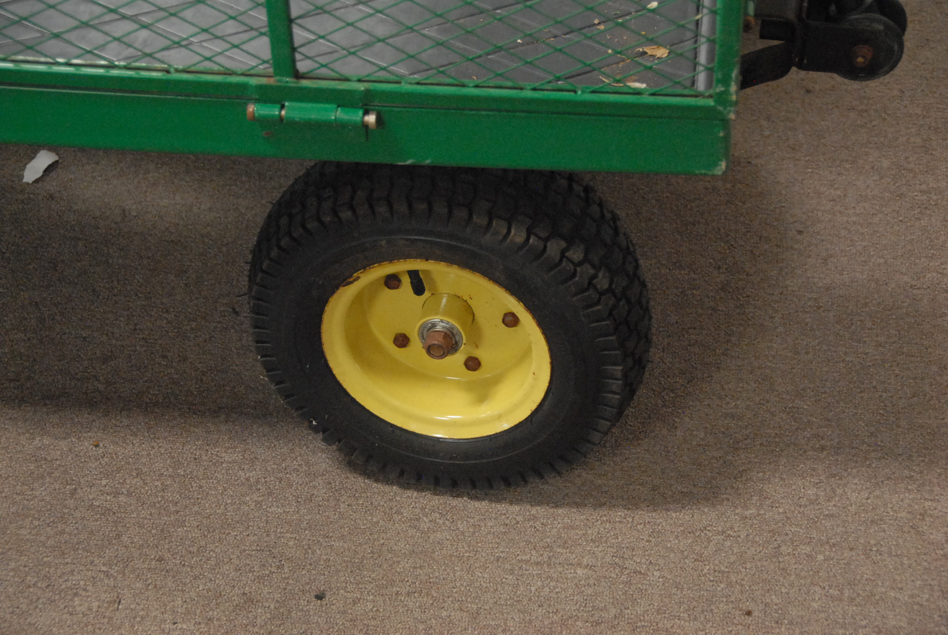 John Deere wagon / cart with large wheels, sides and back drop.