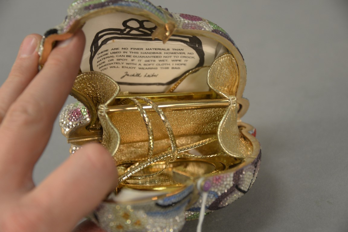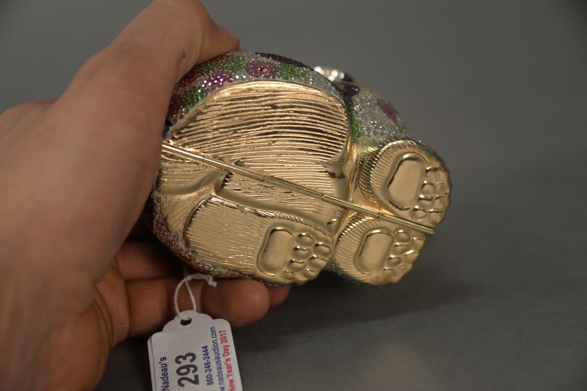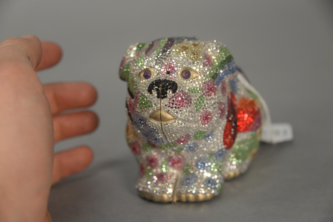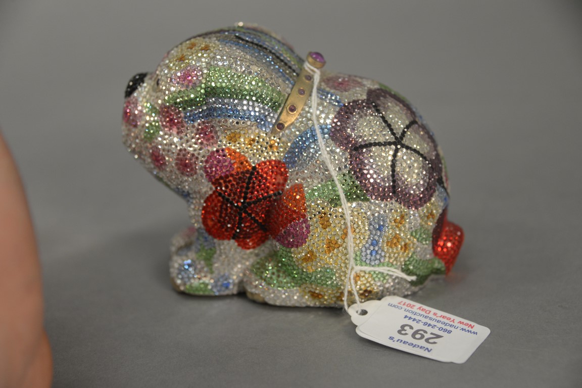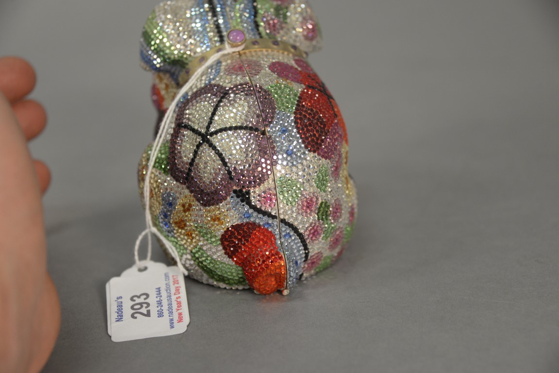 Lot 293: Judith Leiber jeweled crystal miaudiere purse Millie, the dog clutch having bright colored flower design and fitted with original …