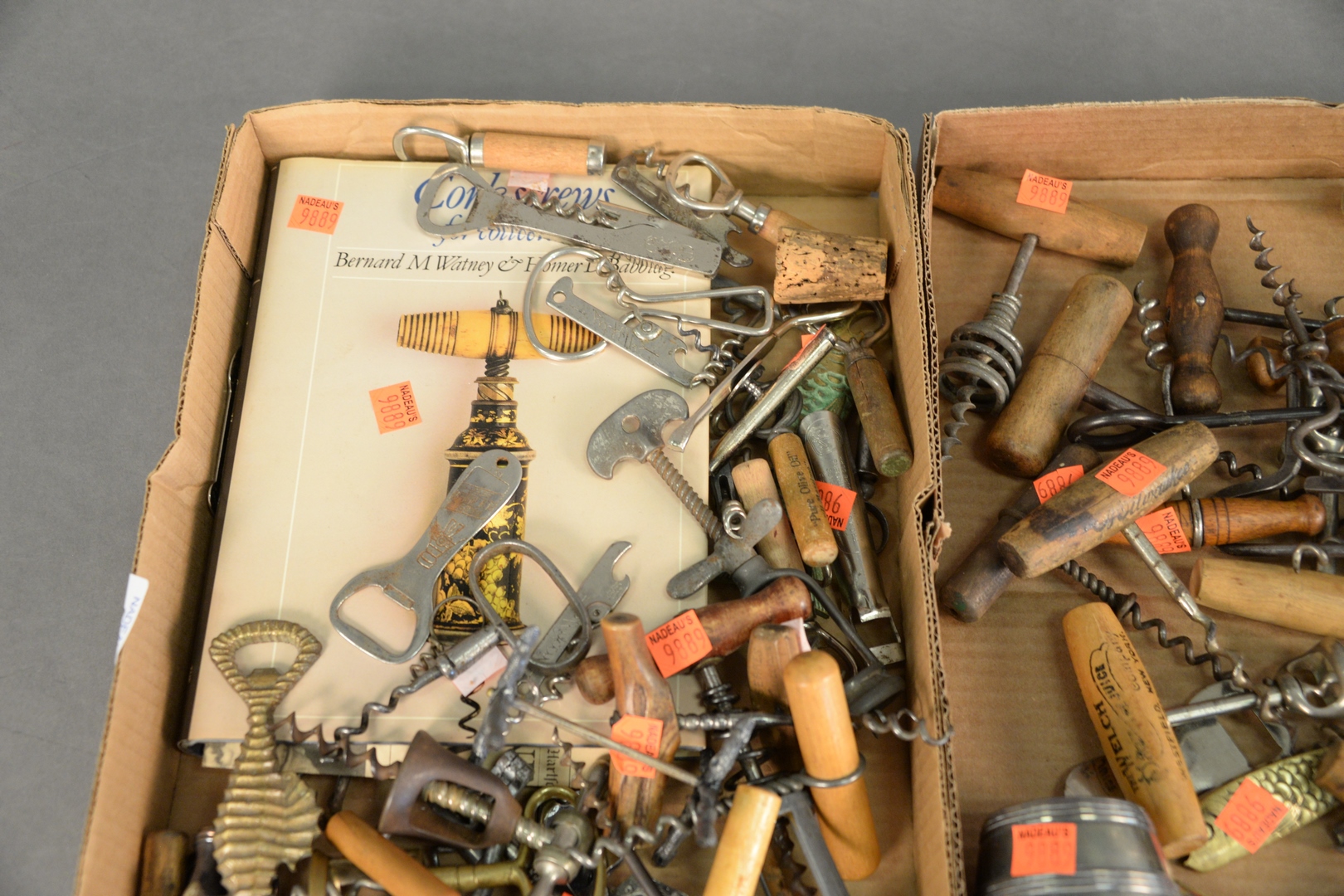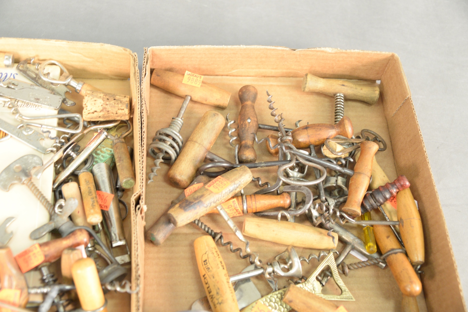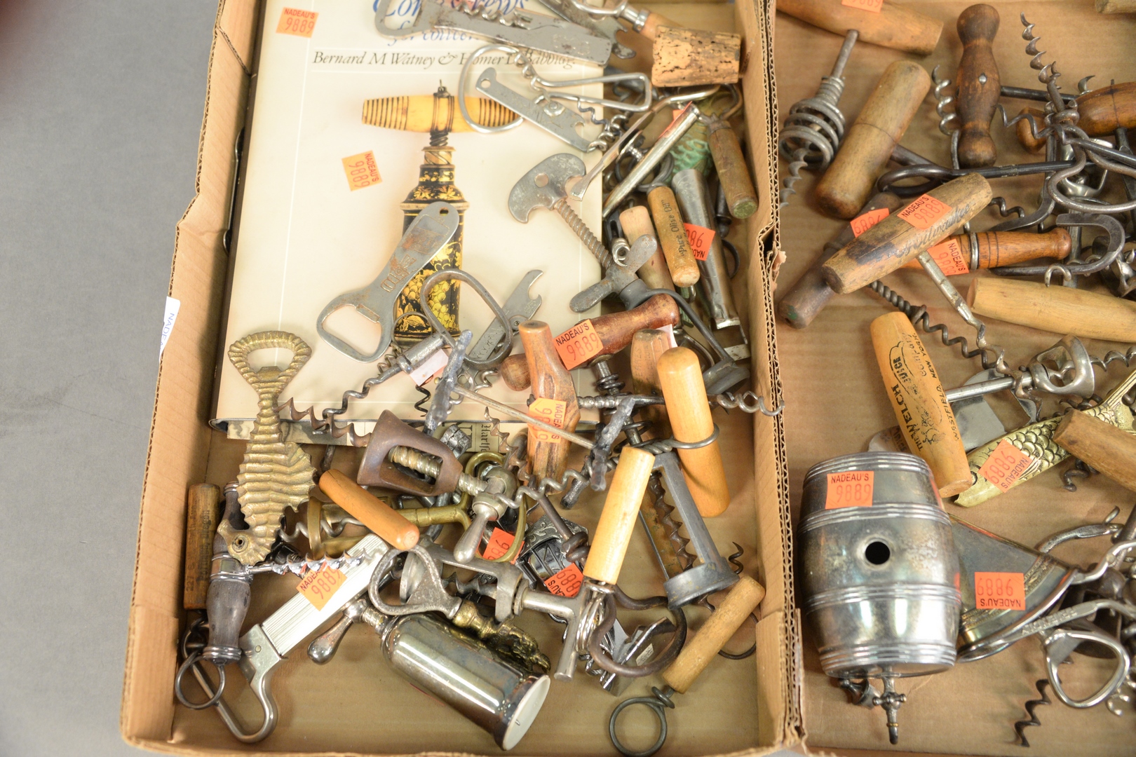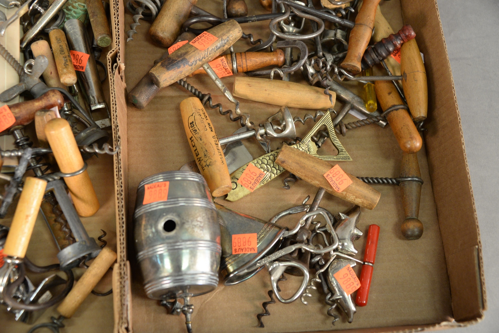 Lot 293: Large Group Lot of Corkscrews, wood, brass, and other metal, to include several in the form of animals, many with turned wooden handles, along with several bottle openers.