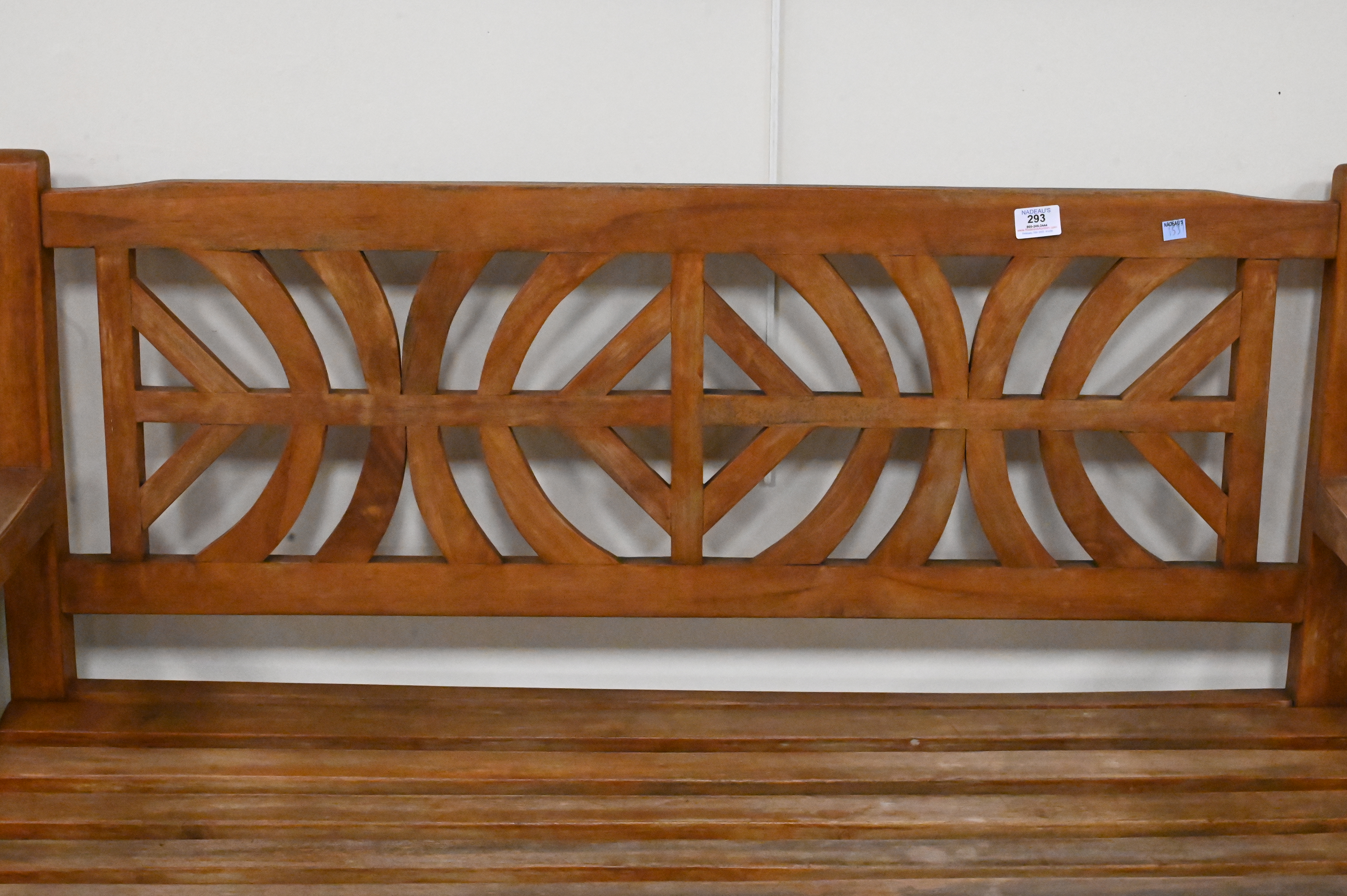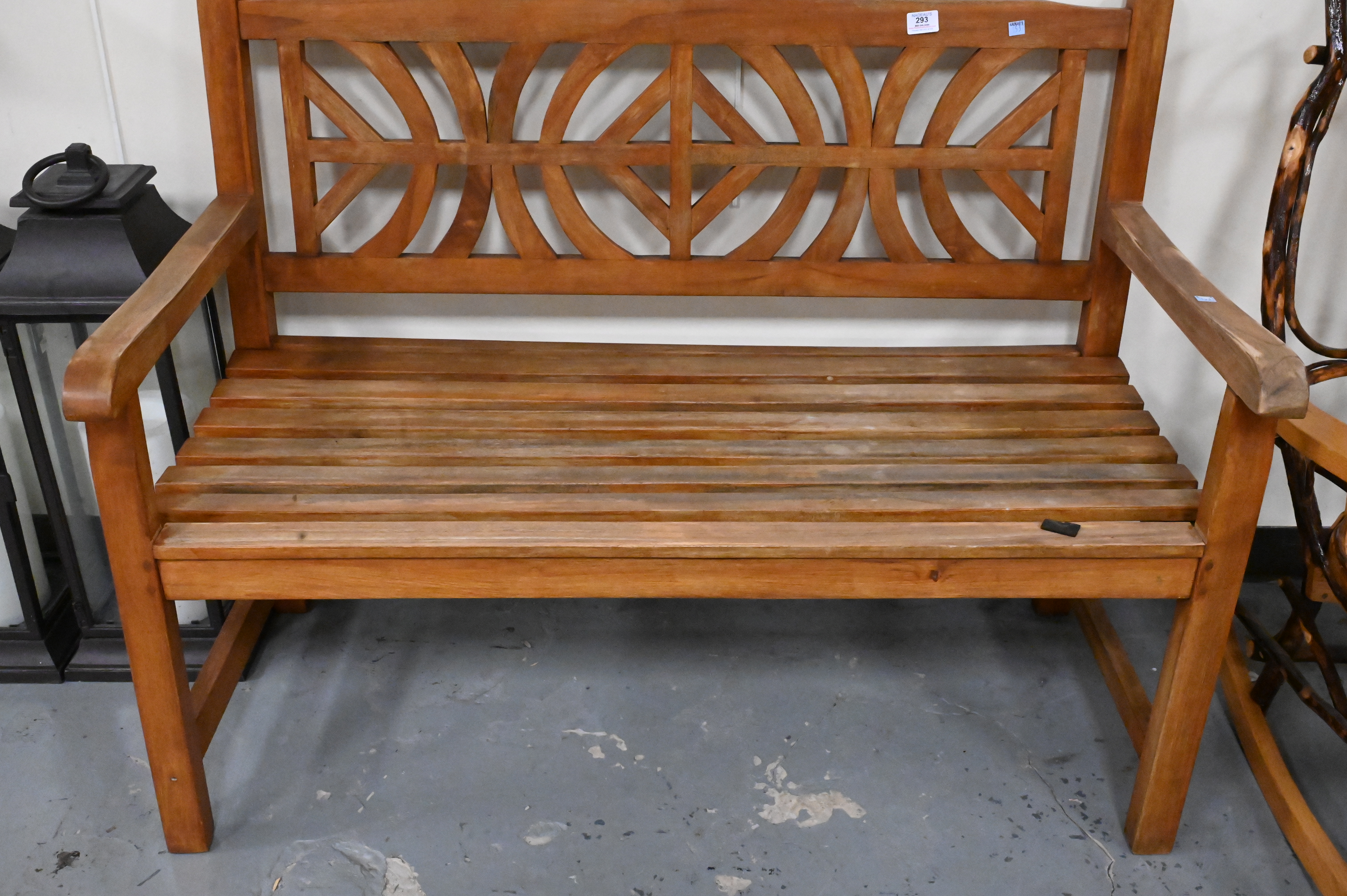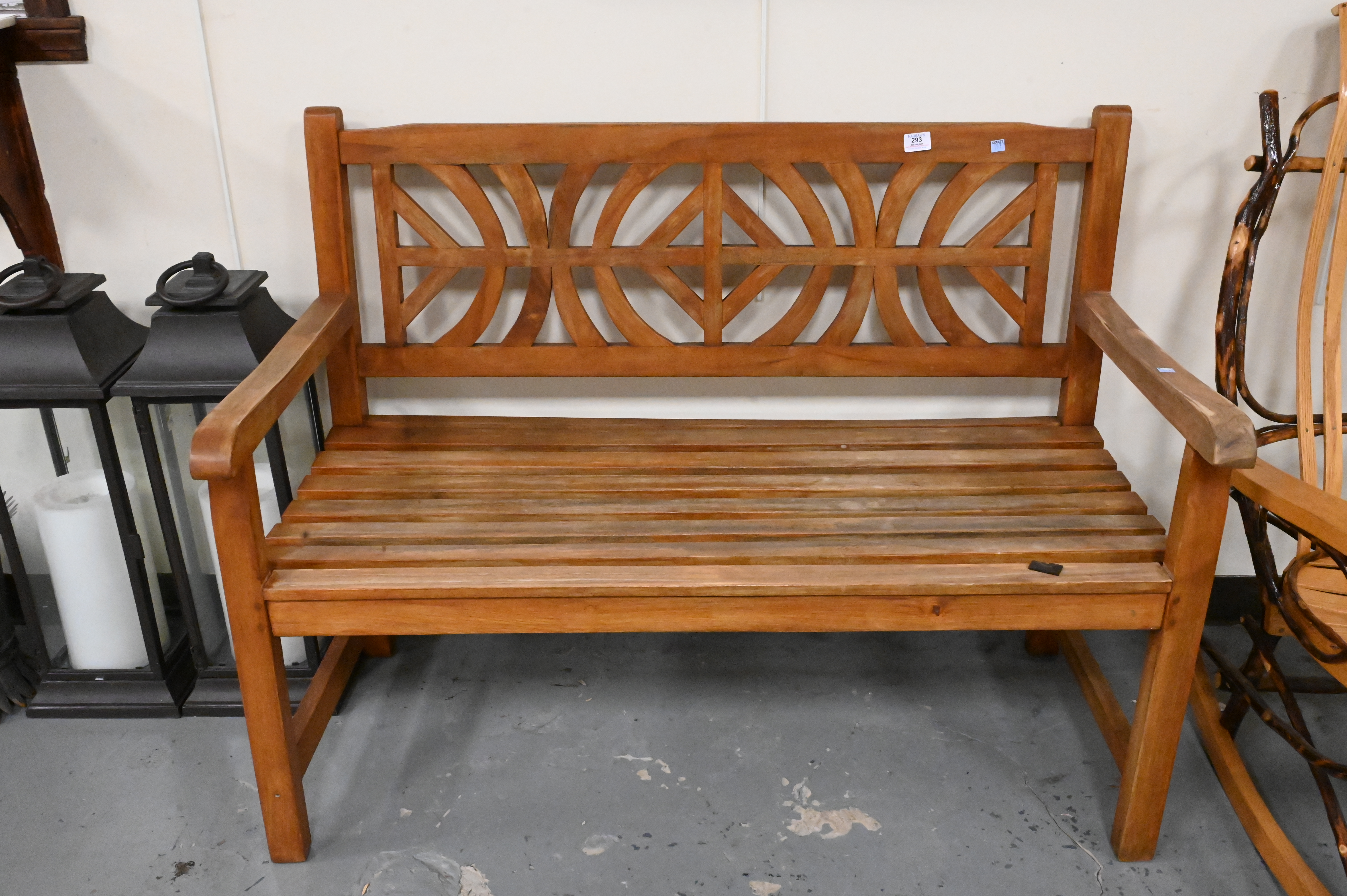 Outdoor Teak Bench, height 36 inches, length 47 inches.