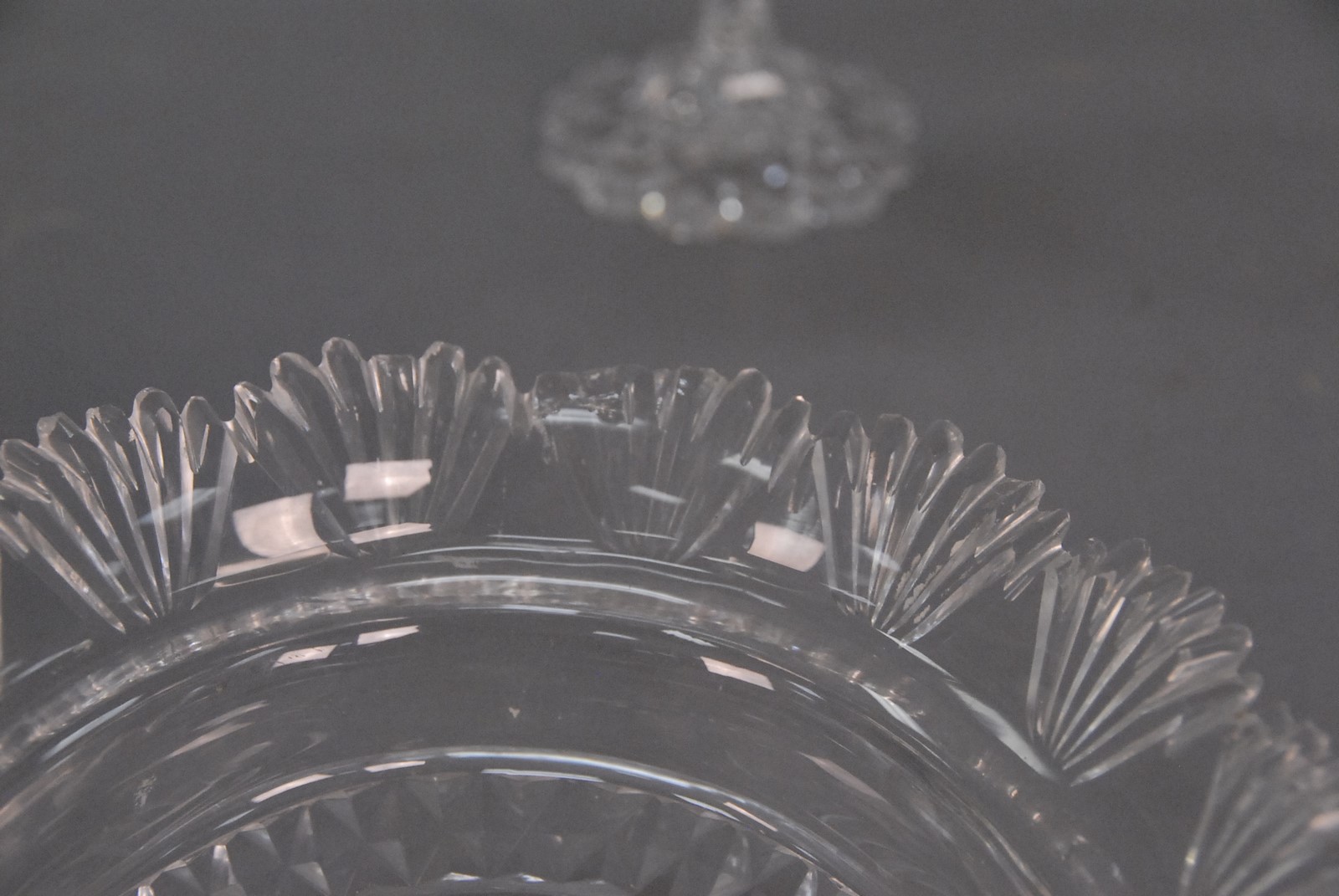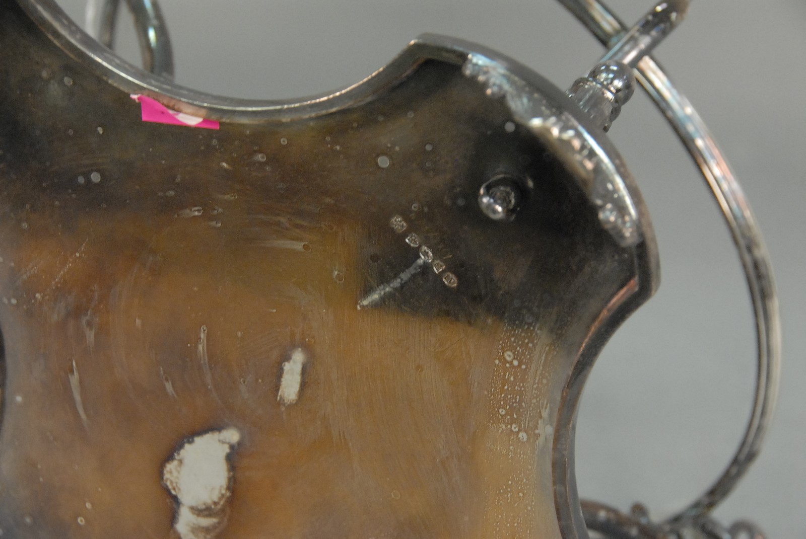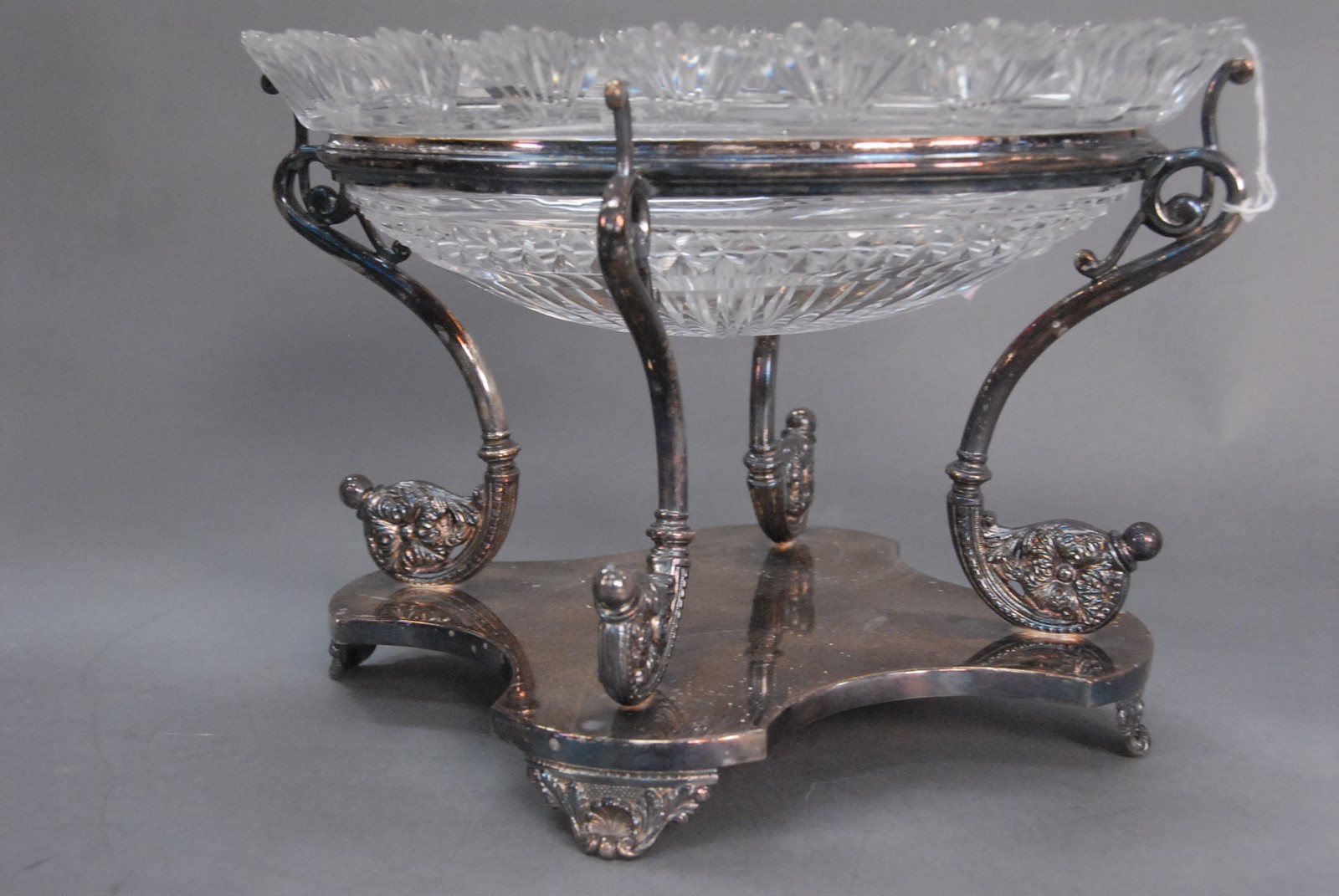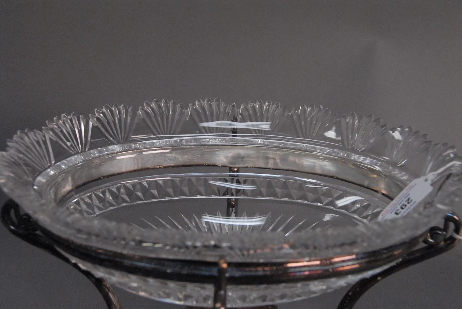 Oval cut glass bowl in silverplate holder two teeth chipped. ht. 8 1/2 in. lg. 12 in.
