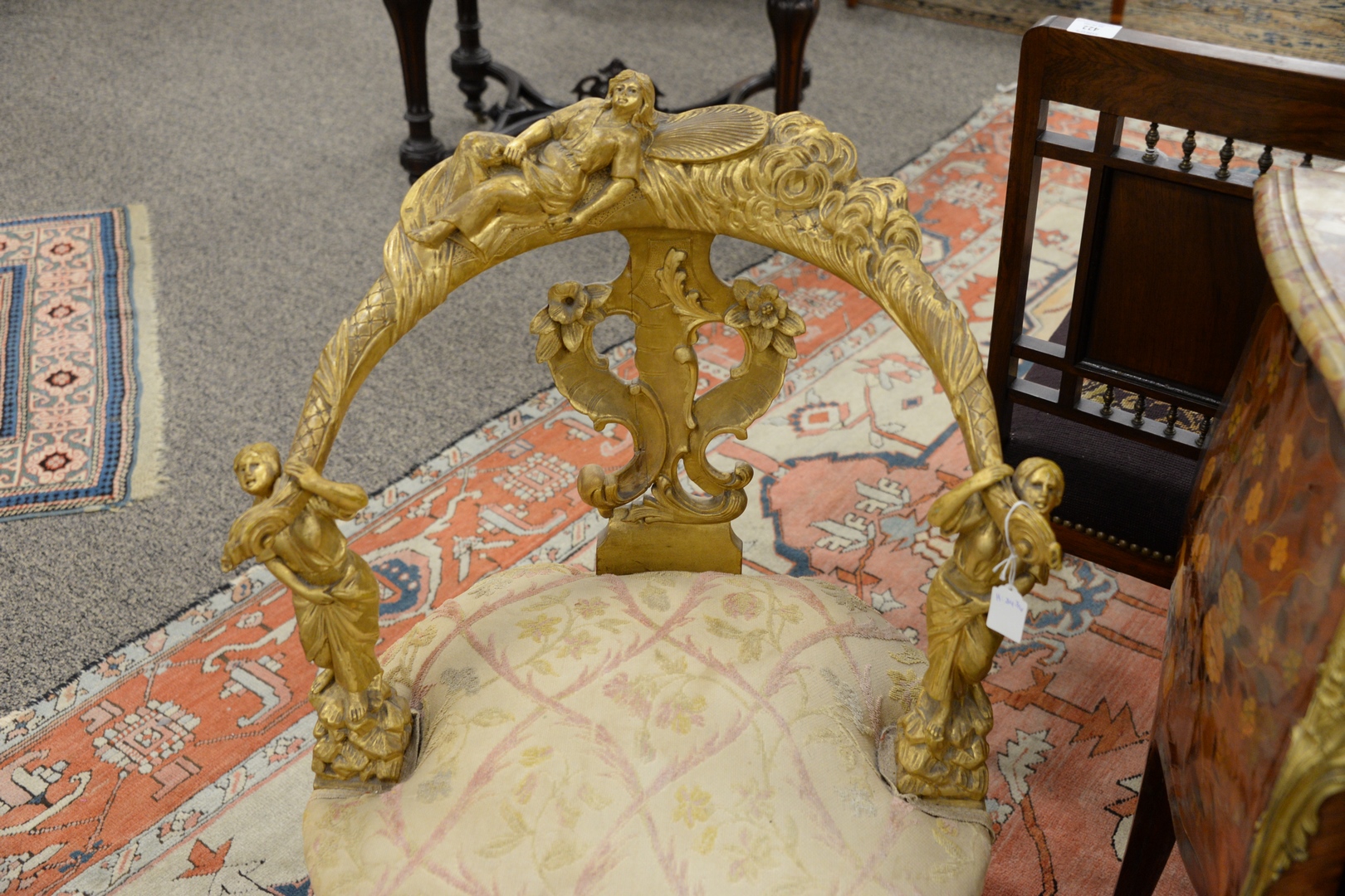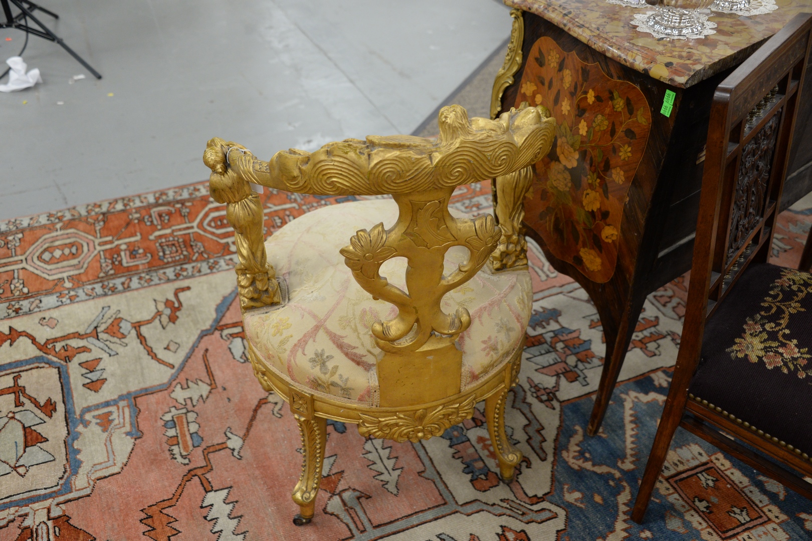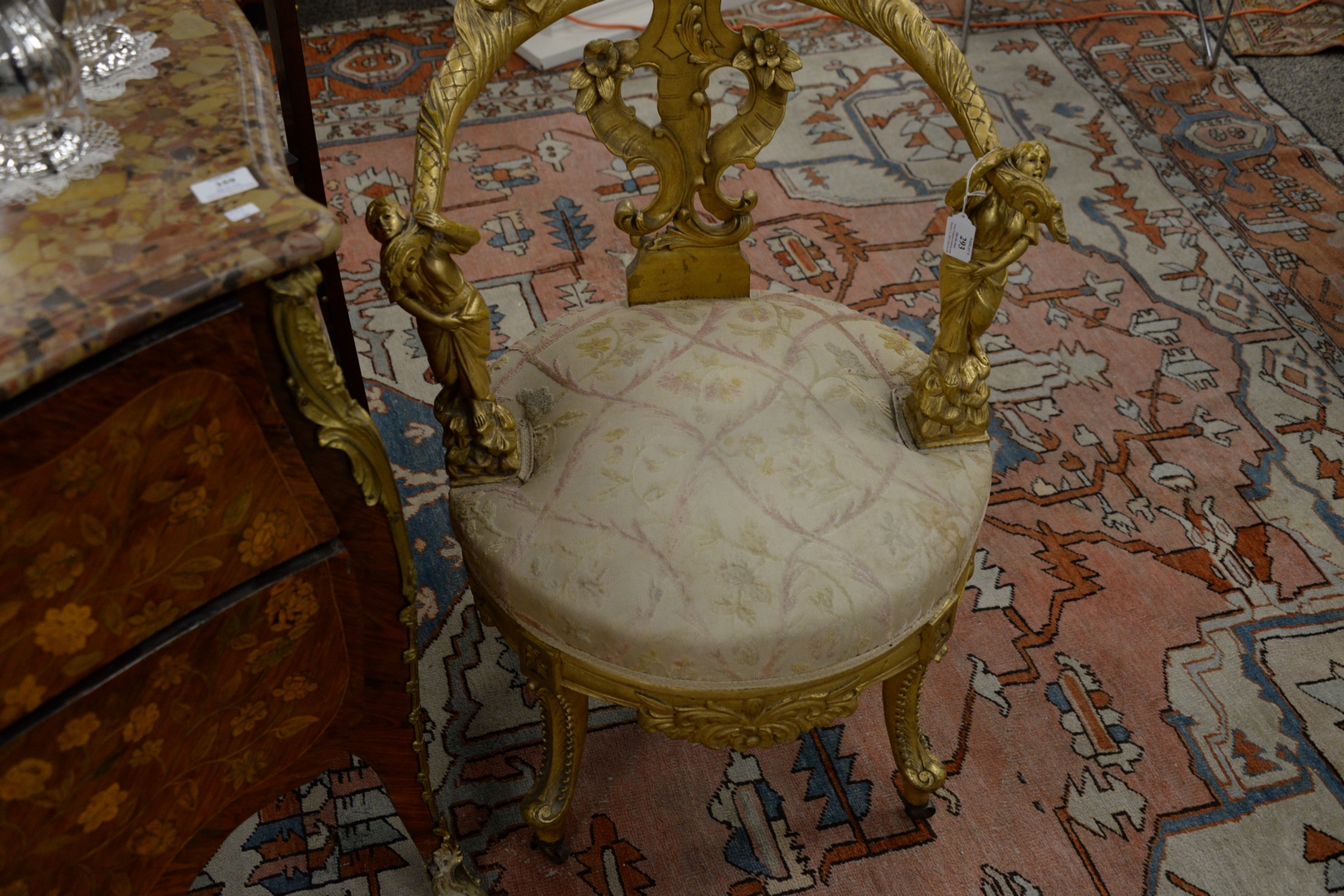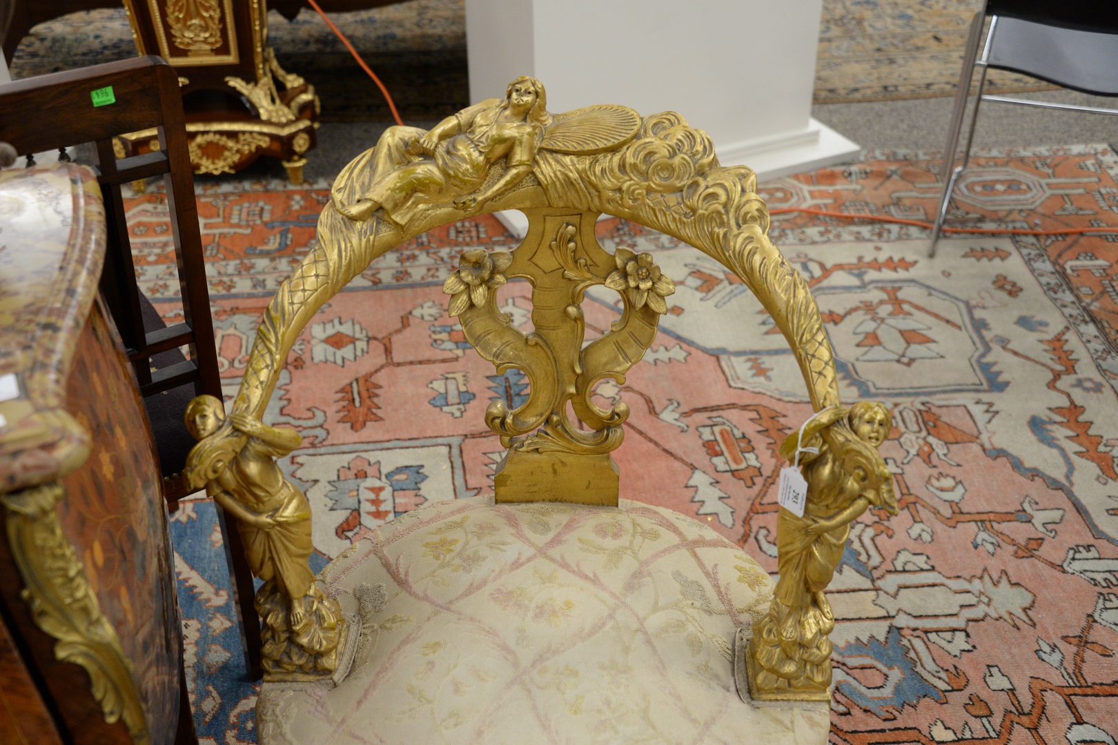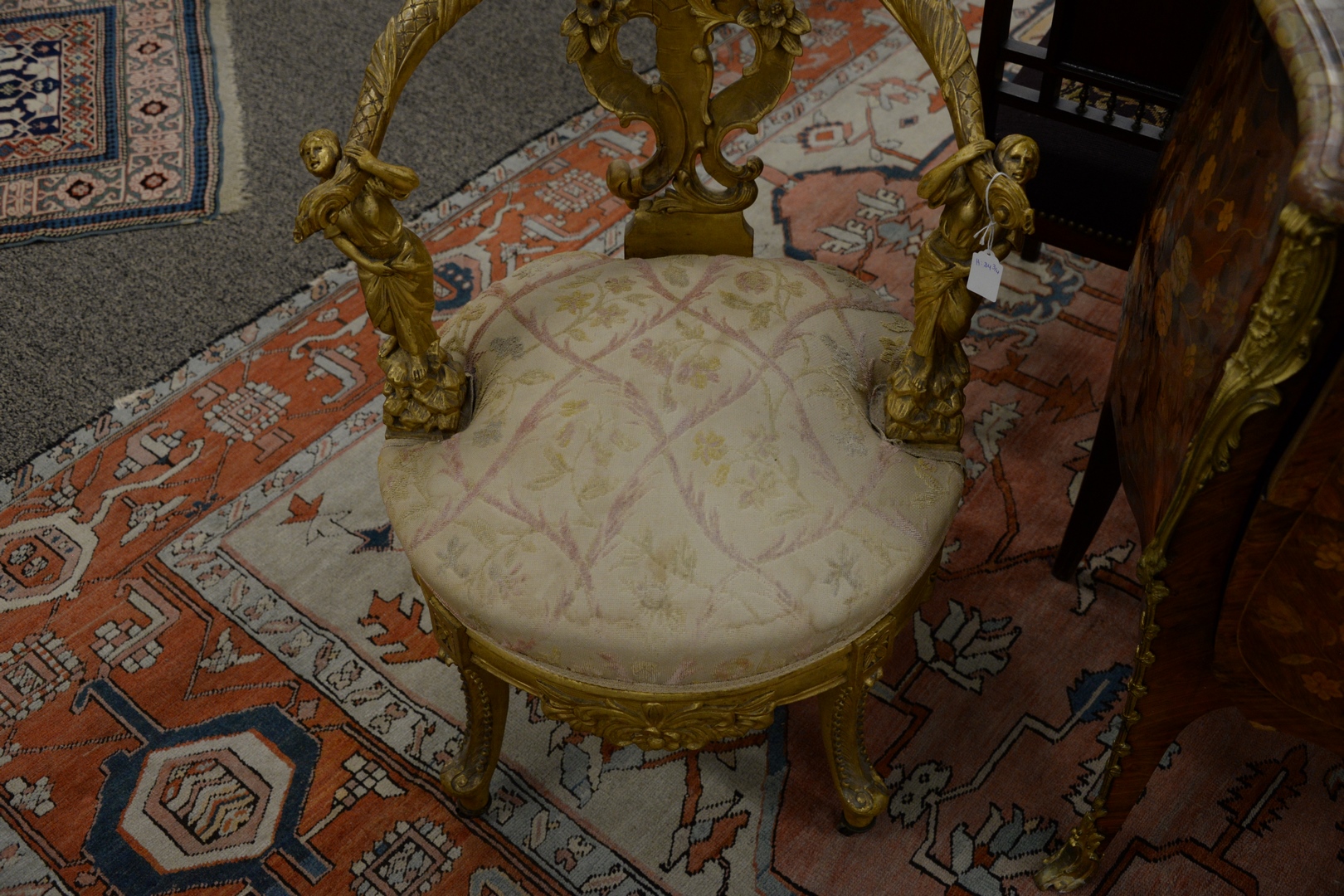 Lot 293: Pair of Carved and Gilt Decorated Armchairs top rail arms support, with carved female figures height 35 inches