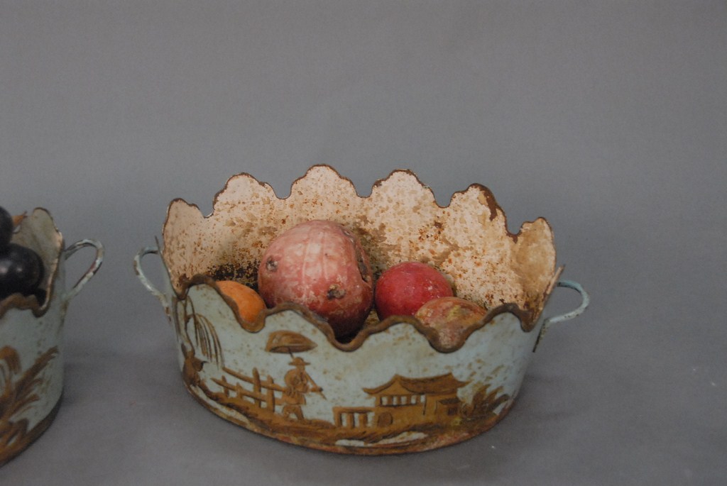 Pair of Tole monteith style pots with gold Oriental motif and two handles along with alabaster fruit. Provenance: property from a home in Rockville Center, New York which was decorated by Iris Apfel. ht. 4 1/2in.