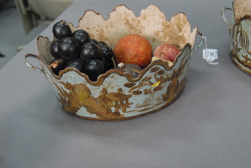 Lot 293: Pair of Tole monteith style pots with gold Oriental motif and two handles along with alabaster fruit. Provenance: property from a ho…
