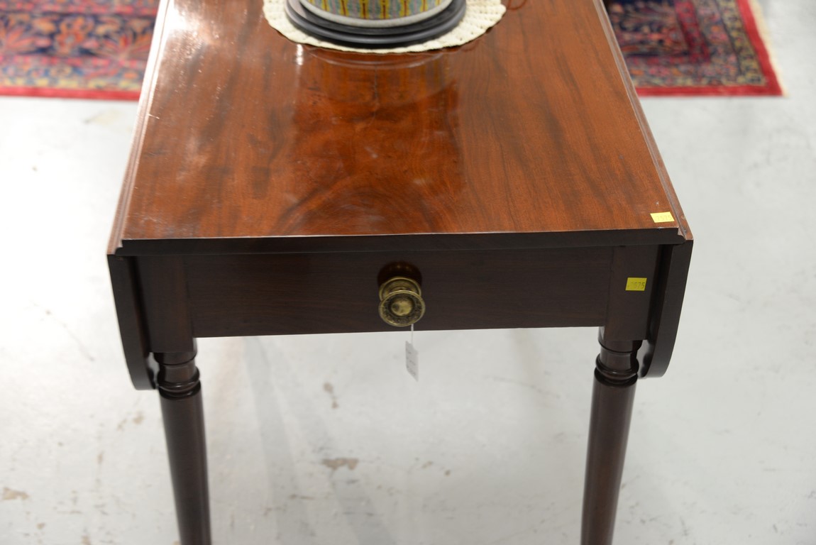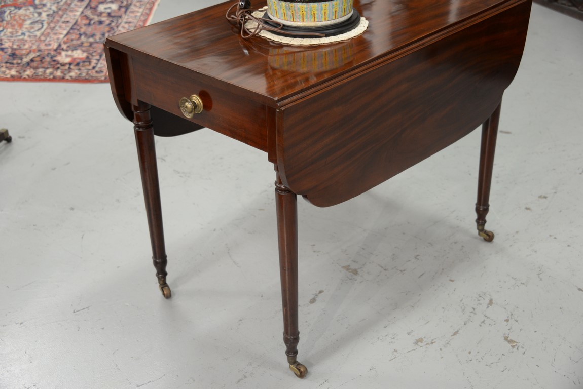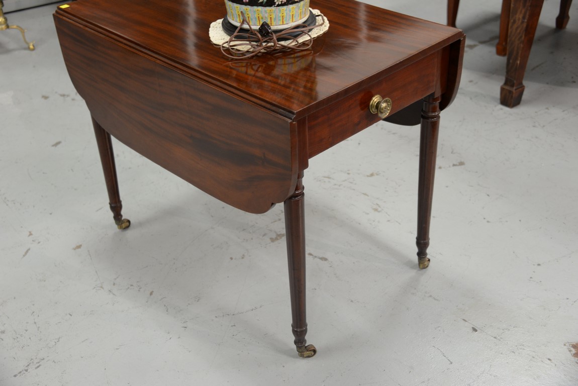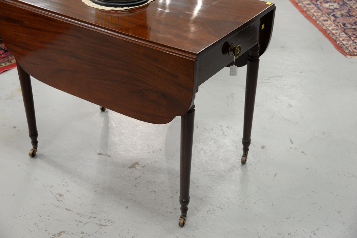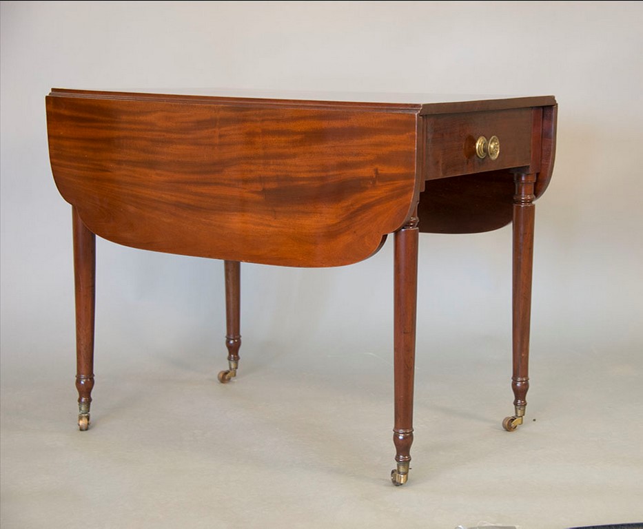 Lot 293: Sheraton mahogany Pembroke table with shaped drop leafs and false drawer on either end, all set on plain turned legs with brass wheels. ht. 29 in. top closed: 21 3/4 x 35 3/4 top open: 35 3/4 x 45 3/4 in.
