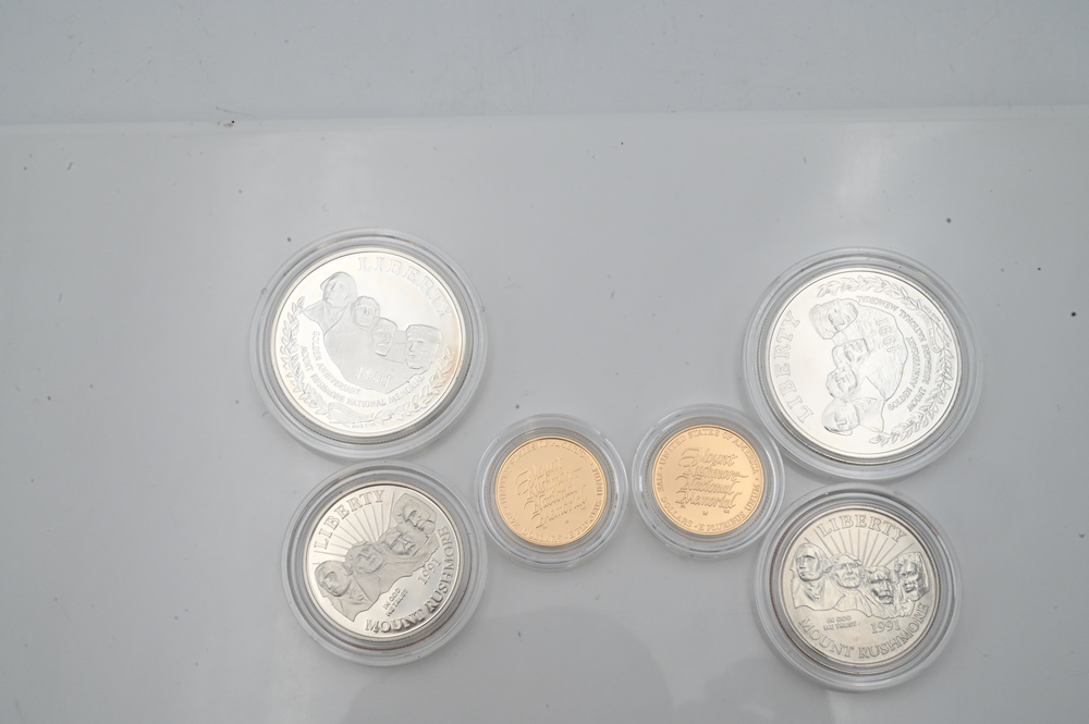 Six Piece Coin Lot, to include two proof 5 dollar gold coins, along with six 1991 Mount Rushmore coins, to include three uncirculated, one proof copper/nickel, and one proof silver dollar.