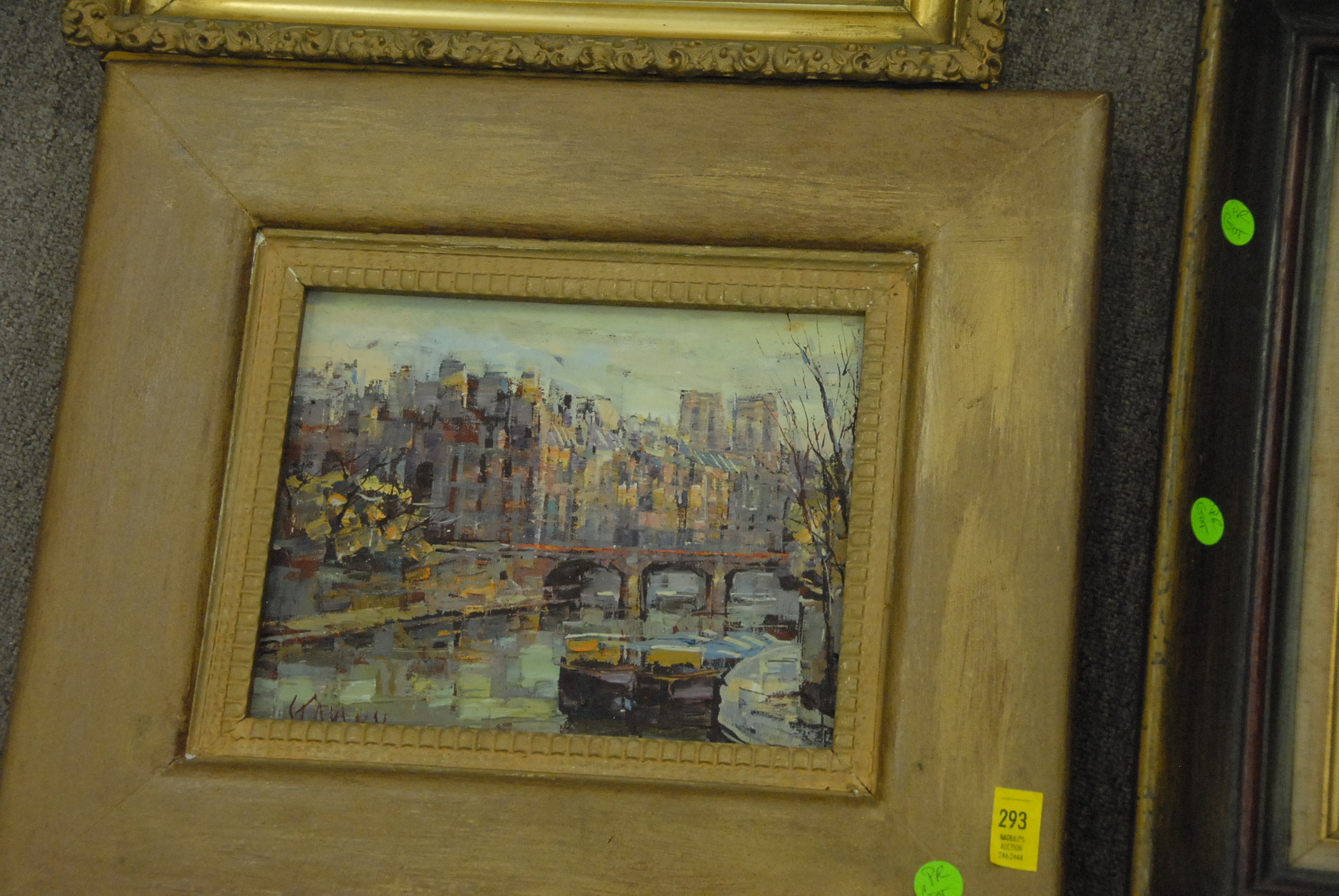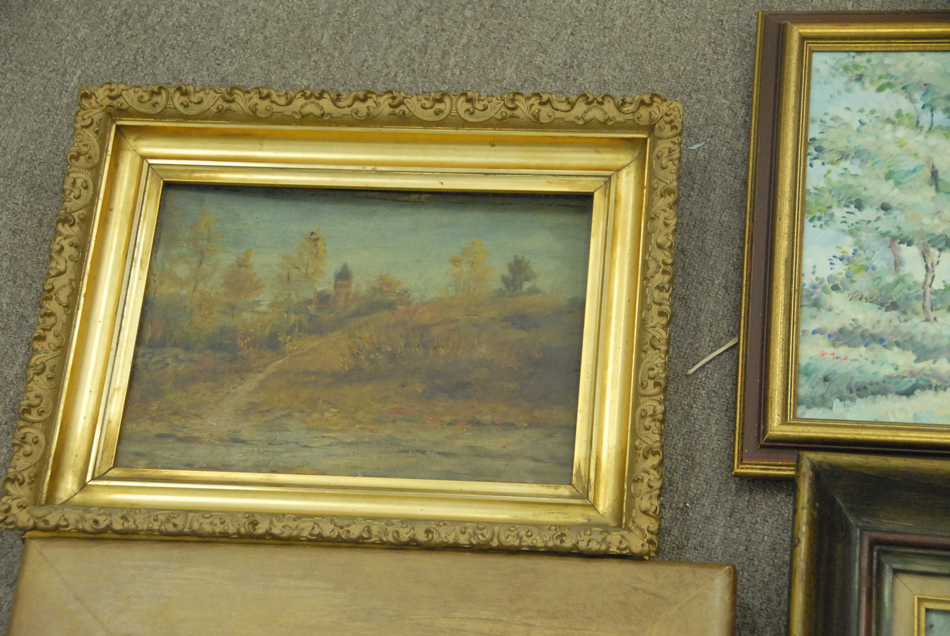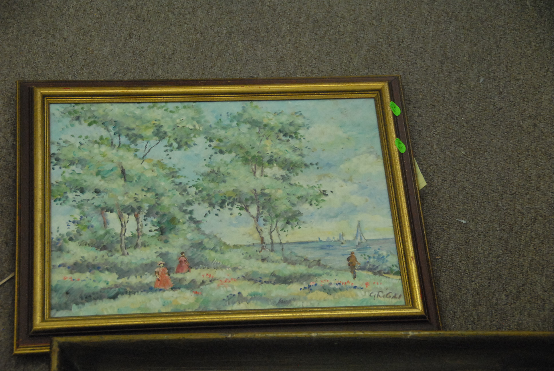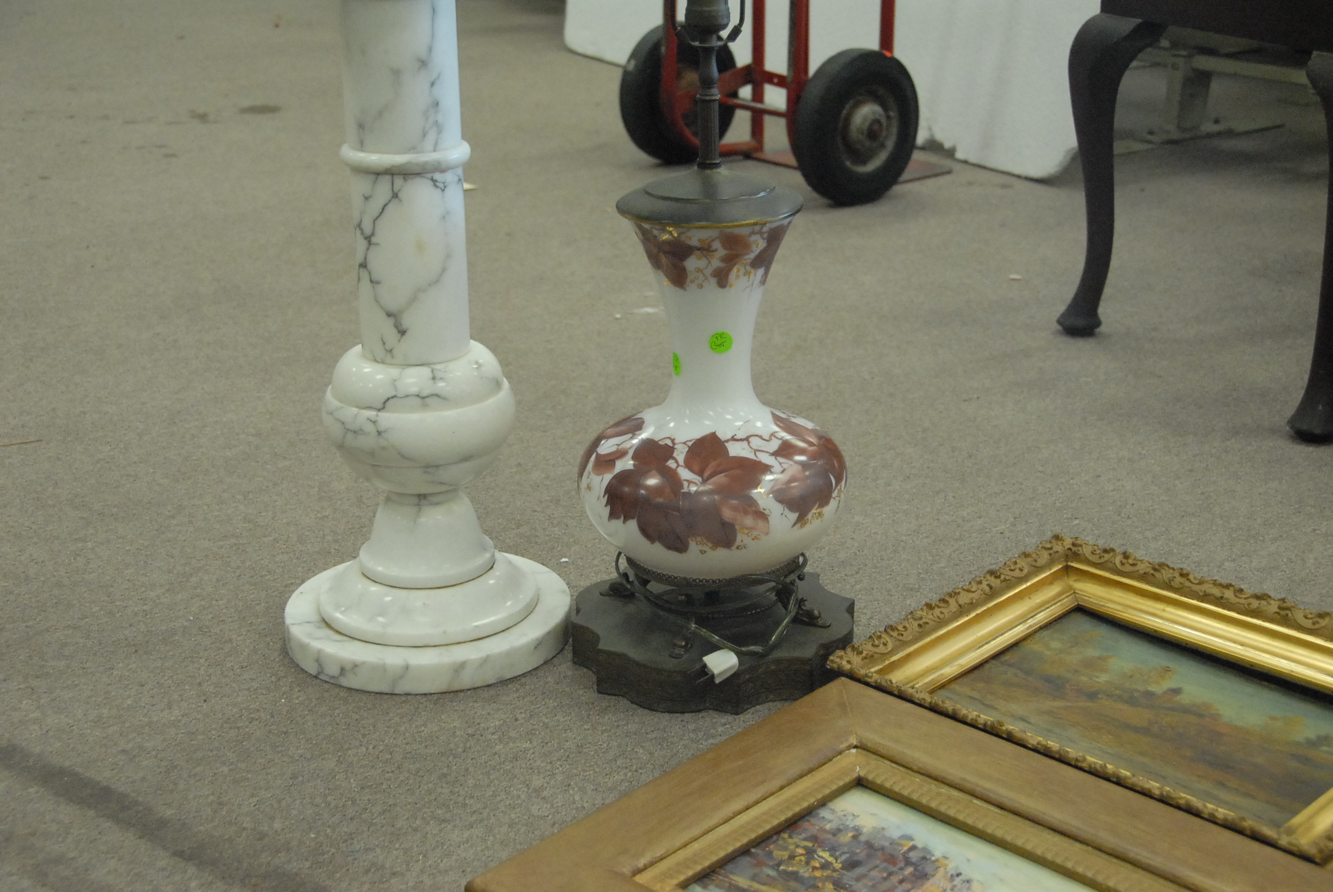 Six piece lot four paintings including one signed Gruppe, marble pedestal and a lamp.