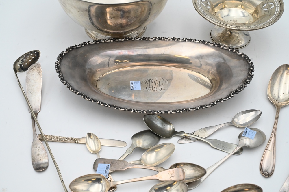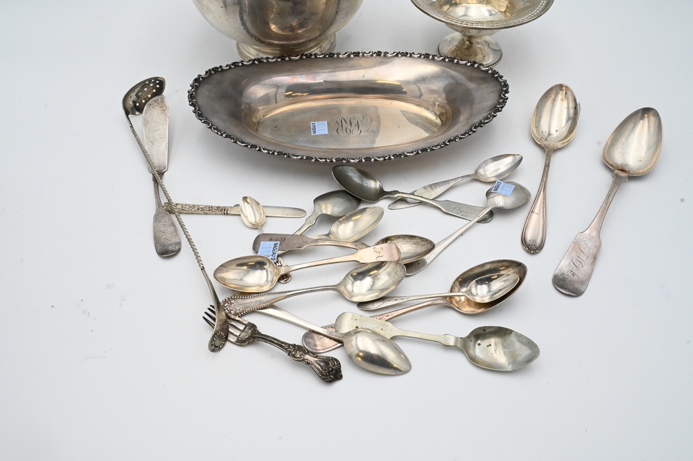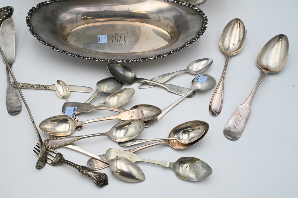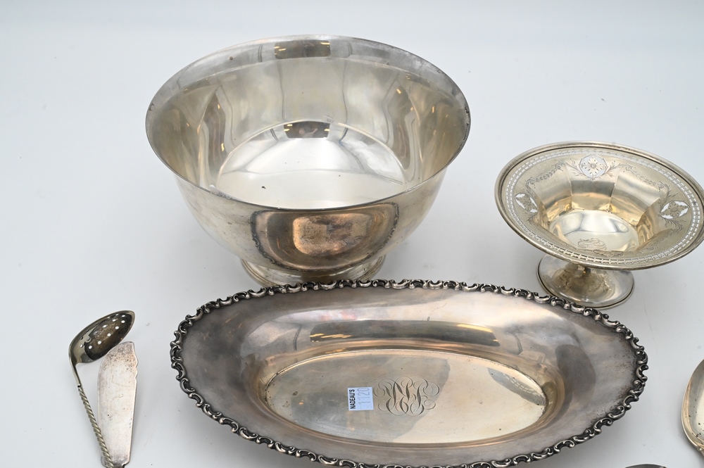 Lot 293: Sterling Silver Lot, to include revere bowl, bread tray, coin silver spoons, sterling silver spoons, etc., 46.5 t.oz.