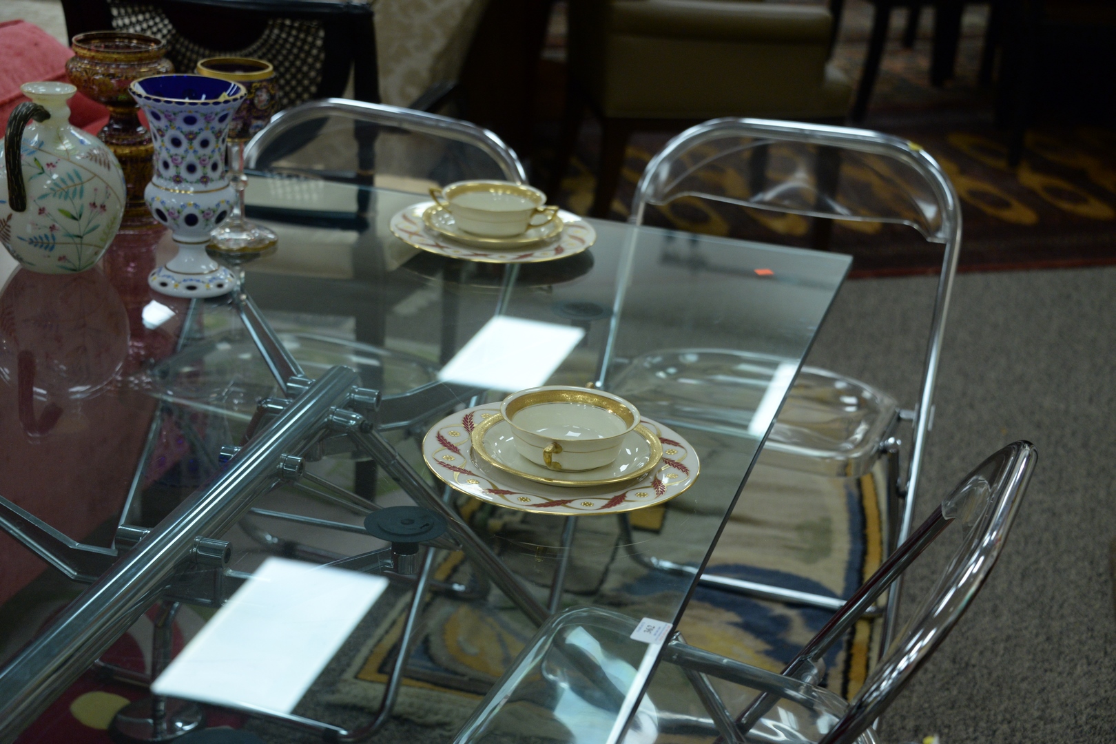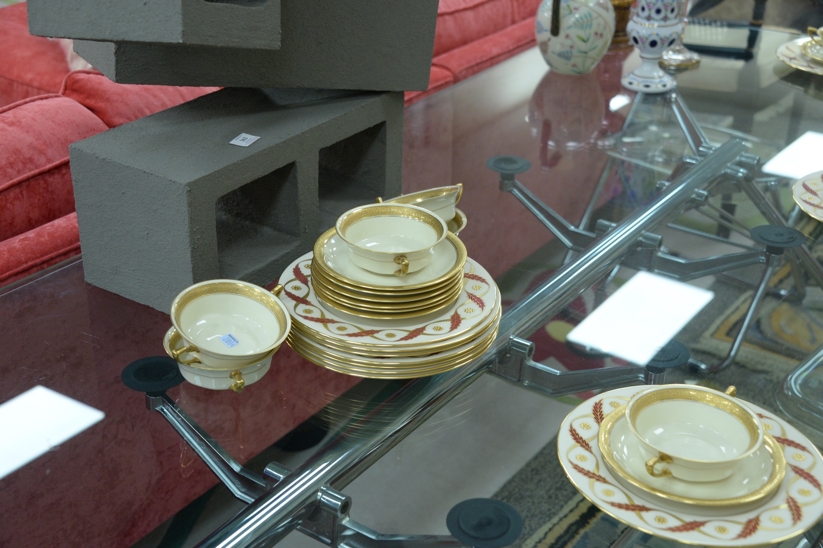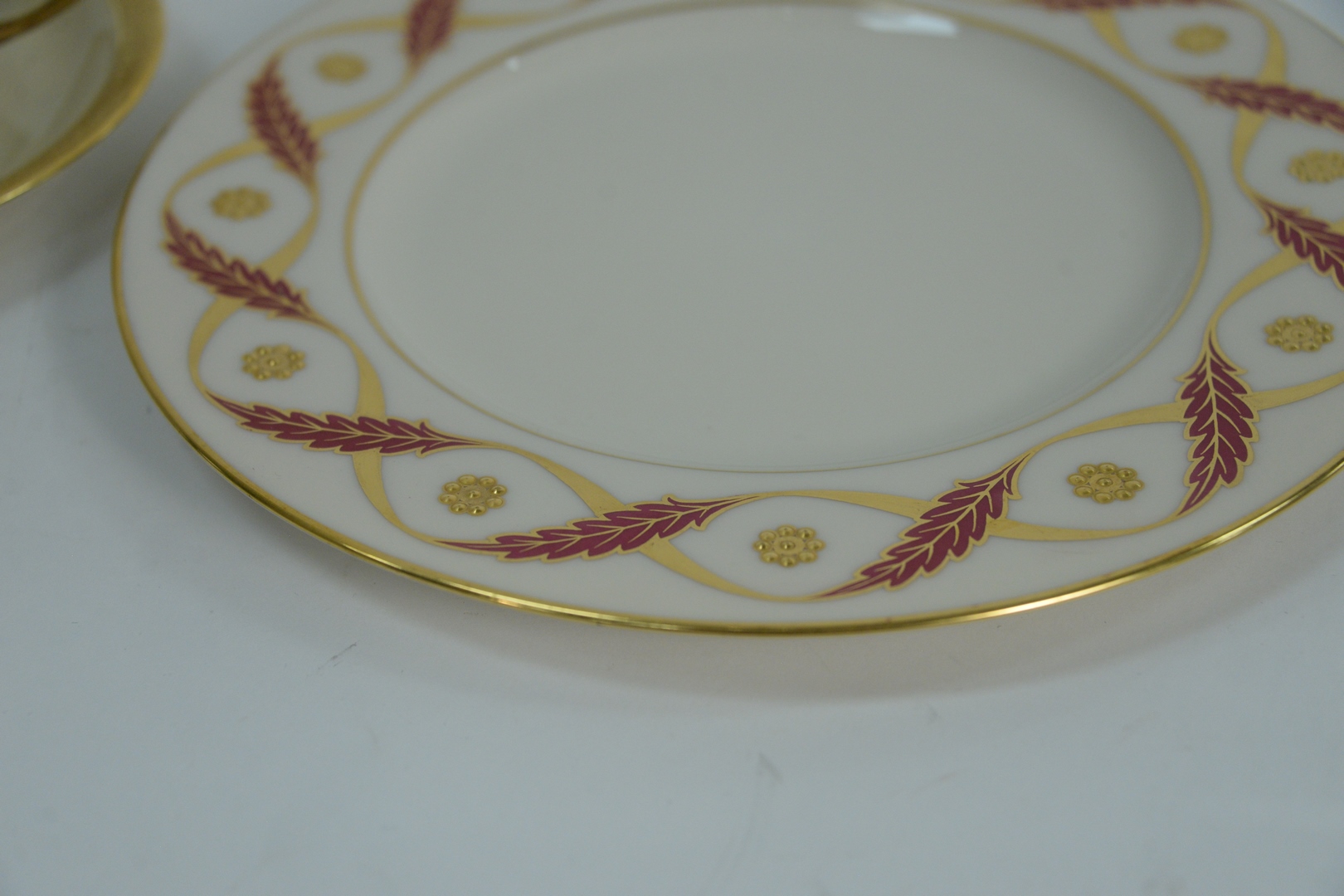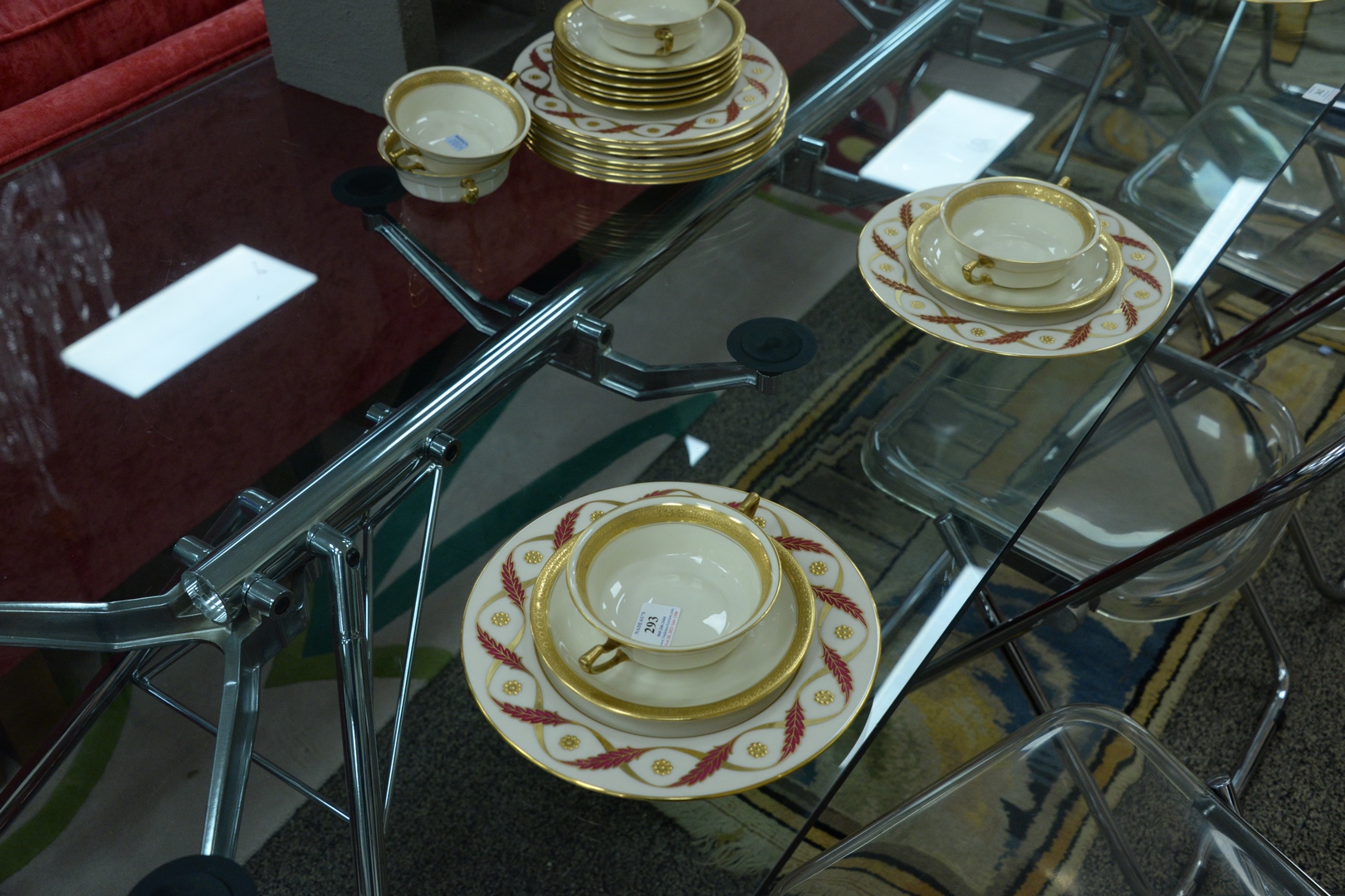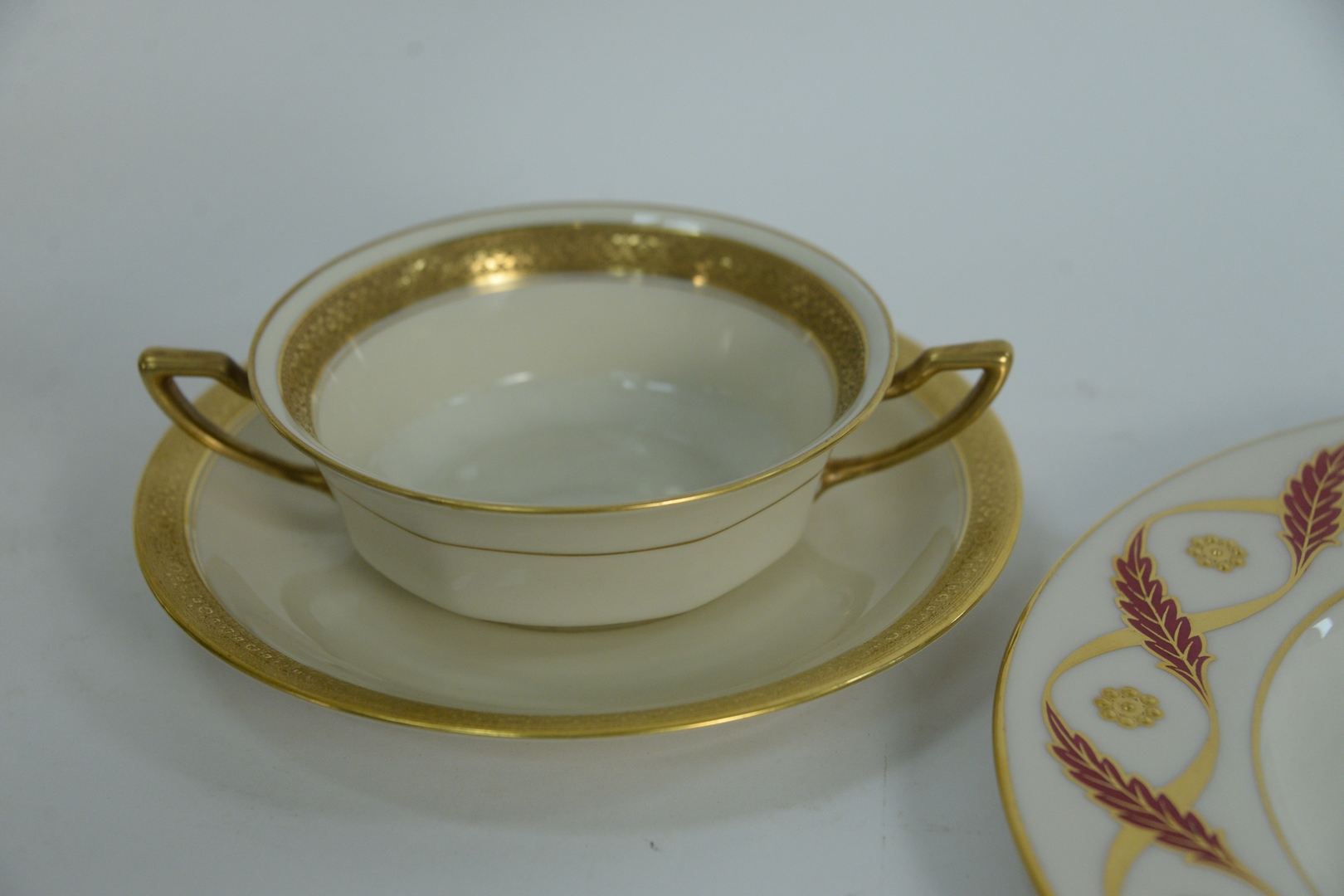 Lot 293: Thirty-three piece Group of Porcelain, to include a set of twelve plates with heavy gilt rosettes, Rosenthal Ivory Premier, ten soup bowls with underplates. Provenance: The Estate of Alina Roisen, Park Avenue, New York.