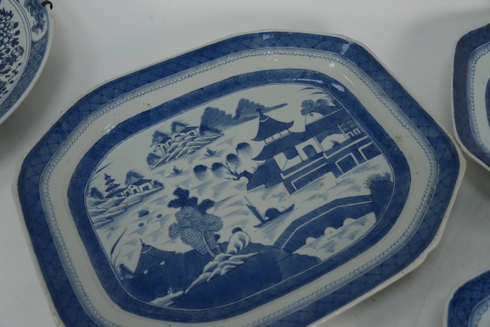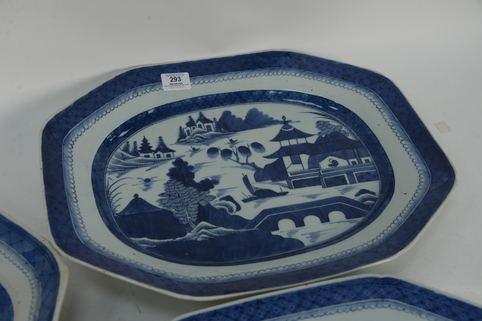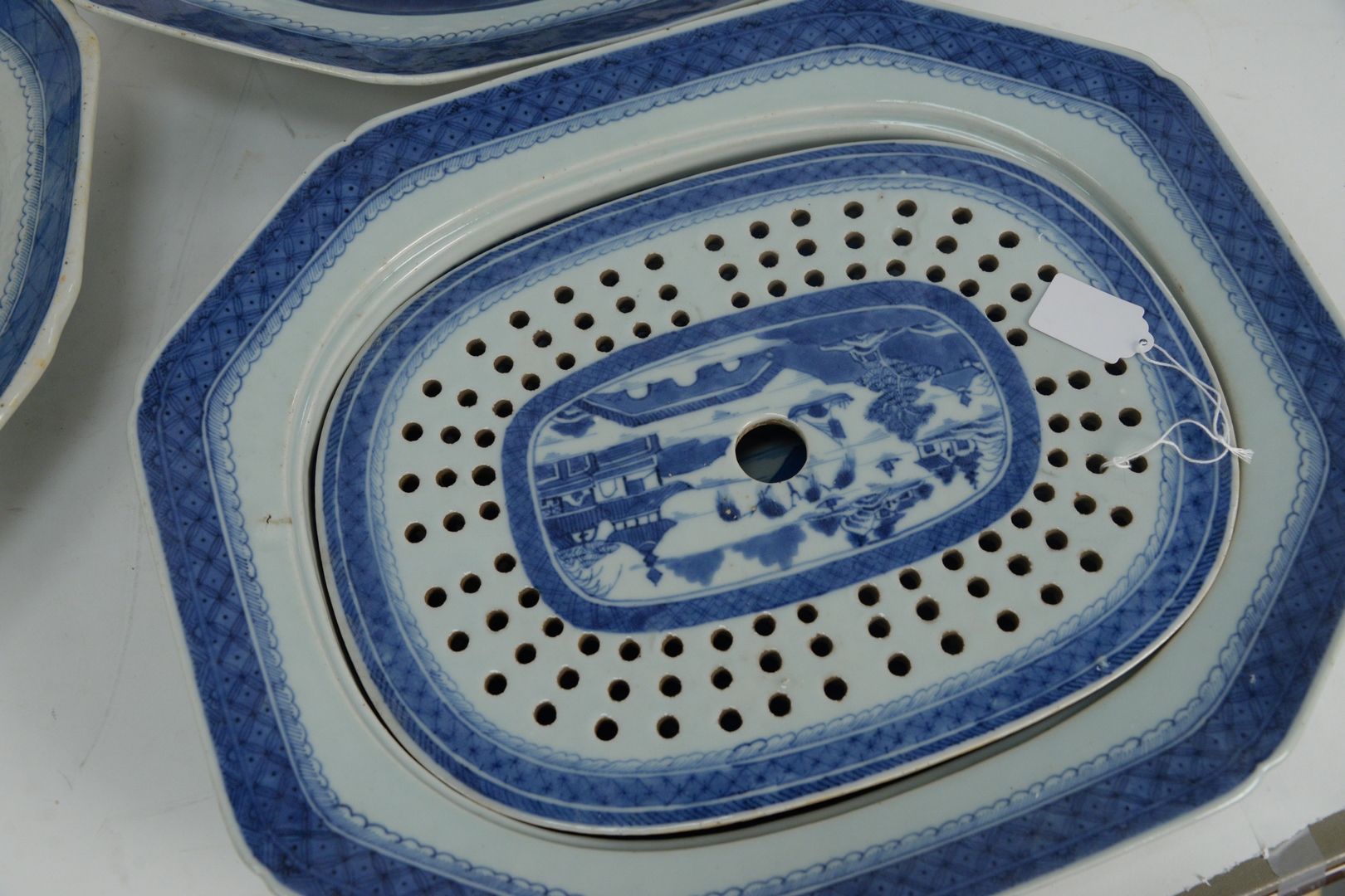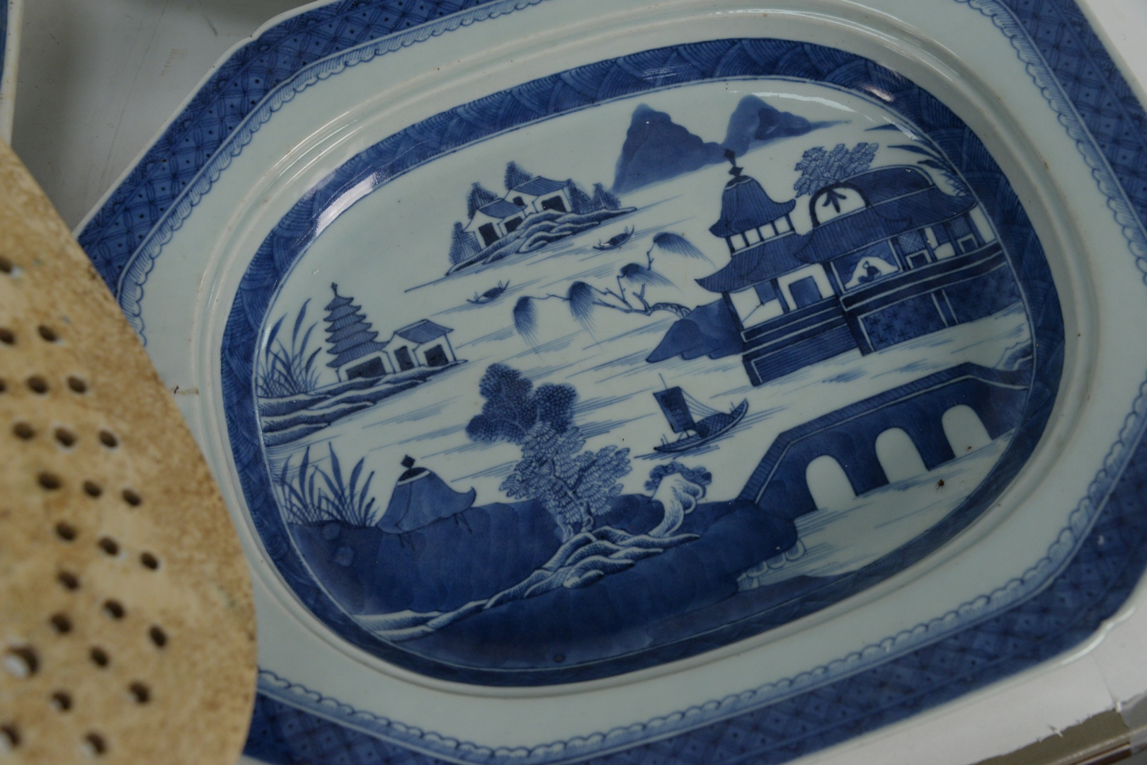 Three Canton Large Platters, one with ill fitting strainer/liner, largest 16 x 20. Provenance: From a Newport, Rhode Island historic home, in the same family since 1761.