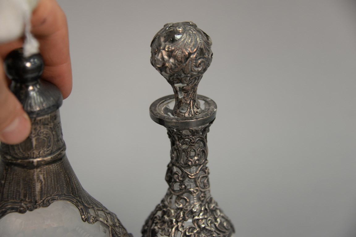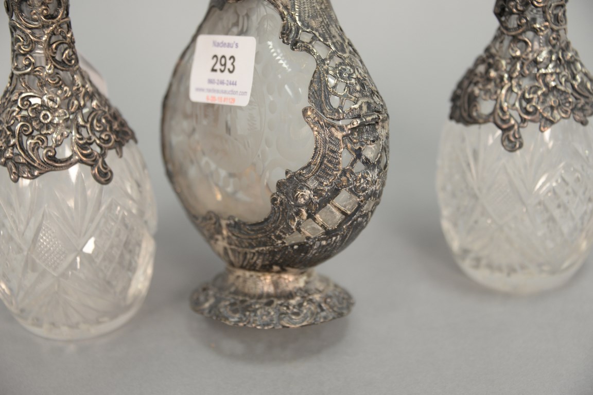 Three crystal silver overlaid bottles with stoppers. average ht. 8 1/2 in.